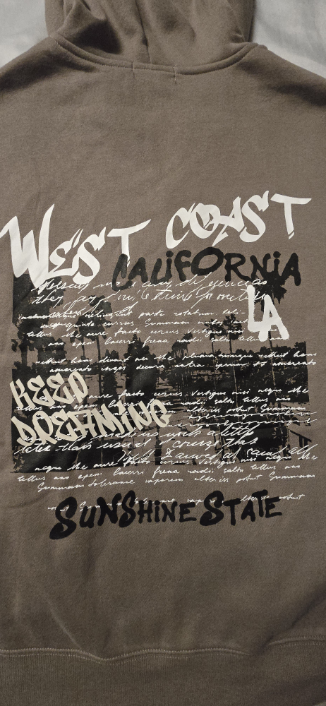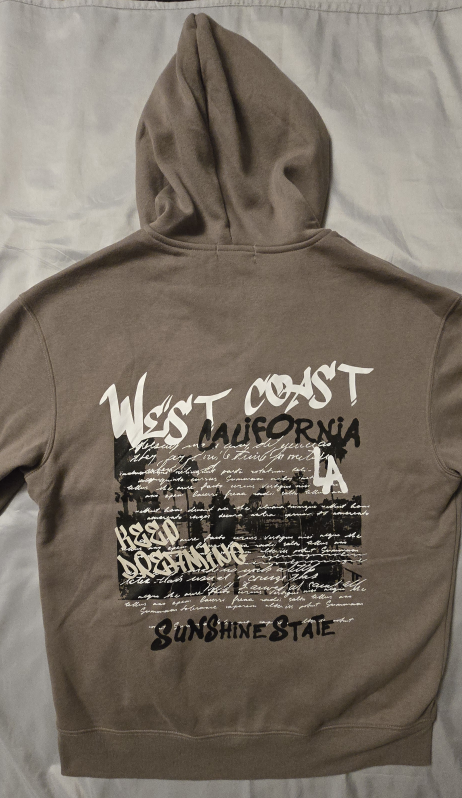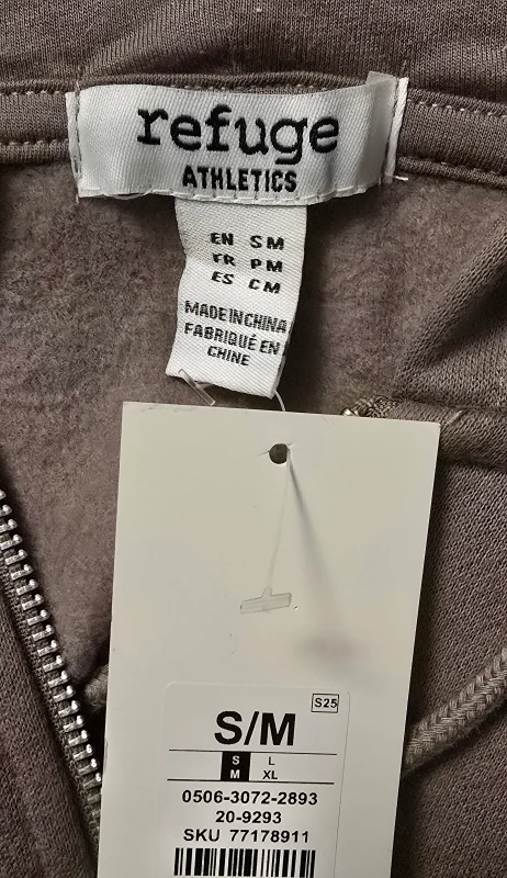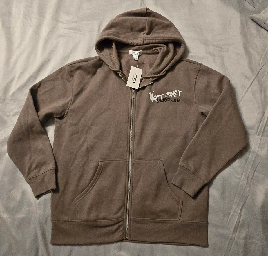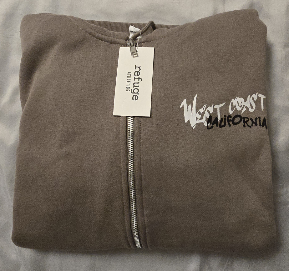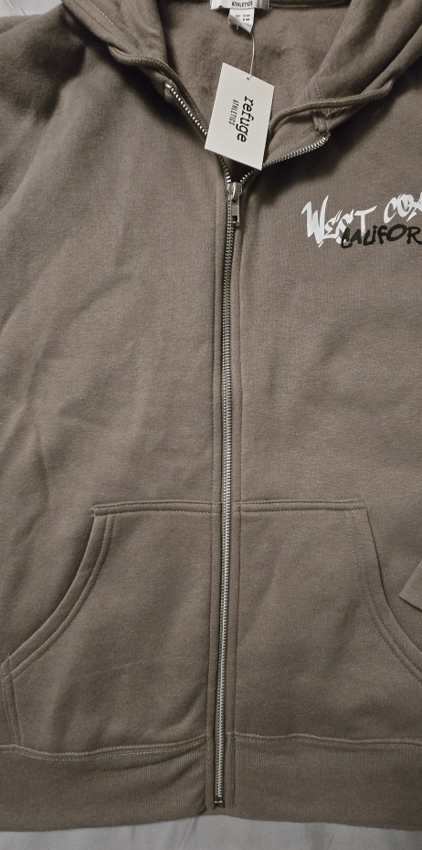 I'm selling a brand new Refuge Athletics zip-up hoodie in a size small/medium! It fits more like a womens medium. It's a nice neutral beige colour with a West Coast California design on the back and front!