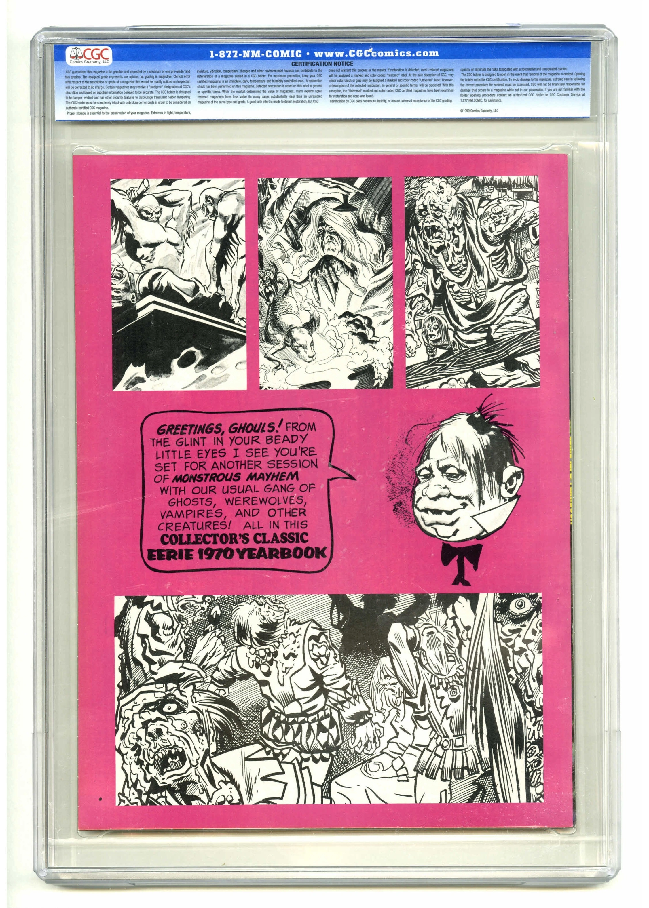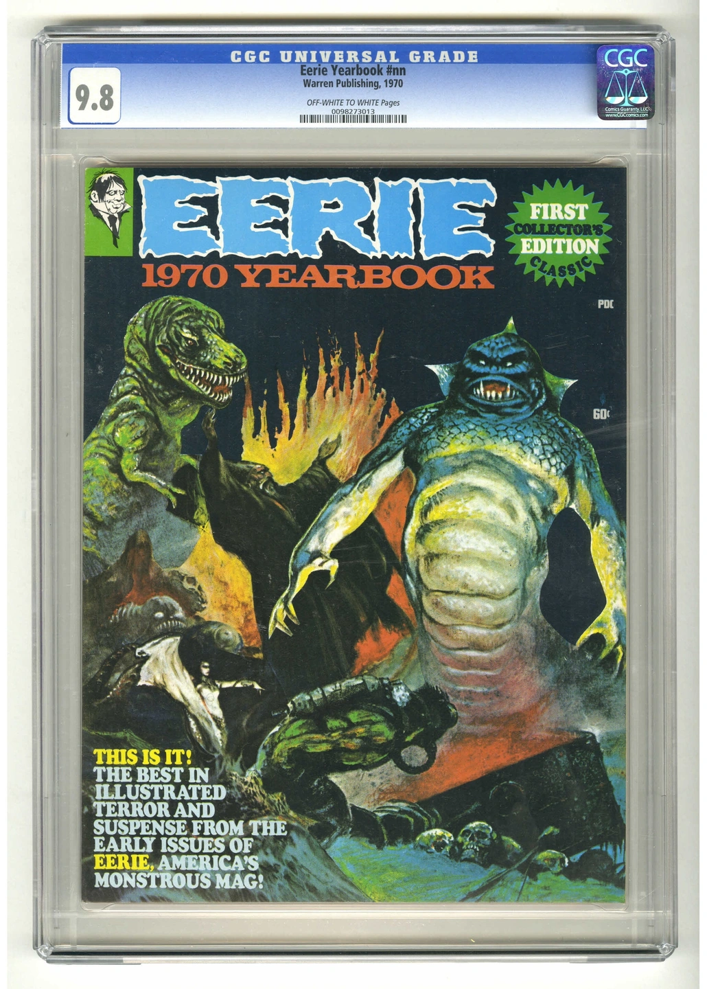 RARE EERIE 1970 Yearbook CGC 9.8 OW/W – Frazetta Ditko Davis E-Transfers Accepted Pick Up Anytime The first EERIE Yearbook (1970) from Warren Publishing, billed as the First Collector’s Edition Classic. Oversized magazine format featuring a powerhouse lineup: Frank Frazetta (cover montage), Steve Ditko, Jack Davis, Gene Colan, Angelo Torres, Tom Sutton, Dan Adkins, Rocke Mastroserio. Certification: CGC 9.8 with Off-White to White pages (museum-level presentation) Census: 6 in 9.8, none higher (top of the CGC scale) Format: Oversized Warren magazine (approx. 8.5" × 11") Condition: Clean slab; displays beautifully (If applicable) Image note: Photos shown are of another CGC 9.8 copy; actual images available on request. A true museum-grade Warren—square-bound yearbooks are notoriously tough in high grade. This sits at the top of census and is a centerpiece for advanced Warren and Bronze-Age horror collectors. frazetta eerie yearbook 1970 warren cgc 9.8 ow/w steve ditko jack davis gene colan angelo torres tom sutton dan adkins rocke mastroserio bronze age horror magazine museum grade investment $2,357 CAD / $1,633 USD