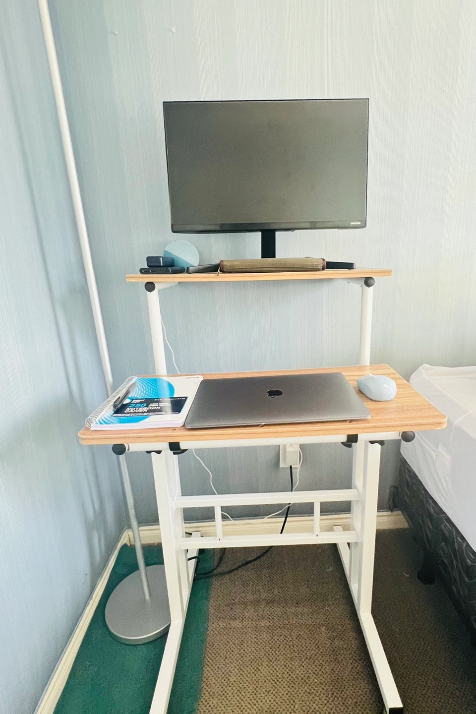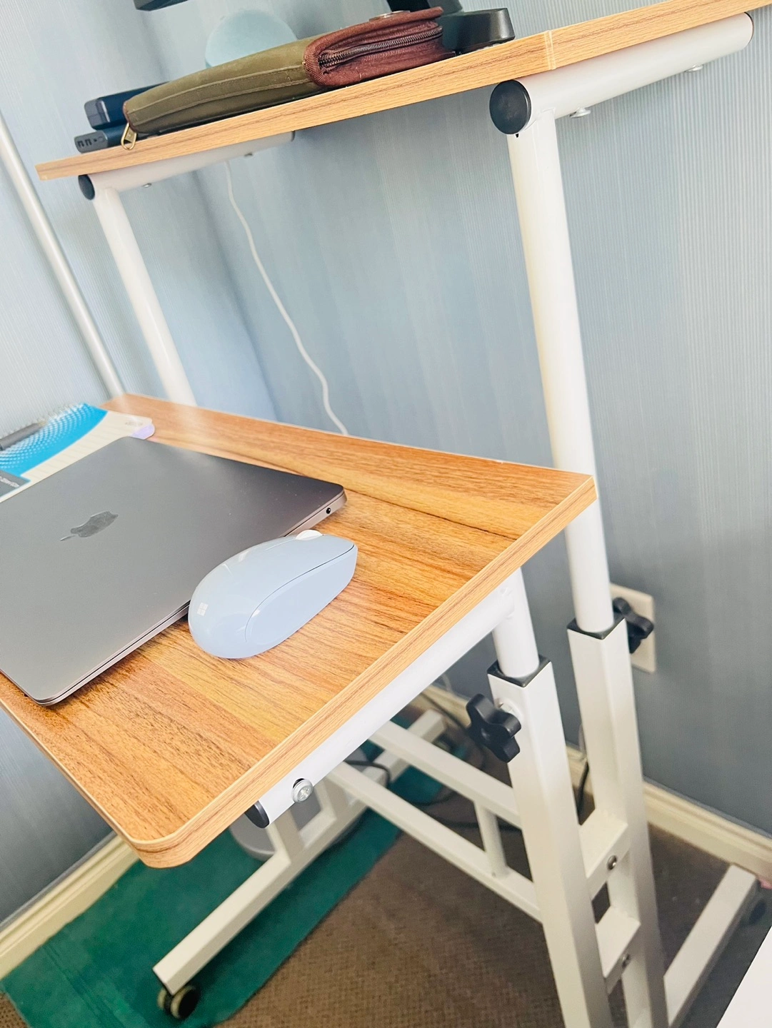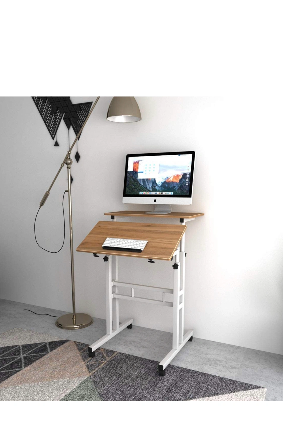 Less than 6months old, glossy finish wood desk panel. Desk frame is heavy-duty and powder-coated metal materials, with stability and durability 2 spacious platforms, lock knob on each side easily enable quick changes in height. You could adjust them at different or the same height, the lower board could be titled and edge stopper prevent items from slipping.