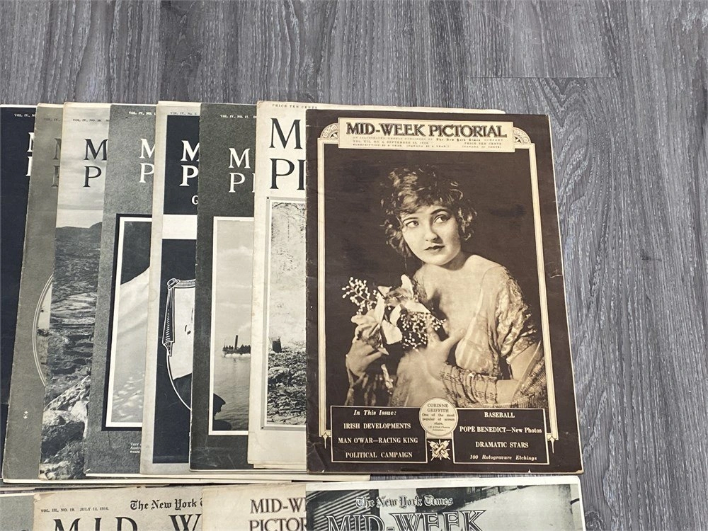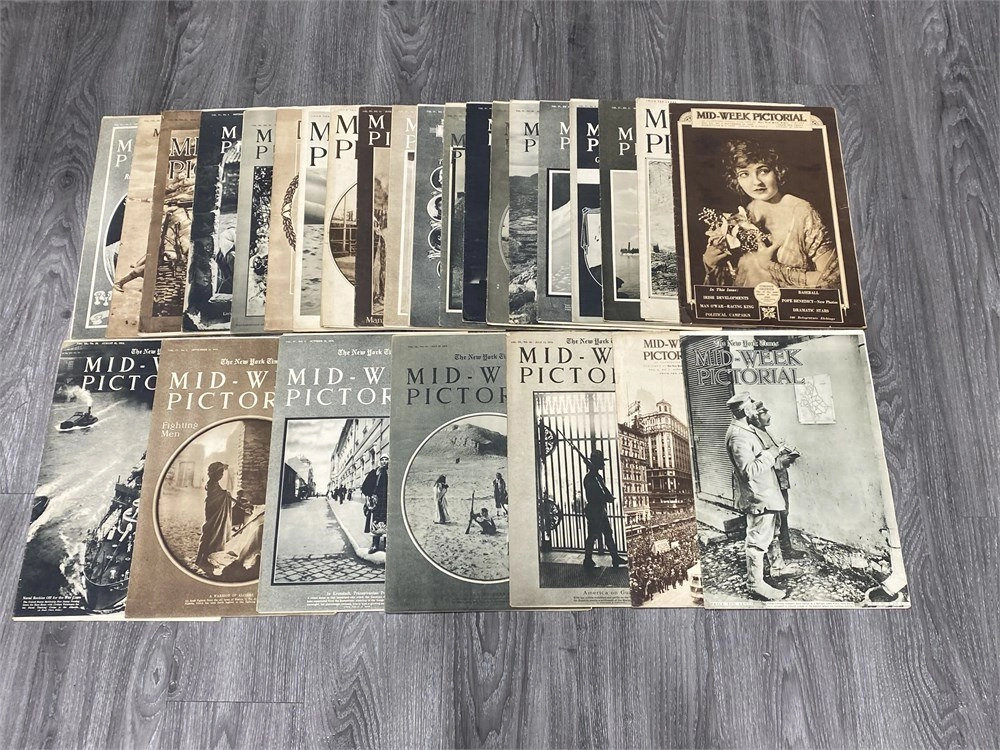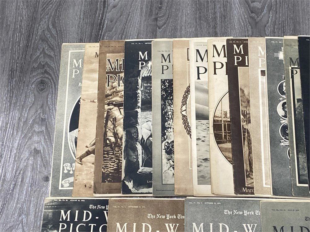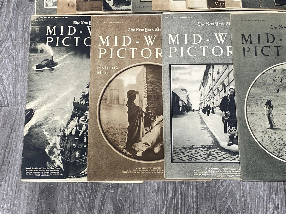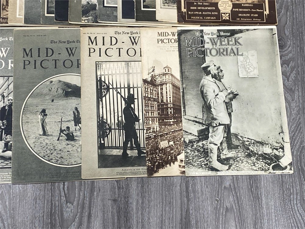 RARE 1914–1918 NY Times Mid-Week Pictorial – 27 Issues (WWI Era) E-Transfers Accepted Pick Up Anytime An extraordinary lot of 27 original issues of The New York Times Mid-Week Pictorial, covering the First World War era. These large-format illustrated supplements documented the conflict in powerful photography, maps, and features that shaped public perception of WWI. Inventory Breakdown (27 Issues) Aug 19, 1914 – Naval Rookies Off for the War Game (early U.S. mobilization) Sept 27, 1916 – Fighting Men cover (A Warrior of Algiers) Oct 18, 1916 – Eastern Europe feature (Kronstadt, Transylvania) July 12, 1916 – Desert Campaign issue (soldiers in the Middle East) 1916–1917 – Multiple trench warfare editions with bombardments, aerial views, and artillery spreads 1916–1917 – Naval coverage including destroyers, submarines, and Atlantic convoys 1917 – America on Guard (iconic silhouette of U.S. soldier) 1917–1918 – Allied advances, prisoners of war, Red Cross, home front contributions 1917–1918 – Maps and diagrams of European campaigns 1918 – Corinne Griffith cultural/arts cover issue (Full run of 27 issues spans 1914–1918; above list highlights key covers and themes. All 27 issues included in the lot.) Condition Very Good / Fine Condition overall Covers strong with vibrant imagery Light toning and minor edge wear consistent with age Carefully stored flat — suitable for collectors, researchers, or framing individual pages Why This Set Matters Authentic WWI-era journalism & photography from The New York Times Scarce survival rate — intact runs of this size rarely appear on the market Ideal for historians, museums, or serious collectors of ephemera mid-week pictorial, world war 1 newspapers, ww1 ephemera, ny times pictorial, antique newspapers, early 20th century magazines, first world war photography, trench warfare history, allied propaganda, vintage journalism, rare newspapers, corinne griffith cover, 1914 1915 1916 1917 1918 $1,200 CAD