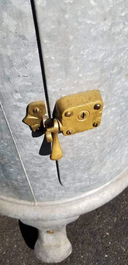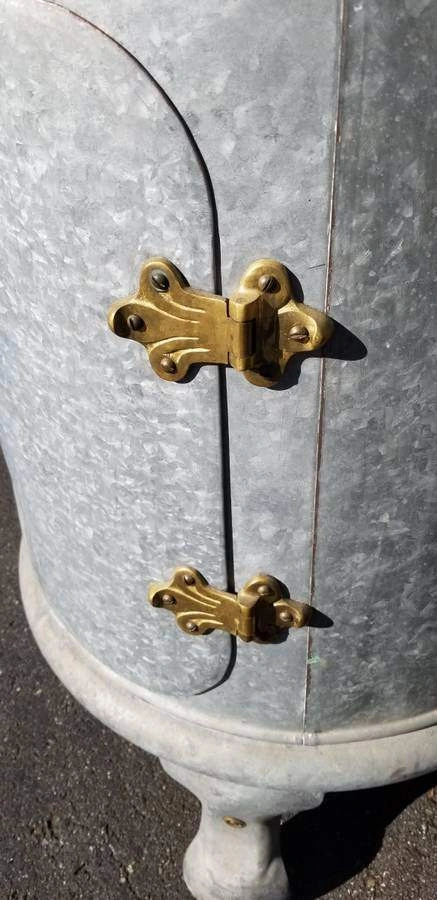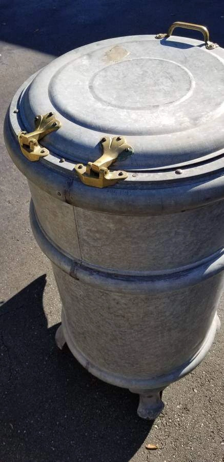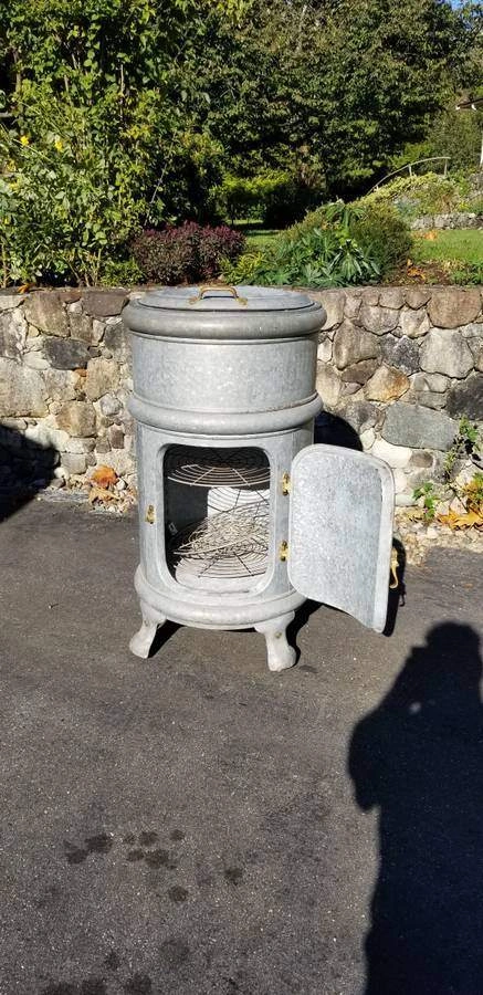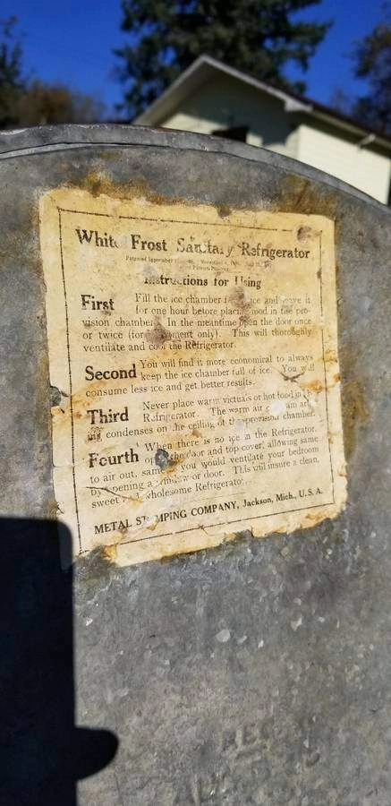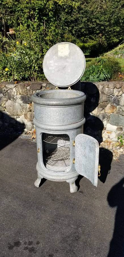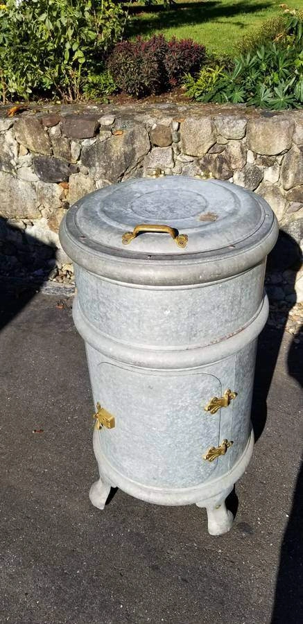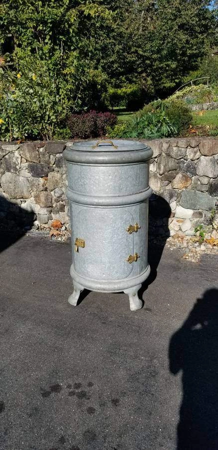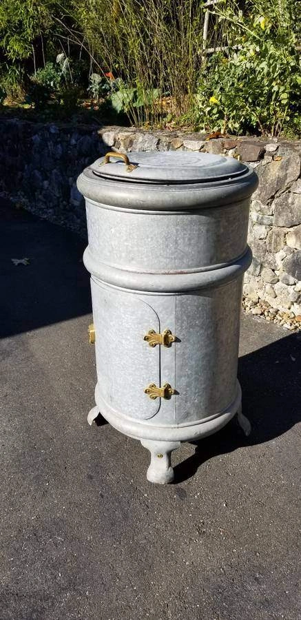 RARE 1906 White Frost Sanitary Refrigerator – Original Label & Brass Hardware E-Transfers Accepted Pick Up Anytime Step back in time with this exceptionally rare White Frost Sanitary Refrigerator, manufactured by the Metal Stamping Company of Jackson, Michigan in the early 1900s. Unlike the more common wooden ice boxes of the era, this innovative galvanized metal design was marketed as “sanitary and odor-free”, making it a pioneer in modern food preservation. This round barrel-style refrigerator sits proudly on four cast feet, with original solid brass hardware including latches and lock. The hinged lid retains its intact paper instruction label (over 115 years old!), and the interior still contains the original wire rack and ice grate. These early refrigerators were advertised as consuming less ice while keeping food fresh and safe, and few survive today in this condition. Highlights: Authentic 1906 White Frost Sanitary Refrigerator (Patent Era) Durable galvanized metal construction with barrel form Complete with original brass hardware & fittings Rare factory instruction label under lid (legible and intact) Original interior rack and grate included Strong display presence for kitchen history collectors, museums, or vintage décor A genuine piece of early 20th century American ingenuity, this White Frost refrigerator is both a conversation piece and an investment collectible. Perfect for farmhouse kitchens, antique appliance collections, or high-end display. This is a true museum-quality survivor — examples with intact labels and complete hardware rarely come to market. antique ice box, sanitary refrigerator, white frost, galvanized metal fridge, brass hardware, 1906 antique, vintage kitchen collectible, Jackson Michigan, farmhouse décor, primitive antique, round ice chest, industrial chic, metal icebox Price: $1,295 CAD