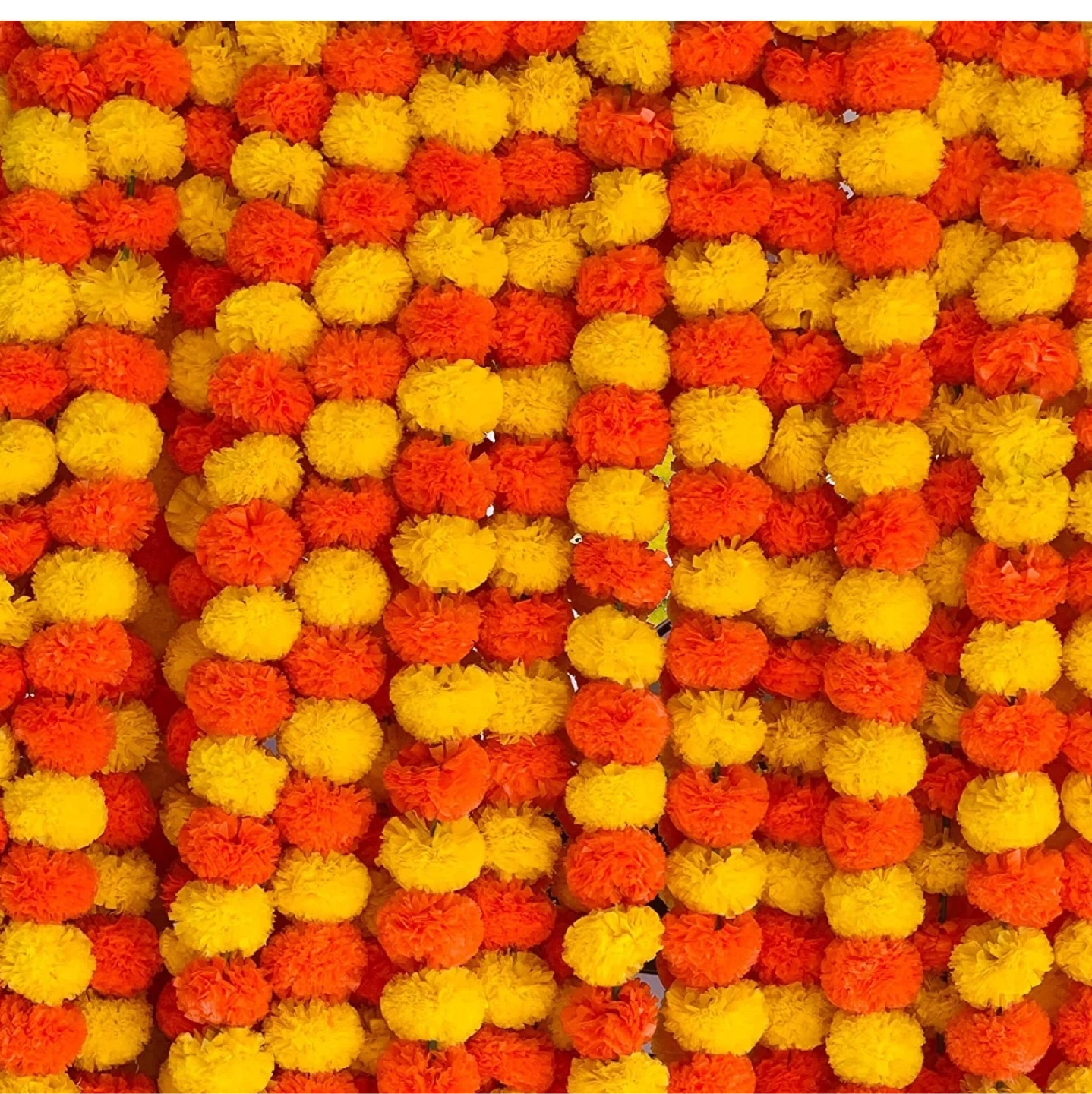 Add a vibrant touch to your home or event with these artificial marigold flower garlands! Perfect for decorations, these garlands come in a variety of colours, including yellow, orange, red, white, and pink. They're a great way to bring a festive and colourful atmosphere to any space