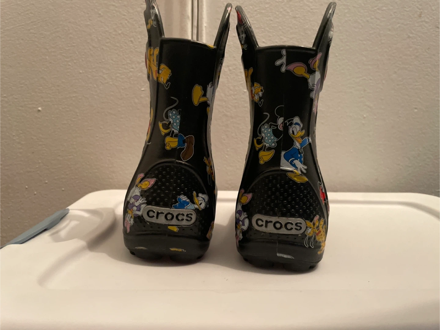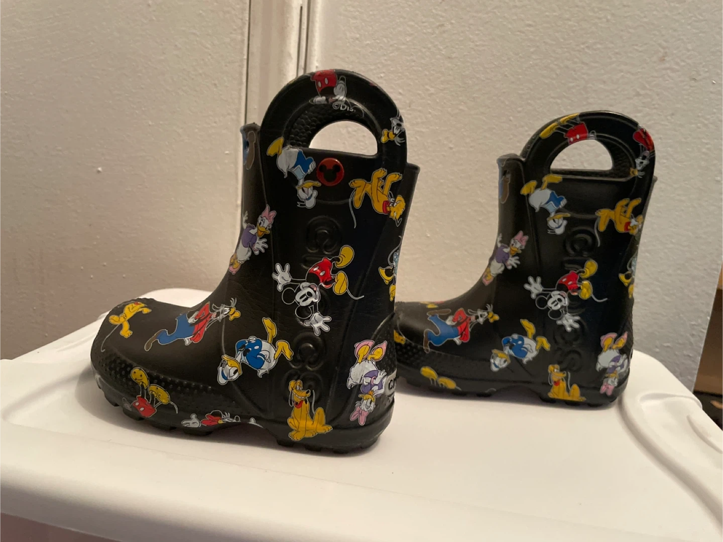 These are Crocs rain boots with a fun Disney print! They're perfect for keeping little feet dry on rainy days. They have a black color with Disney characters all over. Size 7c