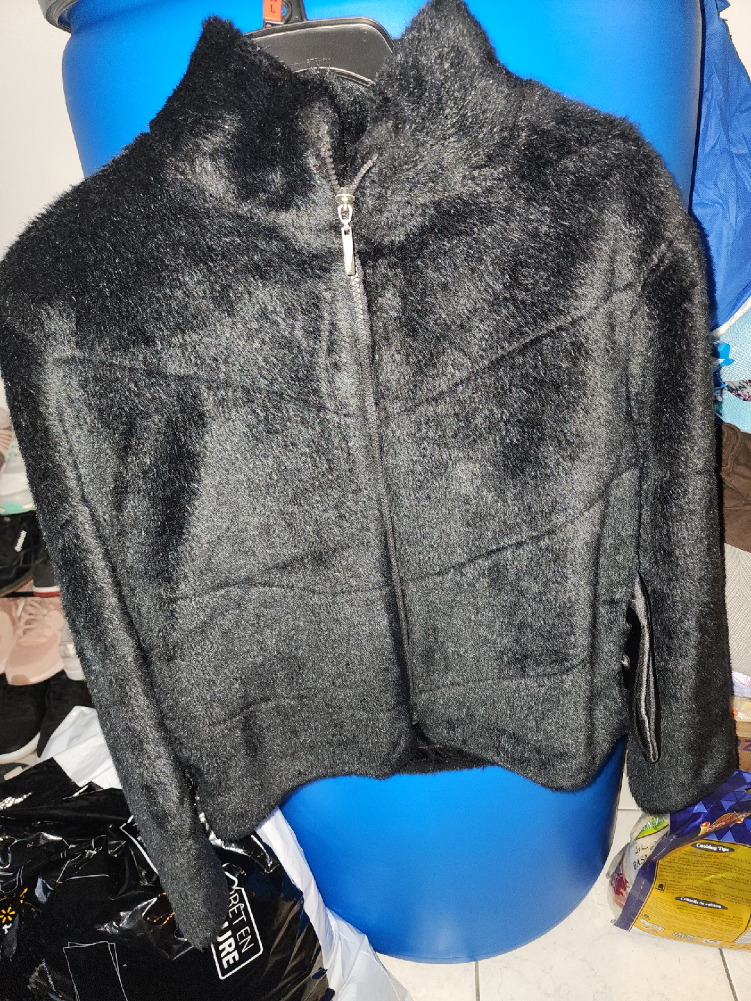 A cozy black faux fur jacket, perfect for adding a touch of warmth and style to your wardrobe! It features a zip-up front and a comfortable fit. This jacket is in great condition and ready for a new home