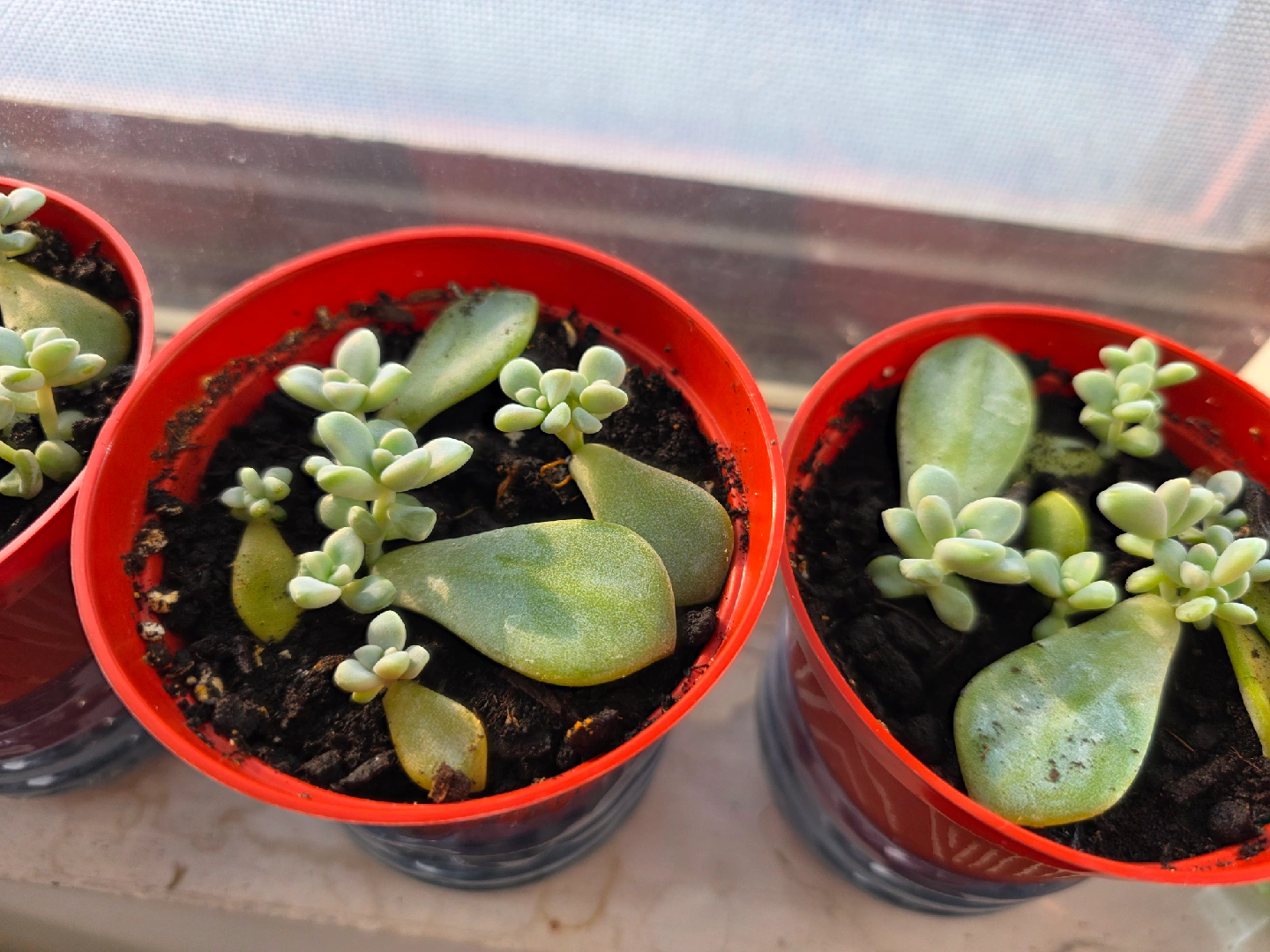 I have some small potted succulent plants for sale! They are in small red pots and are ready to brighten up your space. They're easy to care for and add a touch of green to any room. $2 each or all three for $5