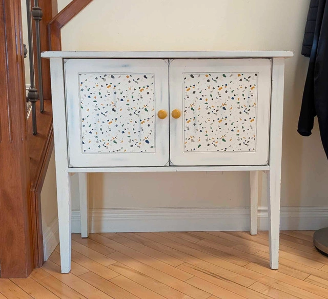 This charming cabinet is ready to add a touch of whimsy to your home! It features a durable construction, unique terrazzo-style door panels, and ample storage space with two interior shelves.