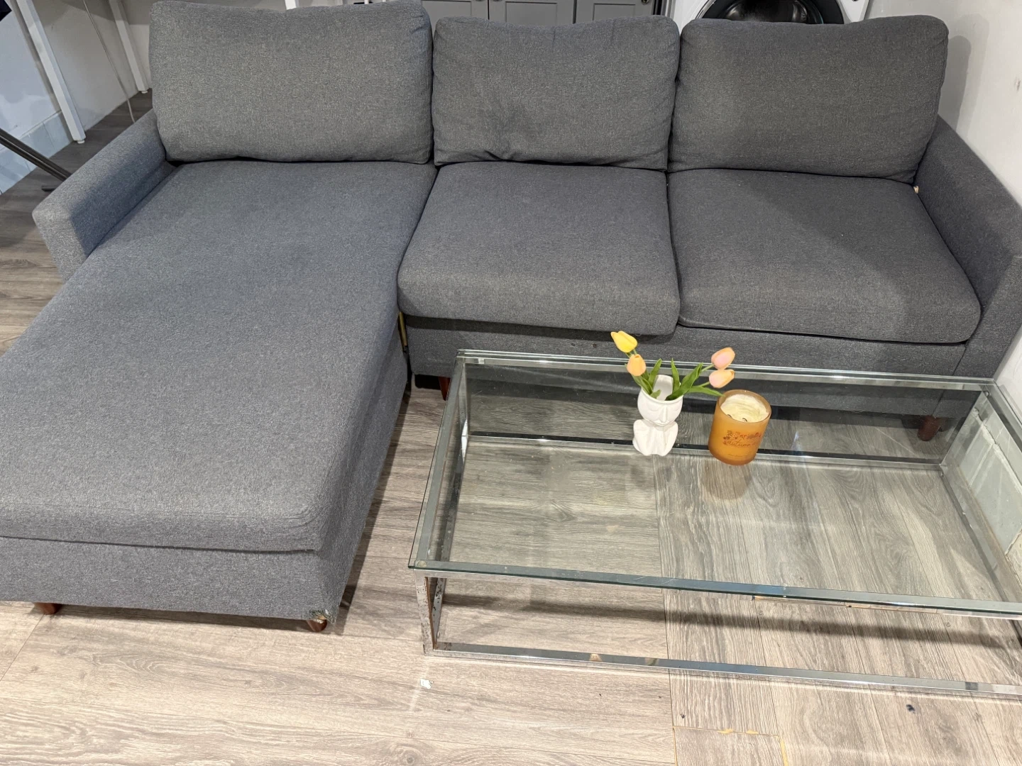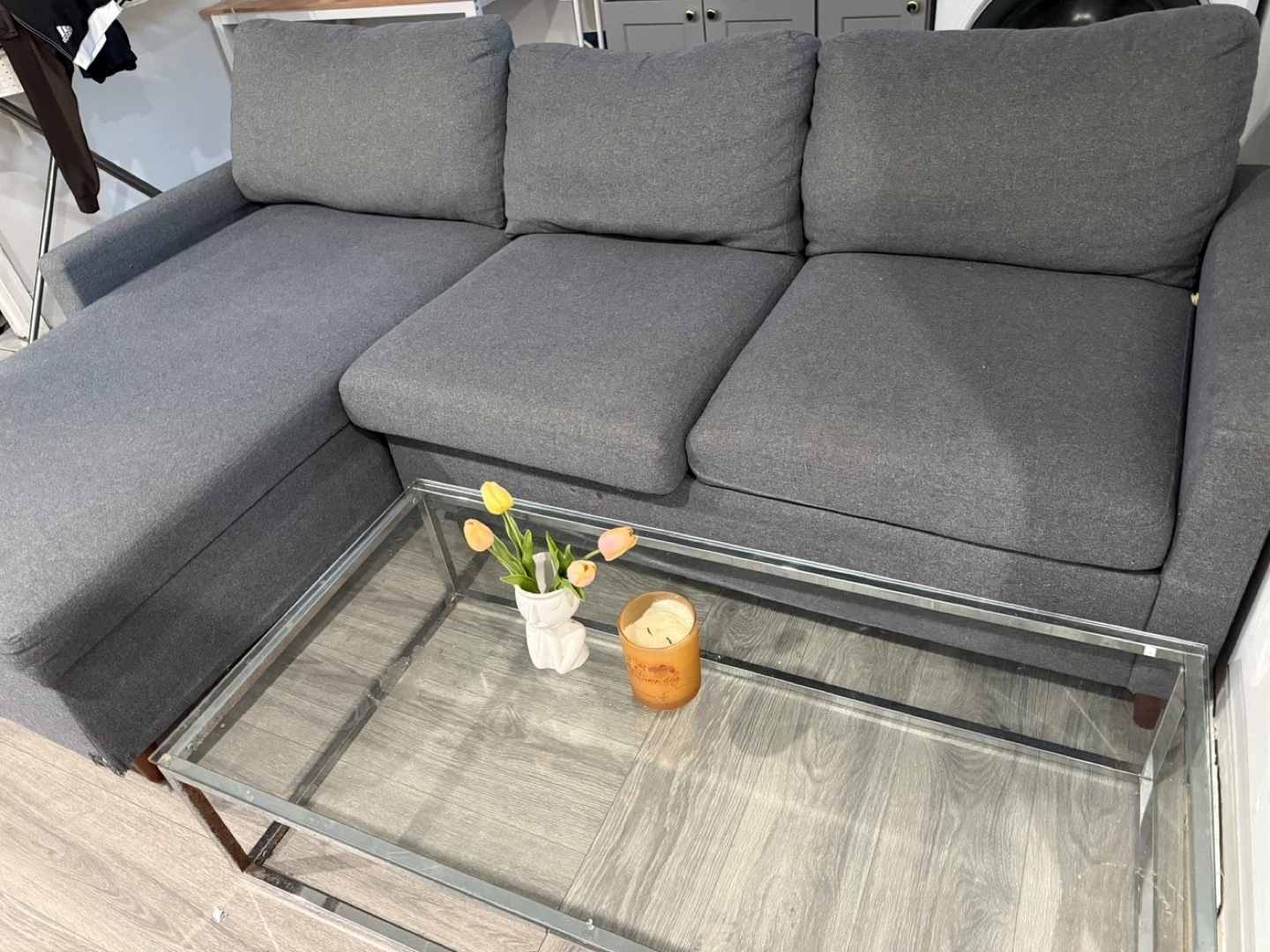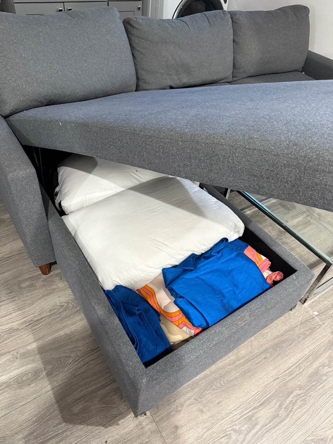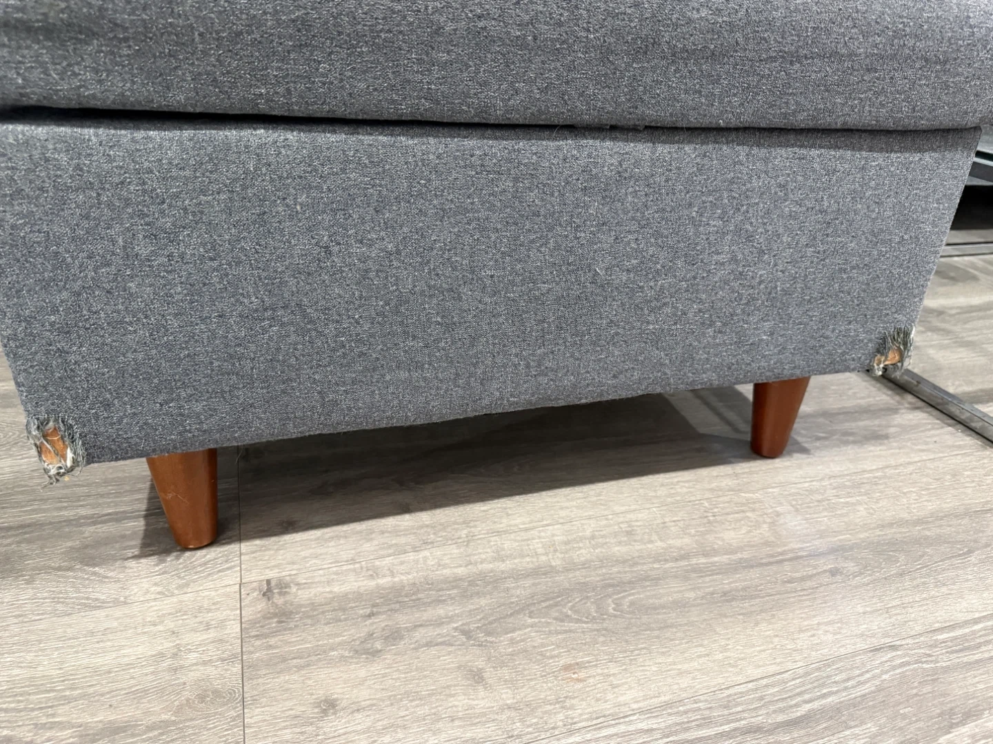 206Selling a comfortable gray sectional sofa with a chaise lounge. It has a storage compartment under one of the sections, perfect for storing blankets or pillows. There are some signs of wear on the legs, as shown in the pictures.