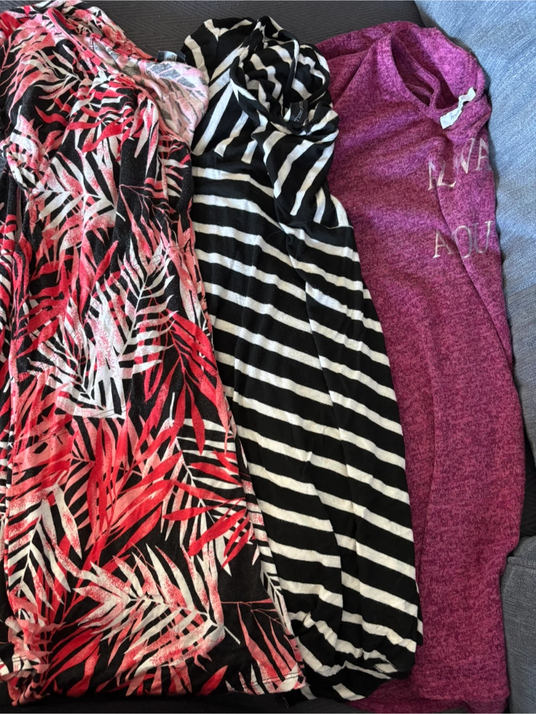 Selling a mixed lot of women's tops. The lot includes a black and red palm leaf print top, a black and white striped top, and a purple top. All are in great condition and ready for a new home!