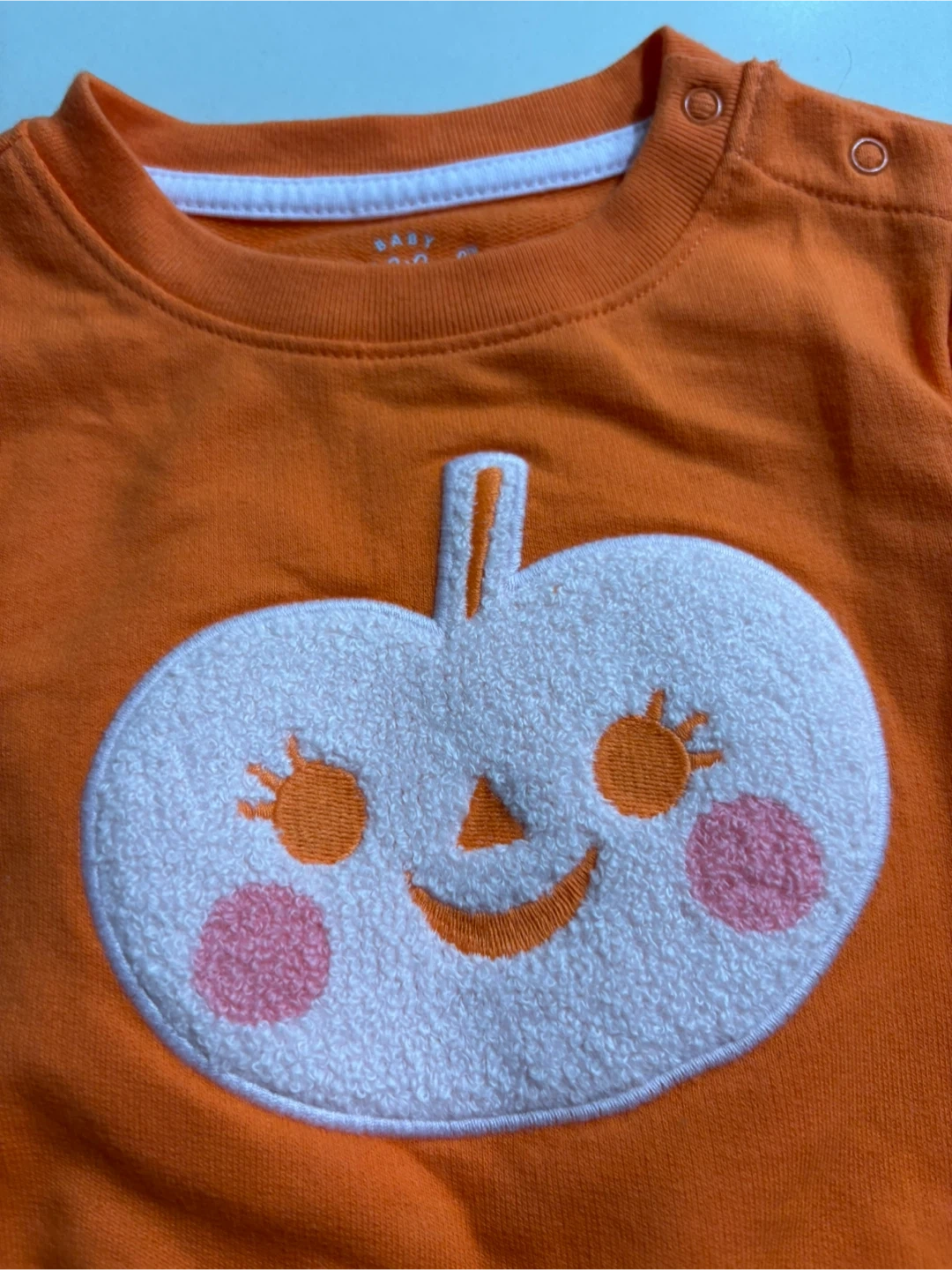 Like New. A cute orange sweatshirt for your little one! This Cat & Jack sweatshirt is a size 12M and features an adorable pumpkin design. It's made of 60% cotton and 40% recycled polyester, so it's soft and comfy for baby to wear. Perfect for fall!