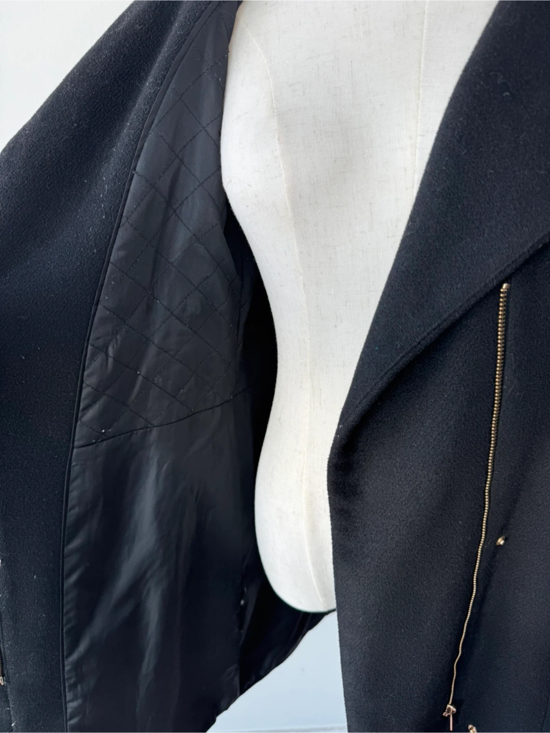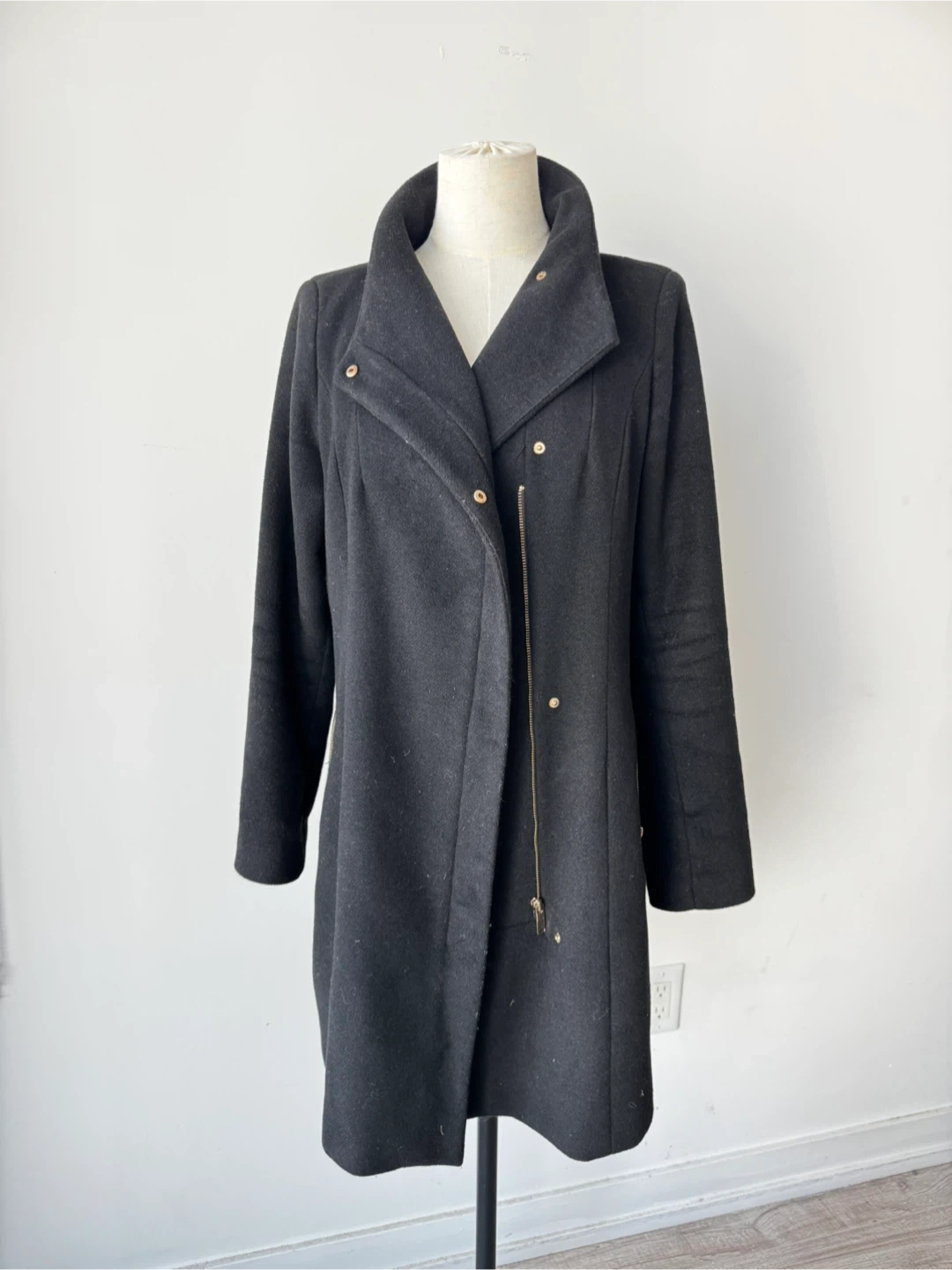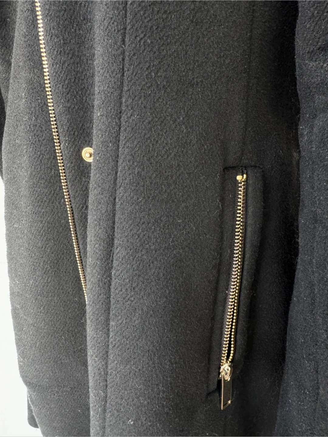 Selling a stylish black coat that's perfect for the cooler weather! It's a wool blend material and features a unique asymmetrical zipper design with gold accents. The interior is lined with a quilted pattern for extra warmth and comfort. It's in great condition and ready for a new home!