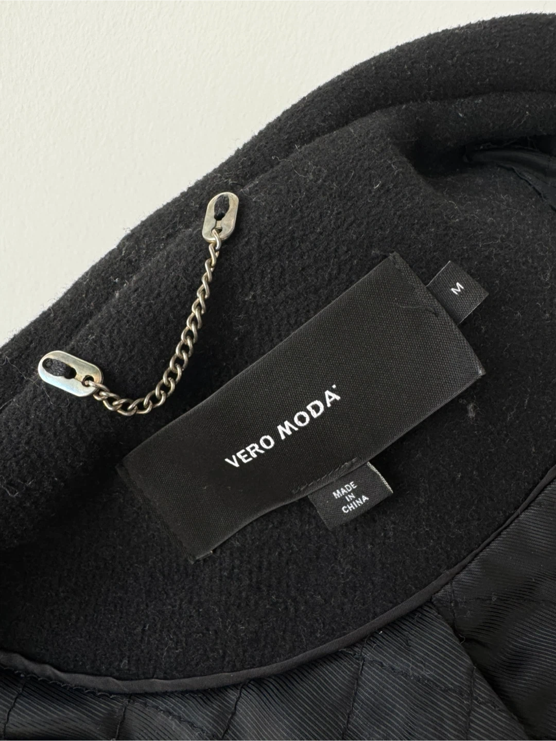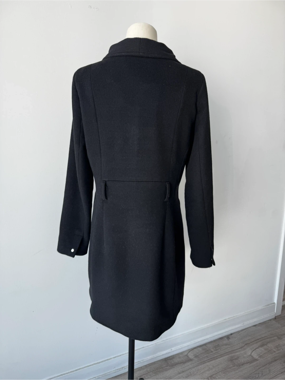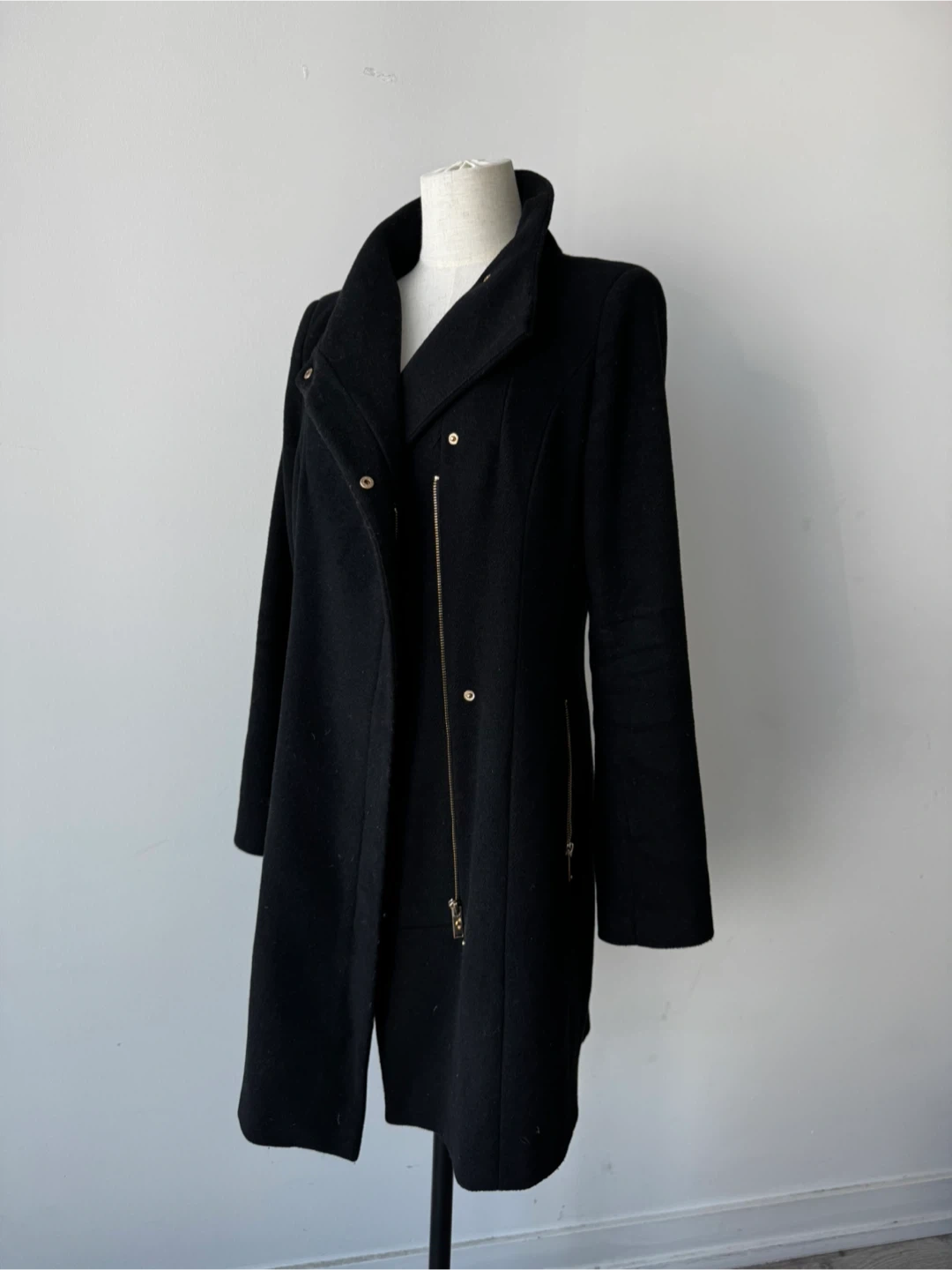 Selling a stylish black coat that's perfect for the cooler weather! It's a wool blend material and features a unique asymmetrical zipper design with gold accents. The interior is lined with a quilted pattern for extra warmth and comfort. It's in great condition and ready for a new home!
