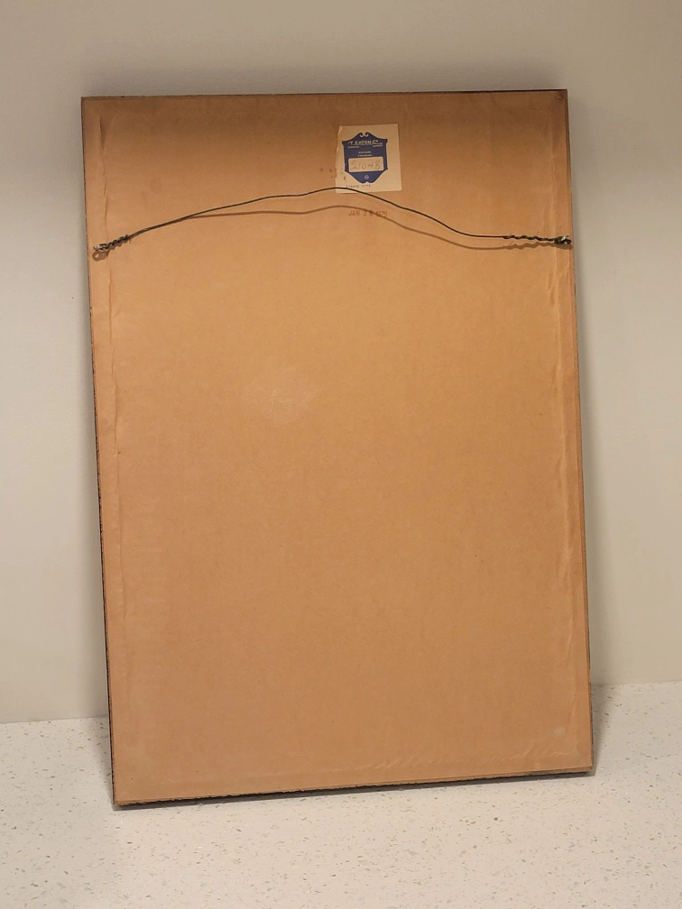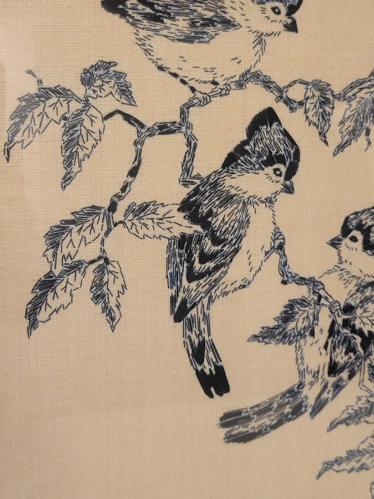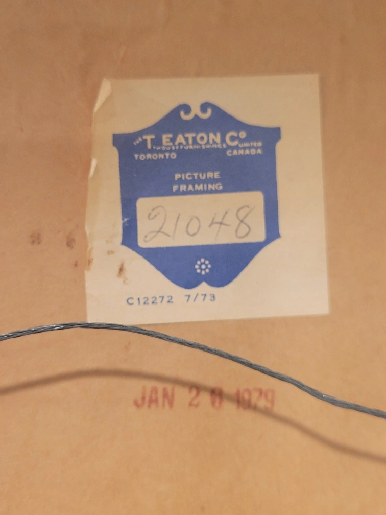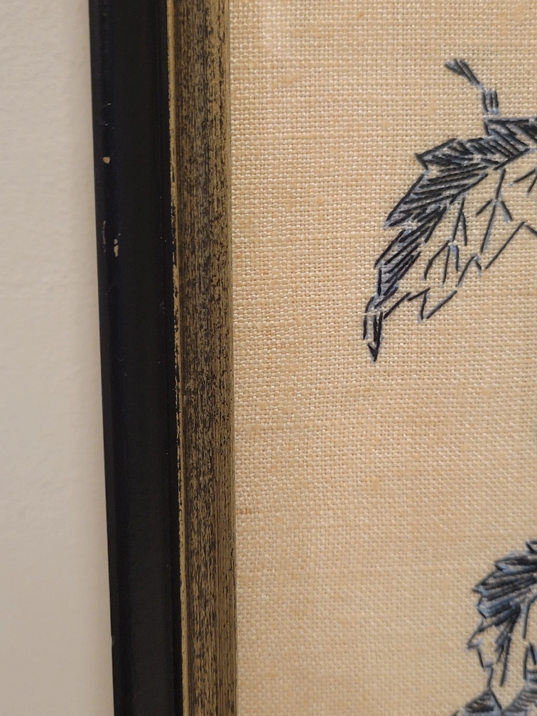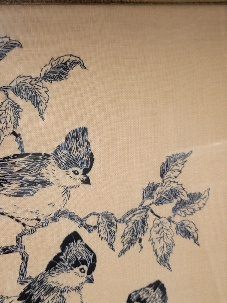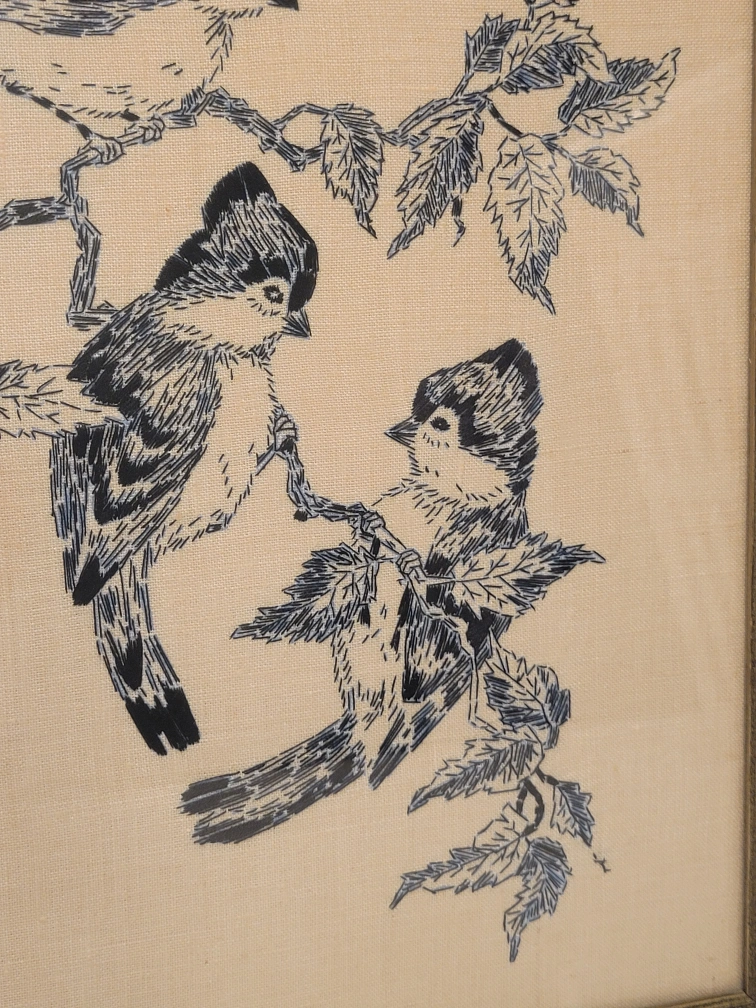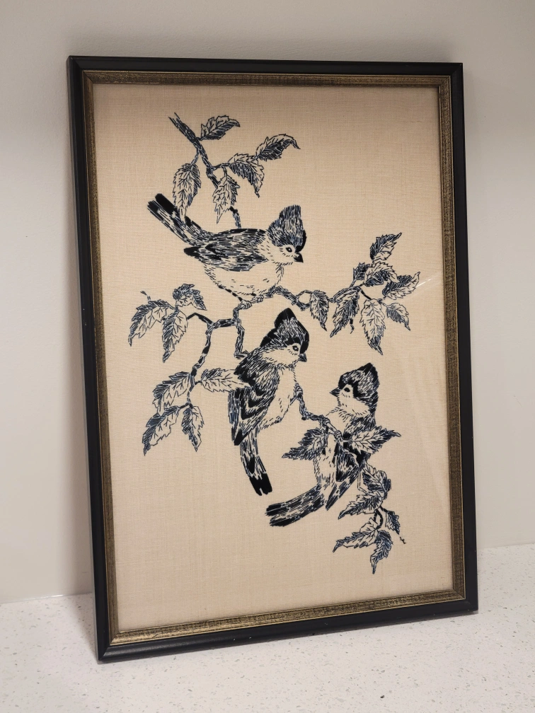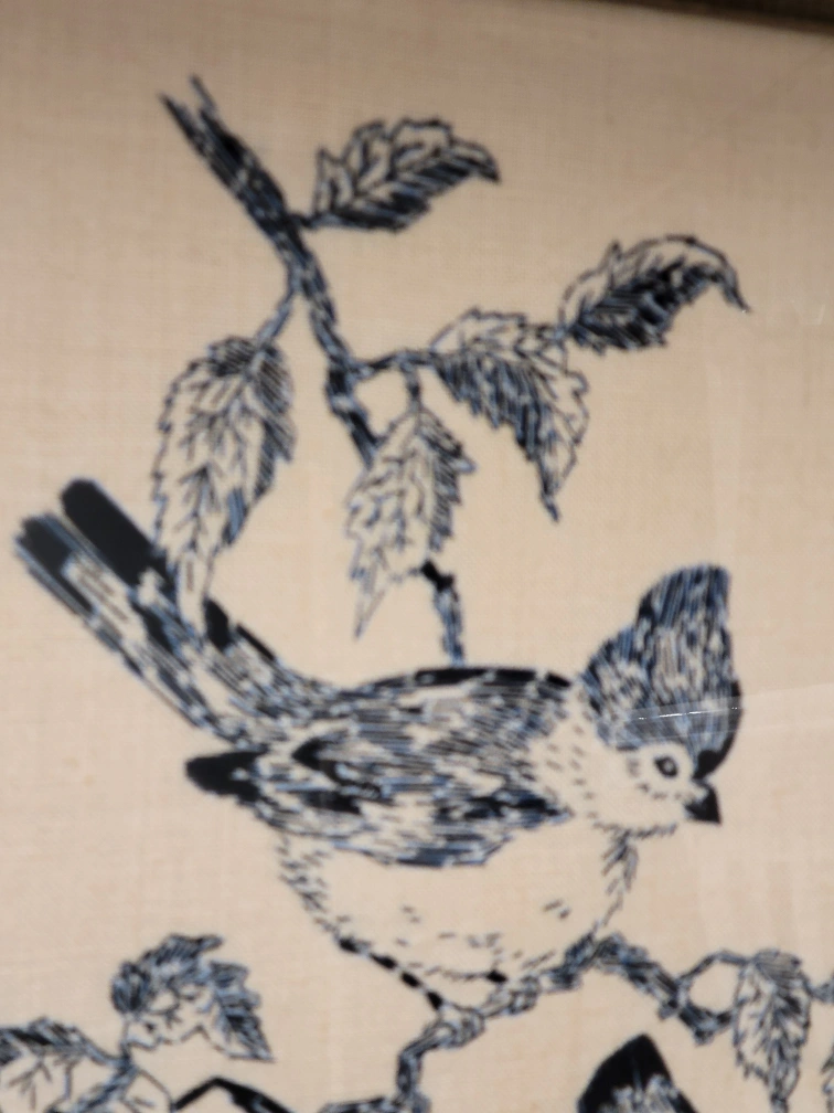 103This framed bird embroidery is a charming piece of textile art, showcasing three birds perched on a branch, rendered in blue thread against a neutral fabric background. Here are the details: * **Design**: Features three birds on a branch * **Material**: Embroidered on neutral fabric * **Frame**: Included * **Dimensions**: 20" H x 14" W 1979 18" x 13" Hanger on back T.Eaton Co Blue birds Frame gold and black wood Glass Beautiful sewing $60 Firm Fennell and Upper gage Hamilton Please click on my many ads for sale
