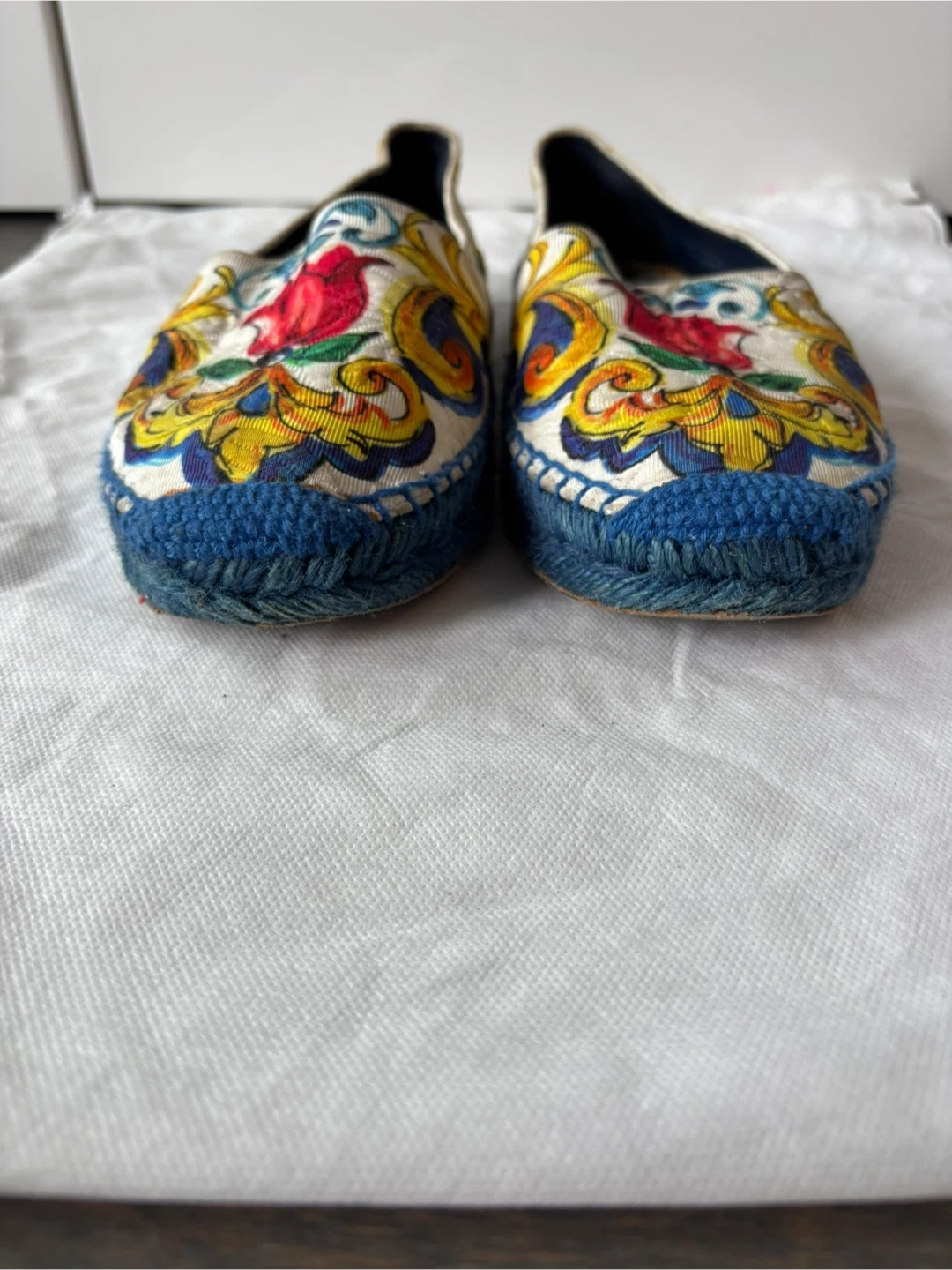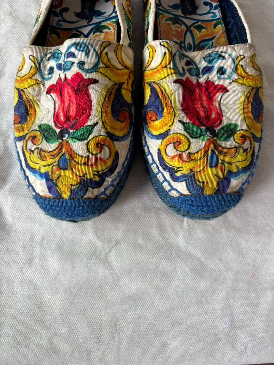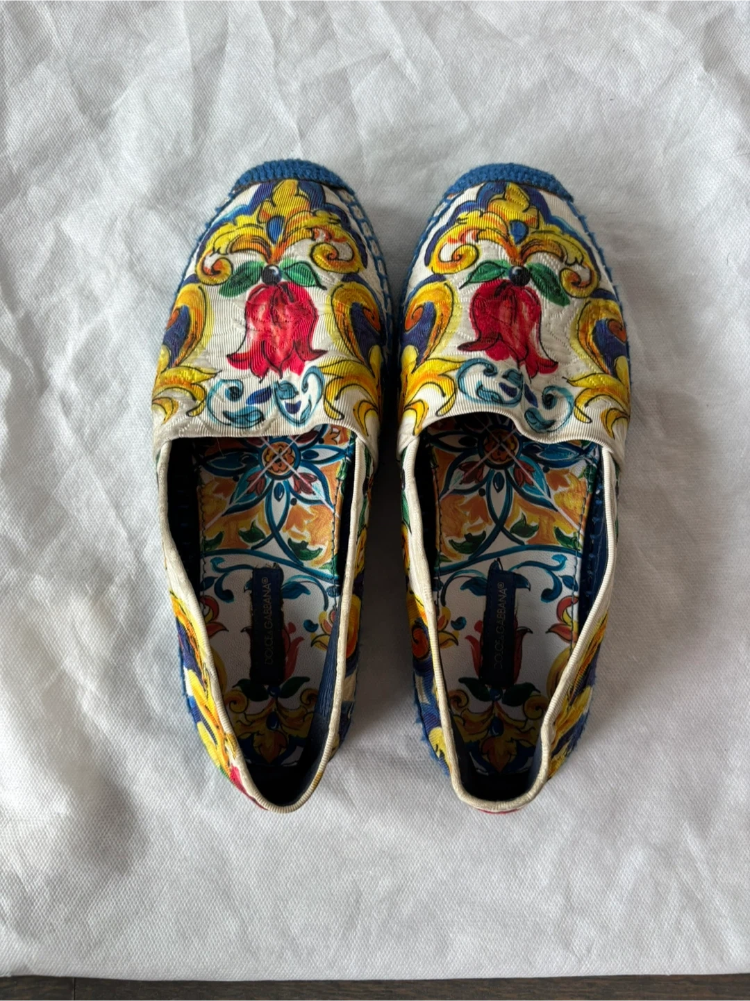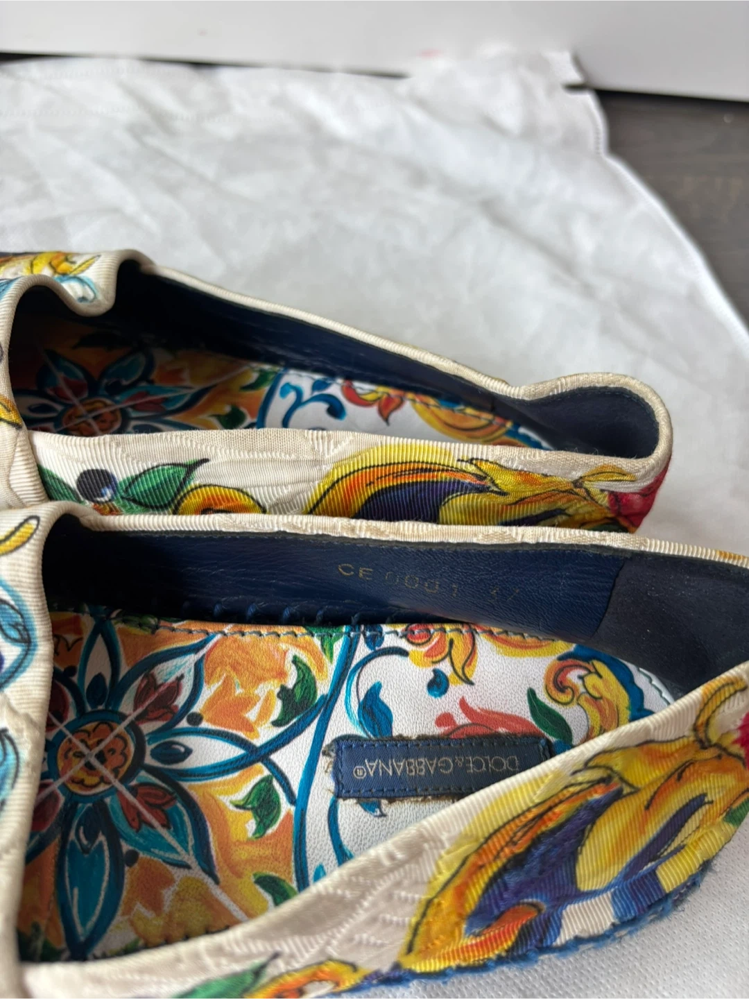 Elegant slip-on shoes with a vibrant floral pattern. Features blue, yellow, and red accents. Includes Dolce & Gabbana dust bag.