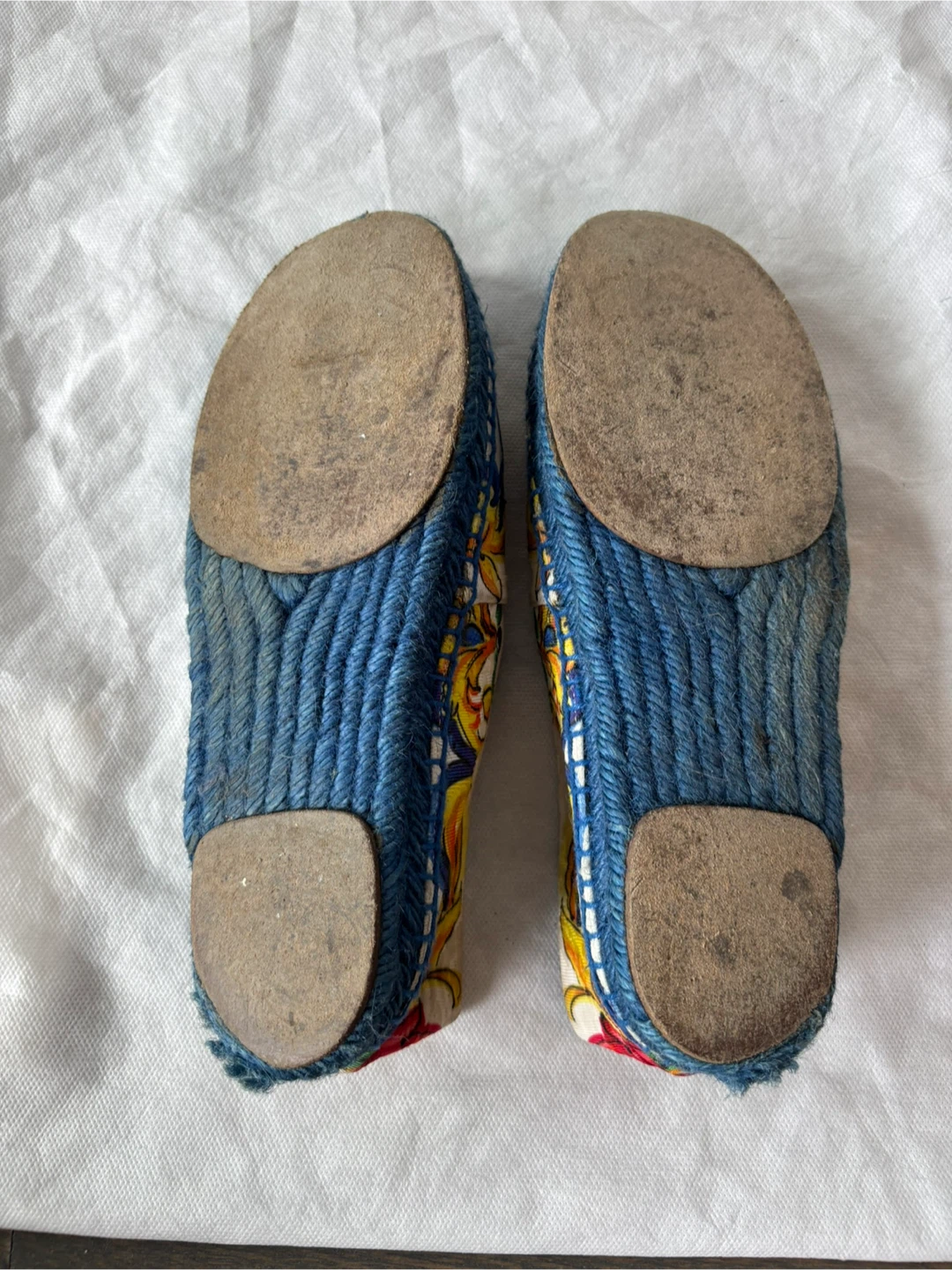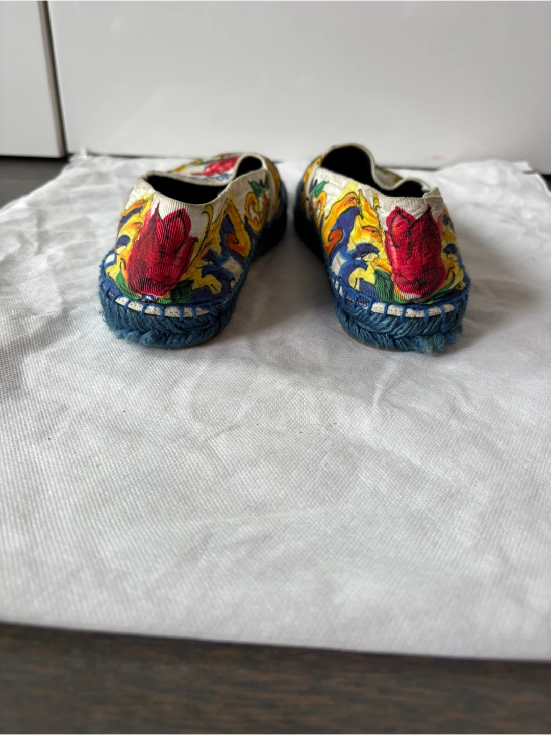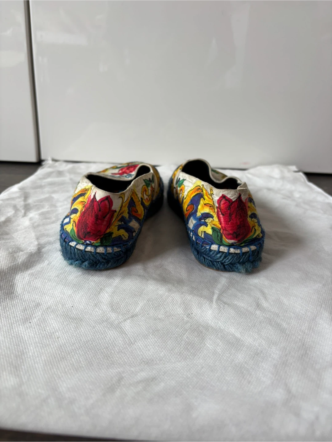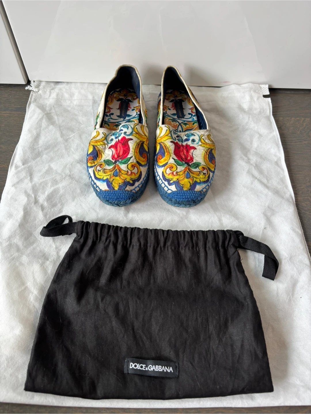 Elegant slip-on shoes with a vibrant floral pattern. Features blue, yellow, and red accents. Includes Dolce & Gabbana dust bag.