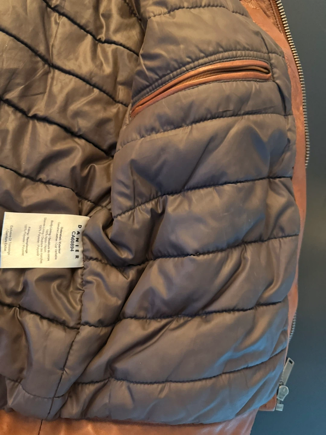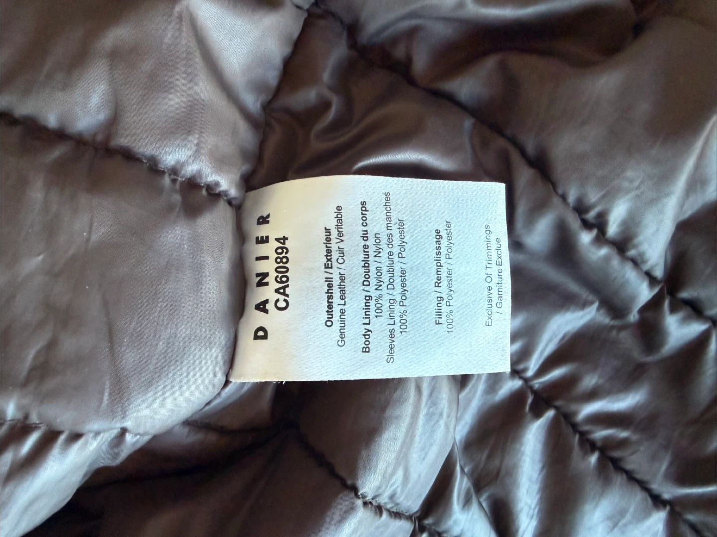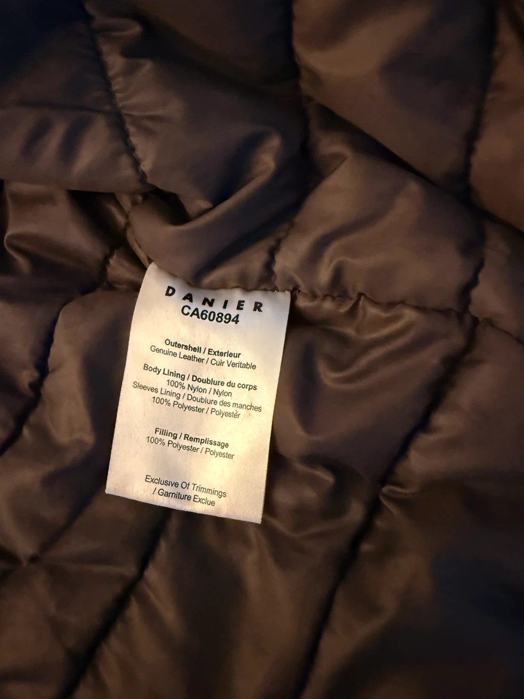 Selling a Danier genuine leather jacket. - Outer shell: Genuine Leather - Body Lining: 100% Nylon - Sleeves Lining: 100% Polyester - Filling: 100% Polyester Originally bought $350 used about a year. It's in great condition!