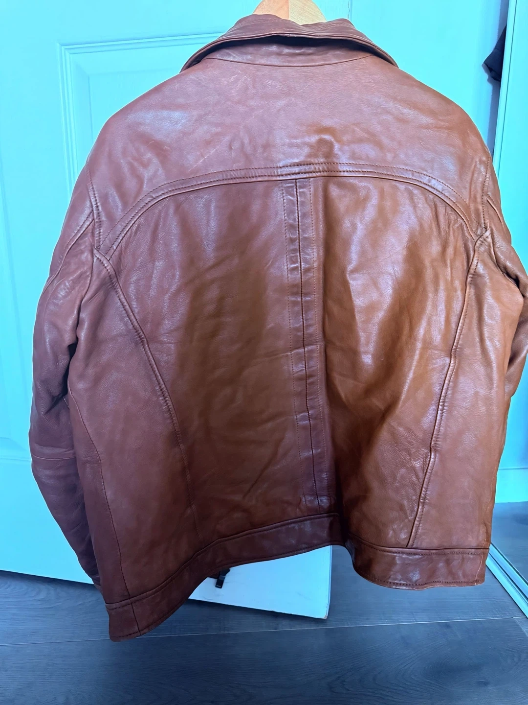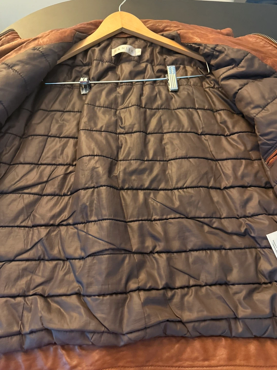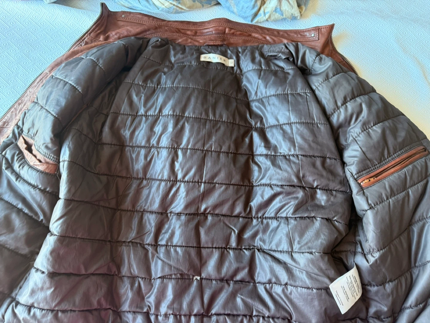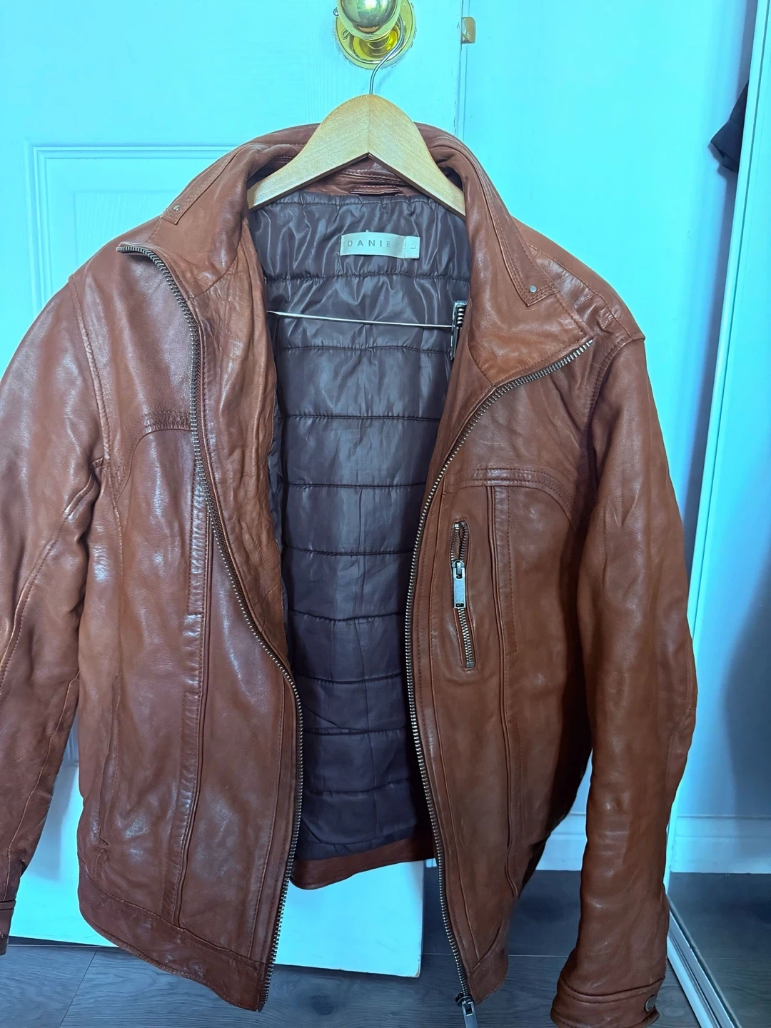 Selling a Danier genuine leather jacket. - Outer shell: Genuine Leather - Body Lining: 100% Nylon - Sleeves Lining: 100% Polyester - Filling: 100% Polyester Originally bought $350 used about a year. It's in great condition!