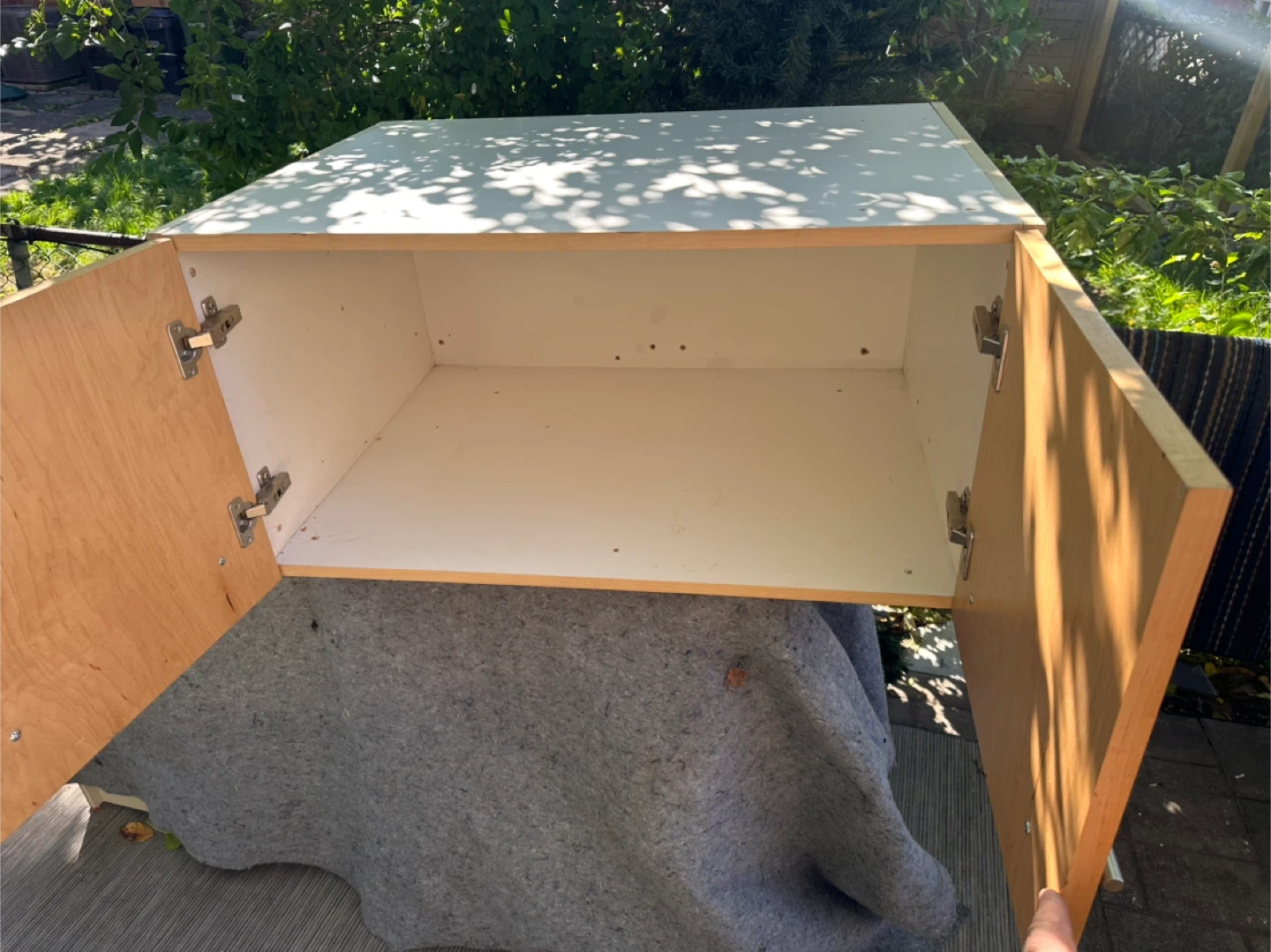 It has a white top and light brown doors.