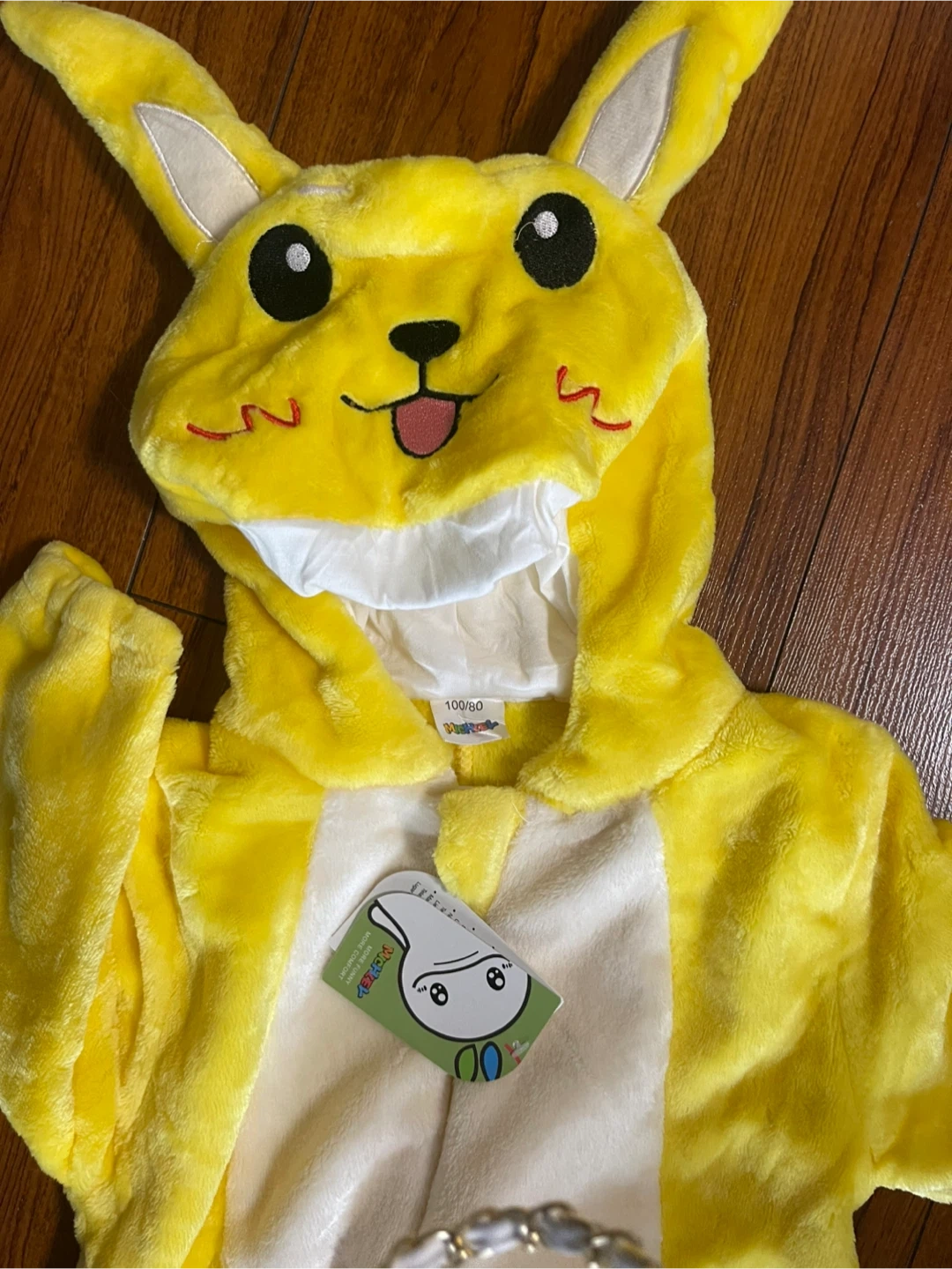 This adorable Pikachu onesie is perfect for your little one! It's a vibrant yellow colour and features a hood with Pikachu's face and ears. The size is 100/80, and it appears to be in great condition. It's made of a soft, plush material for extra comfort!
