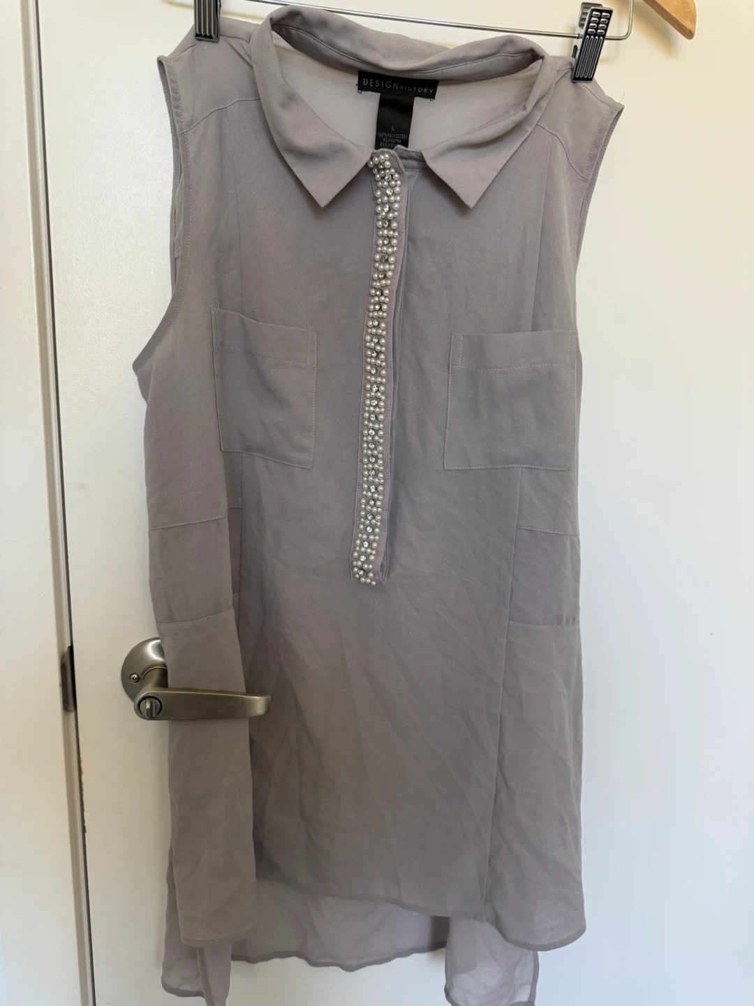 Selling a Design History sleeveless blouse in a lovely grey colour! It's a size large and features a cute collared design with pearl-like accents down the front. Perfect for layering or wearing on its own!