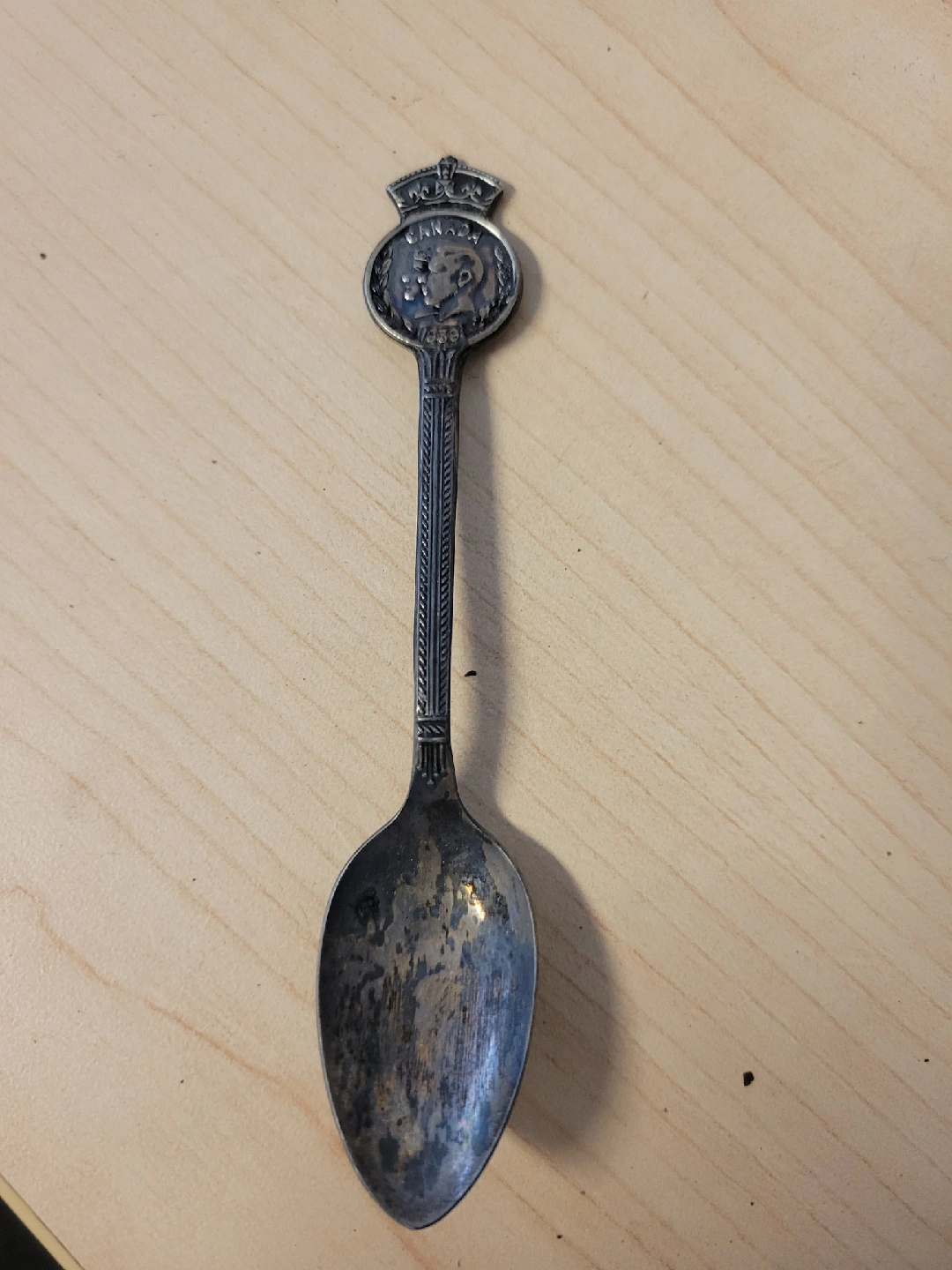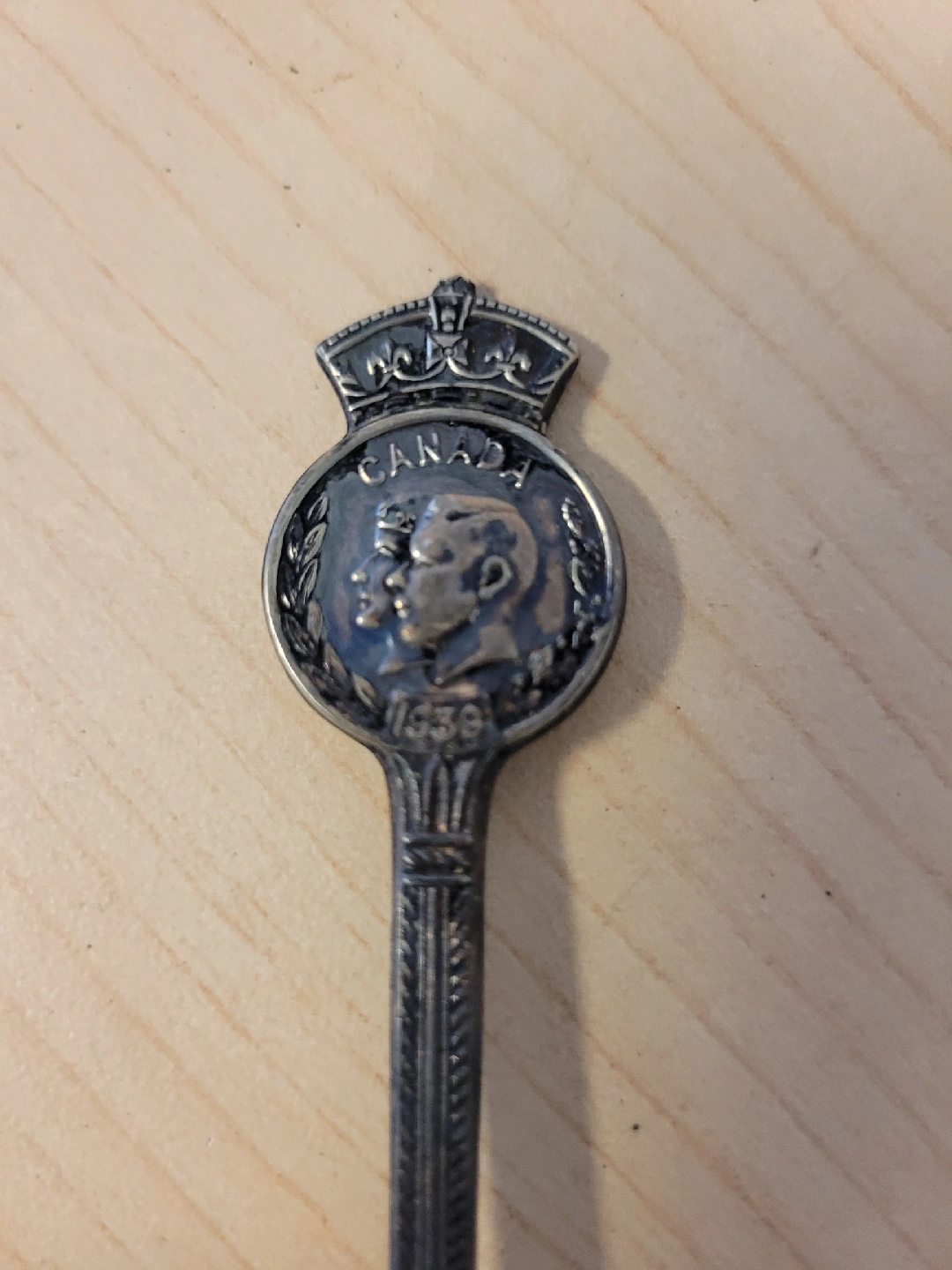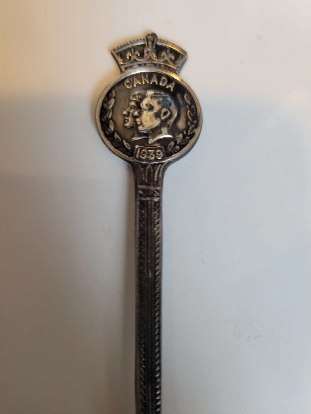 Selling a vintage souvenir spoon from Canada. It features a design commemorating the year 1939 and has "Canada" inscribed on it. It's a neat piece of Canadian history! It could definitely use a good polish though.