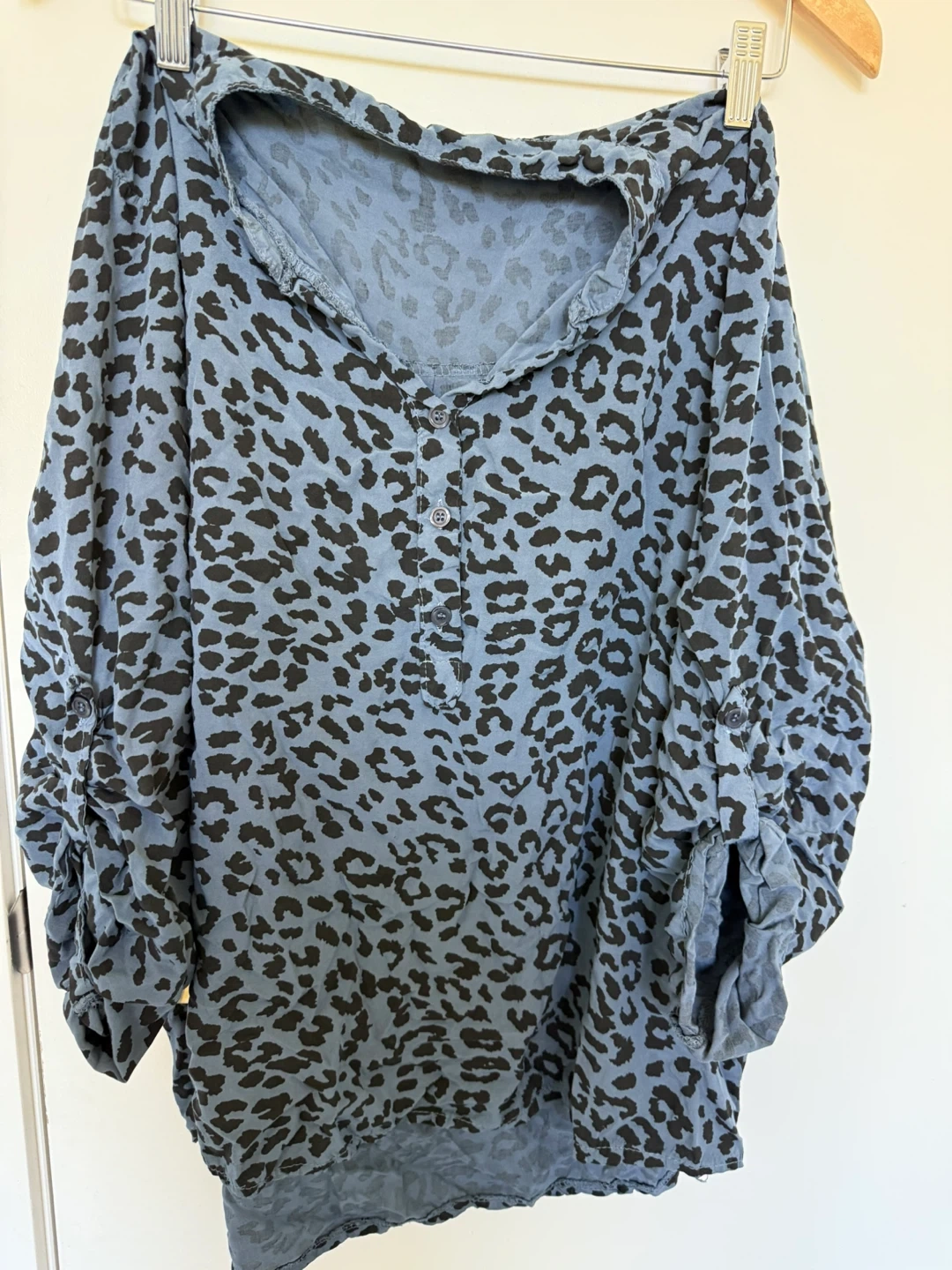 Here's a cute blue top with a black leopard print. It has a button-up front and the sleeves can be rolled up and buttoned as well. Perfect for a casual day out!