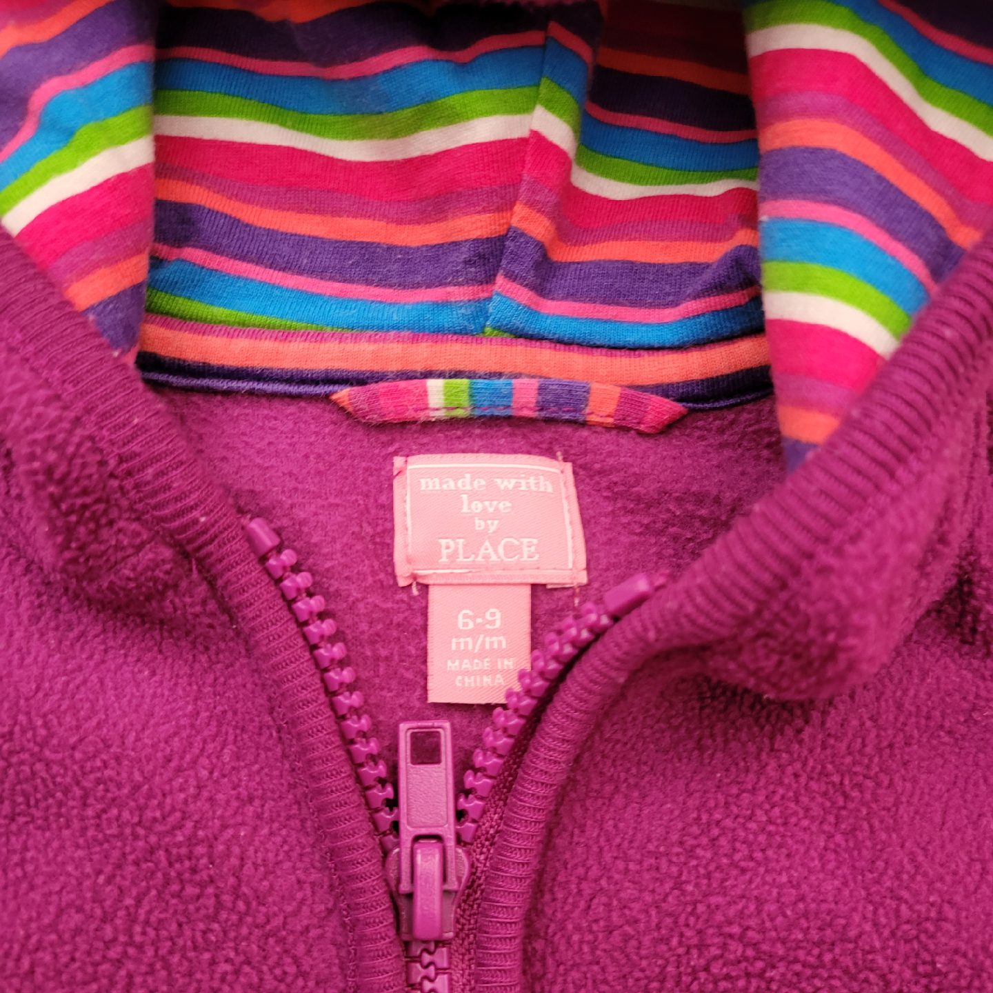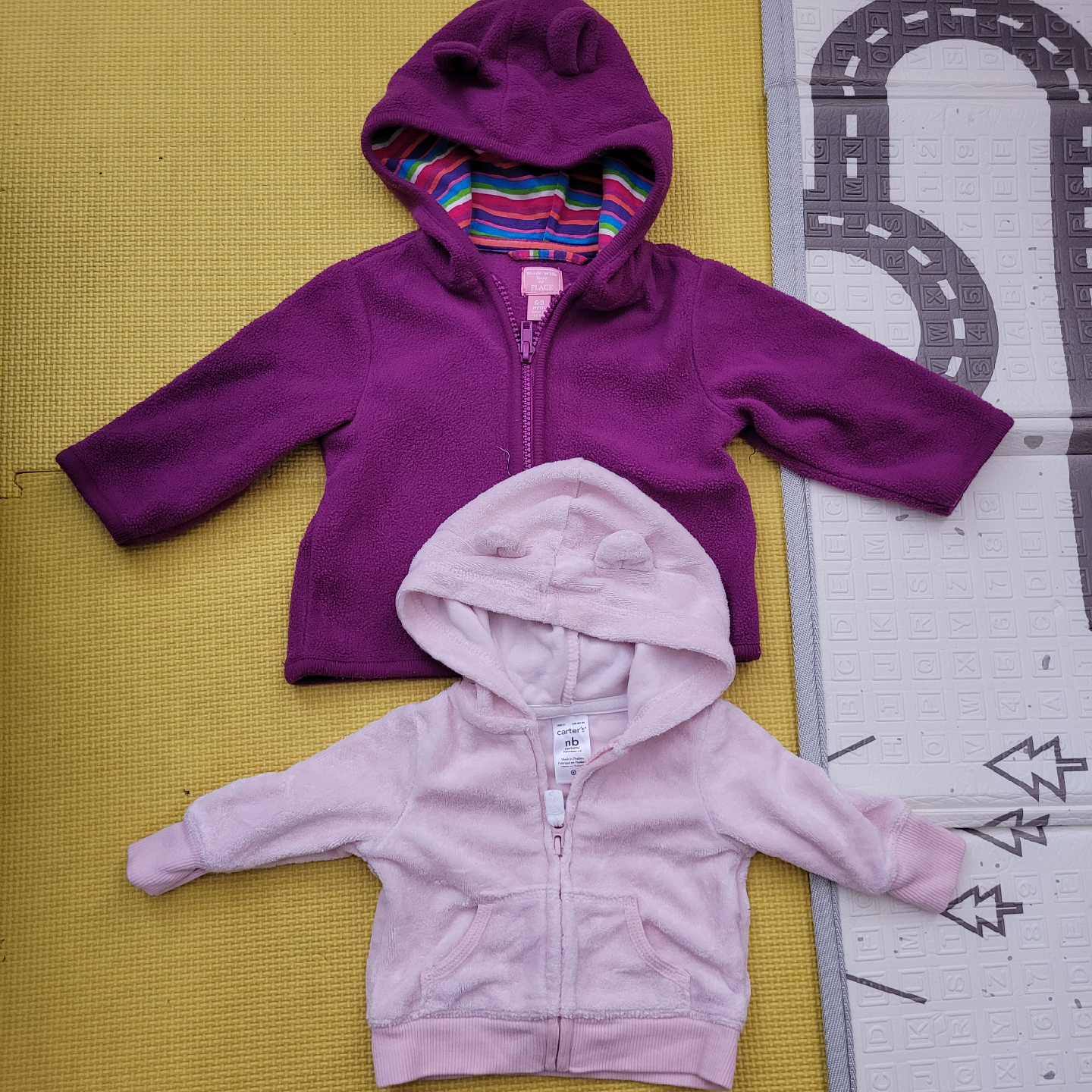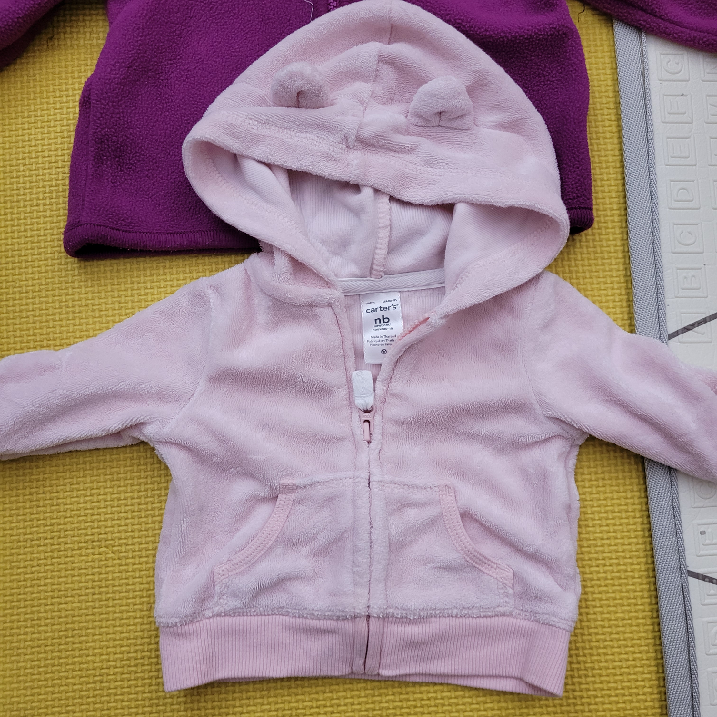 Two adorable baby hoodies for sale! One is a soft, light pink Carter's hoodie in size NB (newborn) with cute little bear ears on the hood. The other is a purple fleece hoodie from The Children's Place in size 6-9 months. Both are in great condition and ready for a new home!