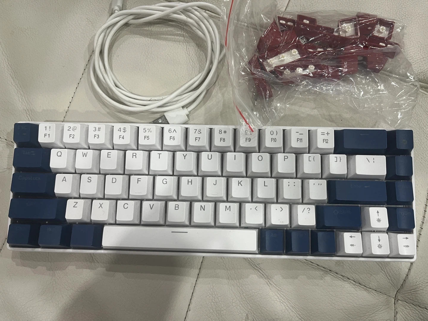 Selling a custom mechanical keyboard with a unique blue and white colour scheme! It comes with a white cable and a bag of extra keycaps. Perfect for someone looking to personalize their setup or get into custom keyboards