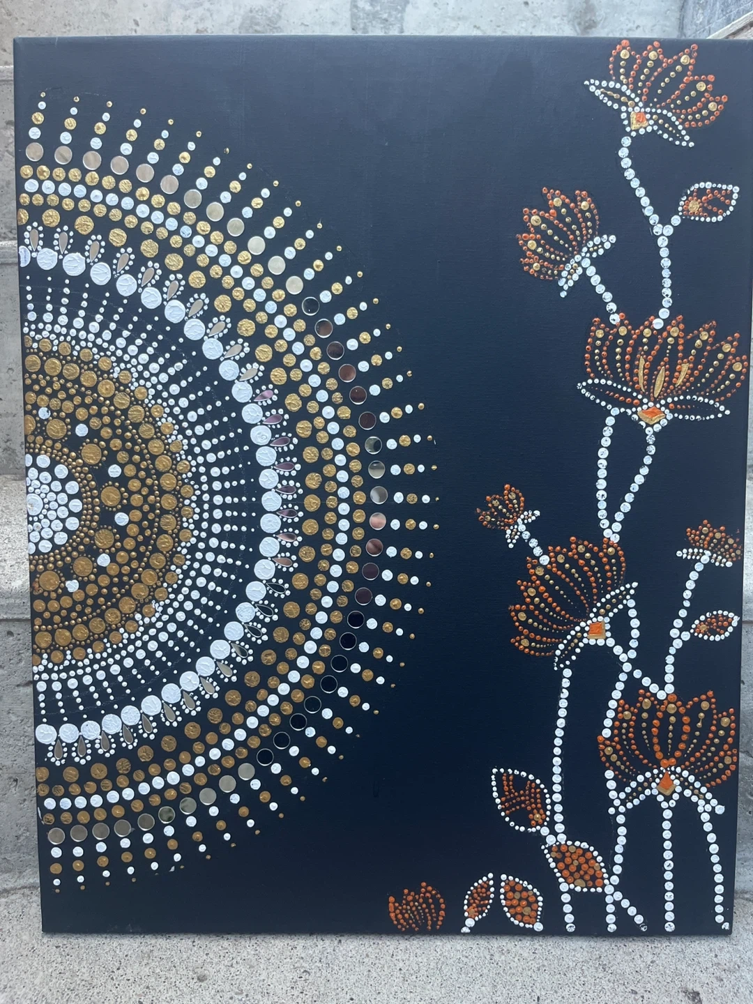 Unique dot art painting featuring a floral design and a mandala pattern. The colours are gold, white, and orange on a black background. It's a great piece to add some character to your space!