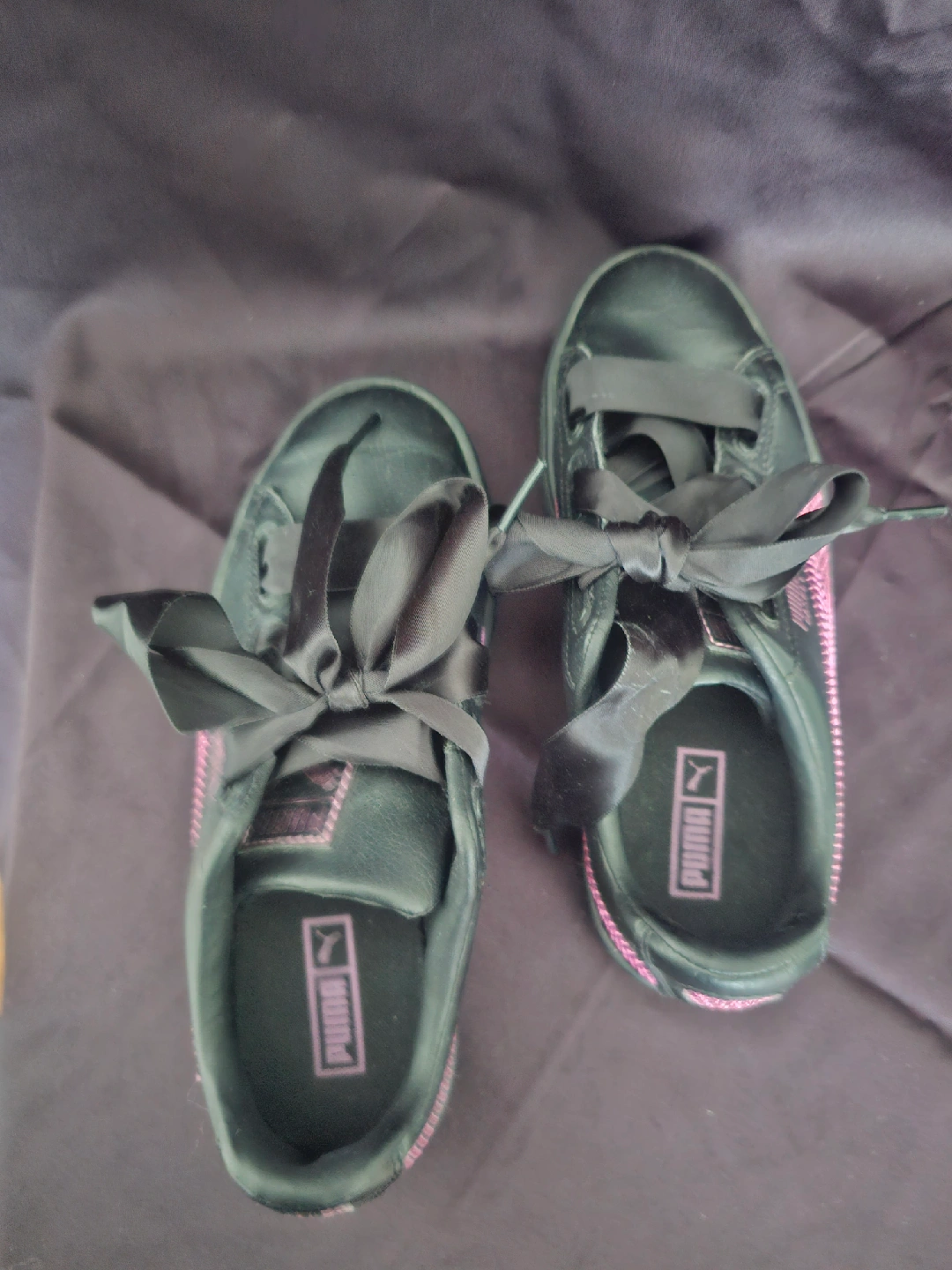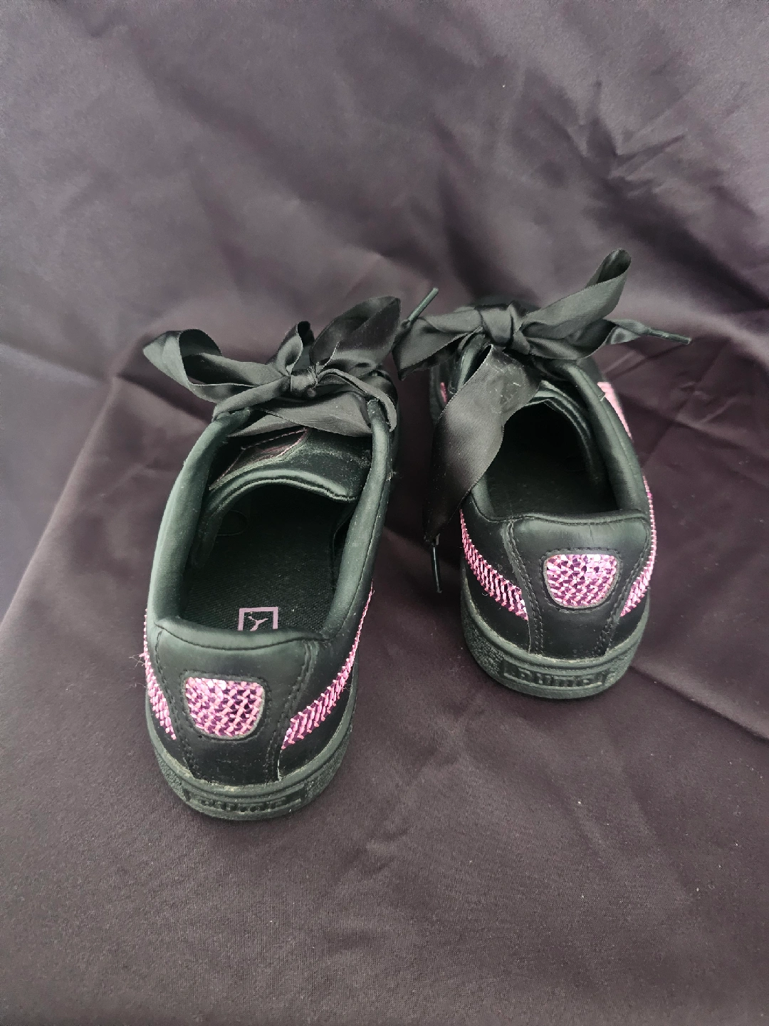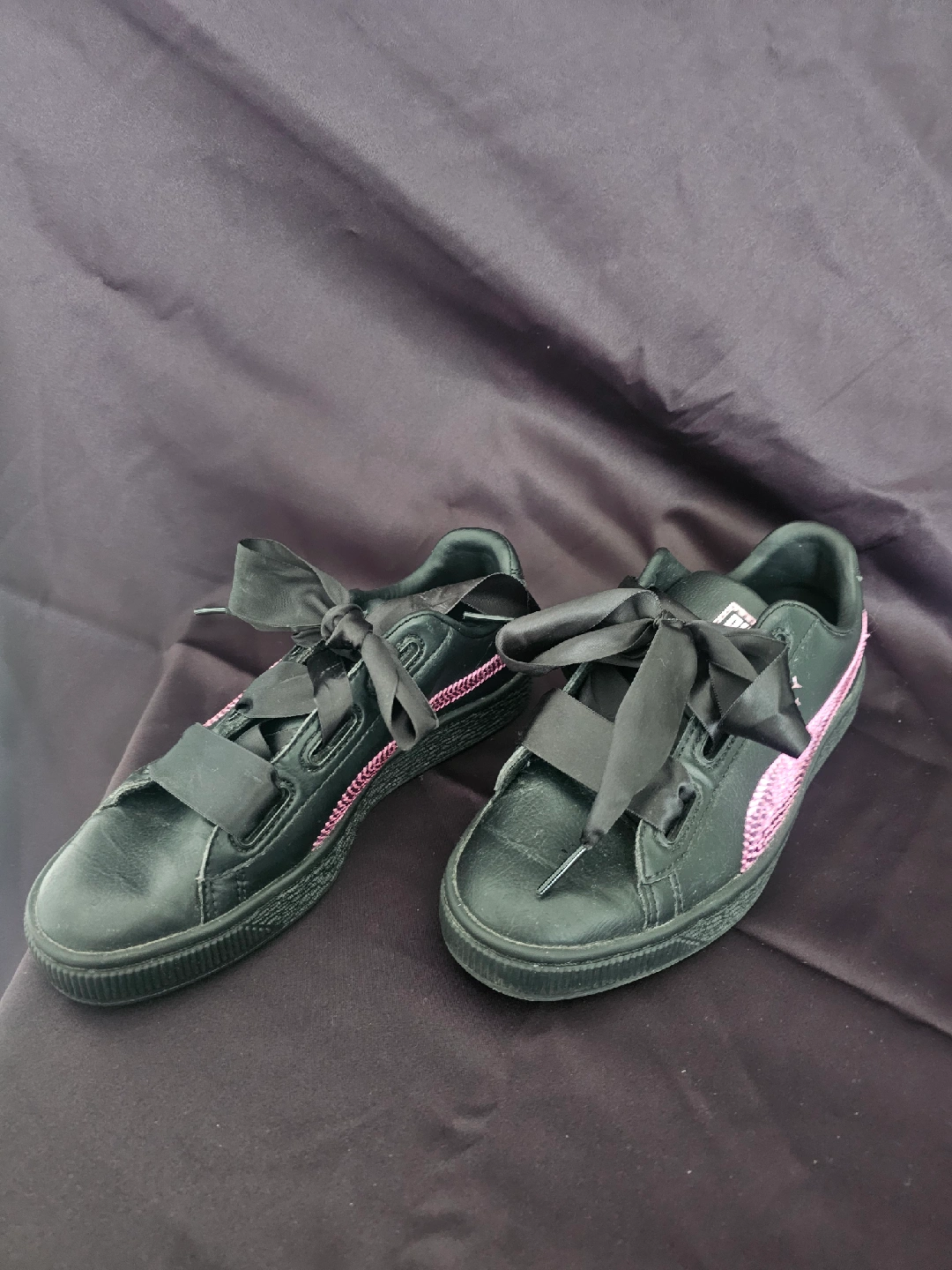 Cute pair of Puma Basket Bling Jr sneakers! They're black with pink detailing and feature ribbon laces. used but great condition. Size 5. $20 Open to offers Pick up only Cash only near WESTON GO/UP train station