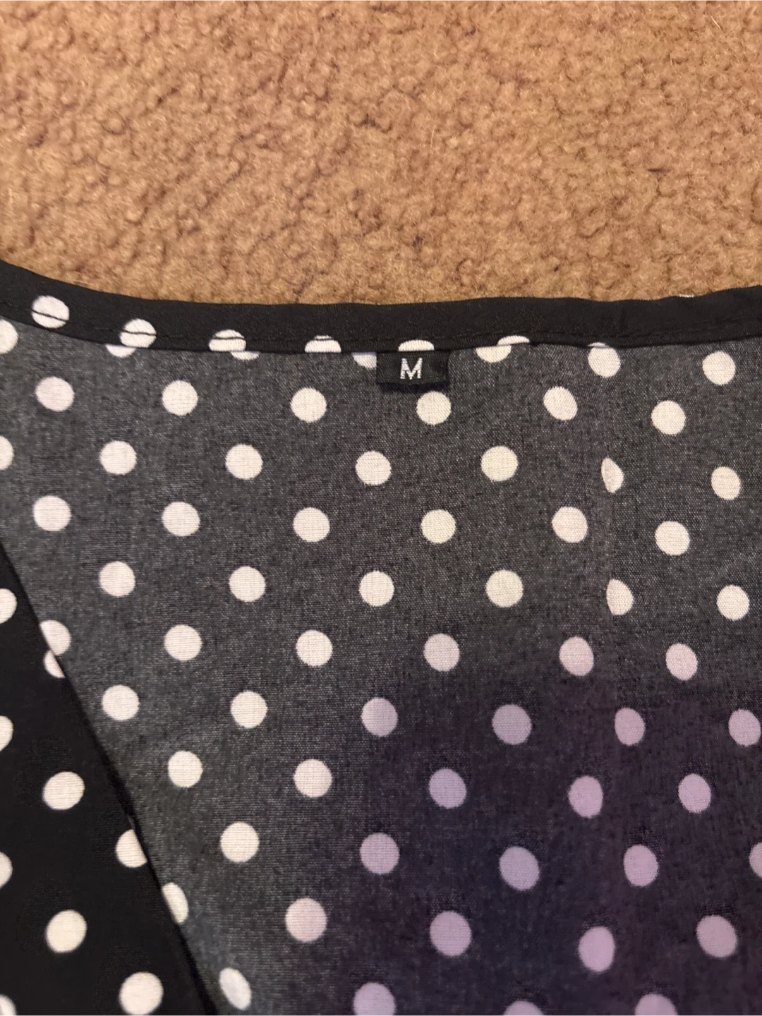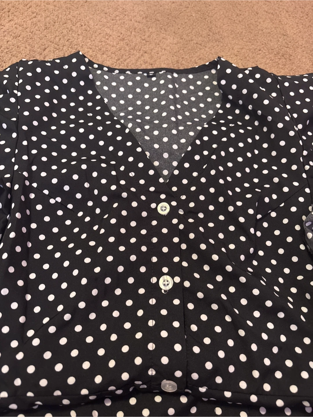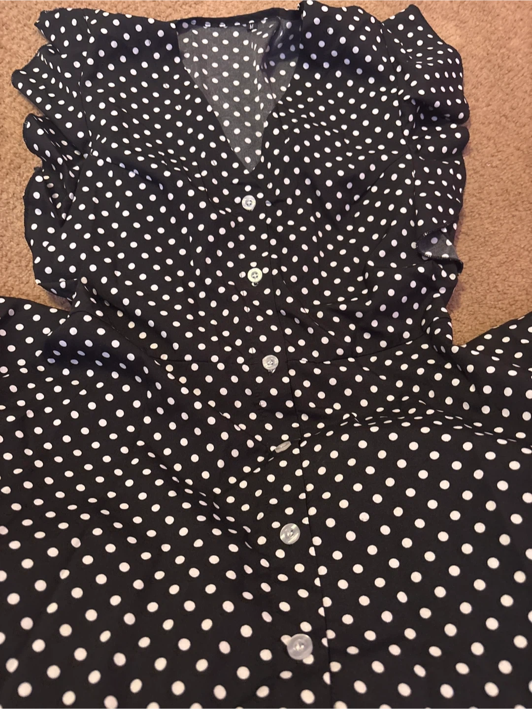 10Cute polka dot dress in a size medium! It's a button-down style and would be perfect for a casual day out. The dress is in great condition and ready for a new home
