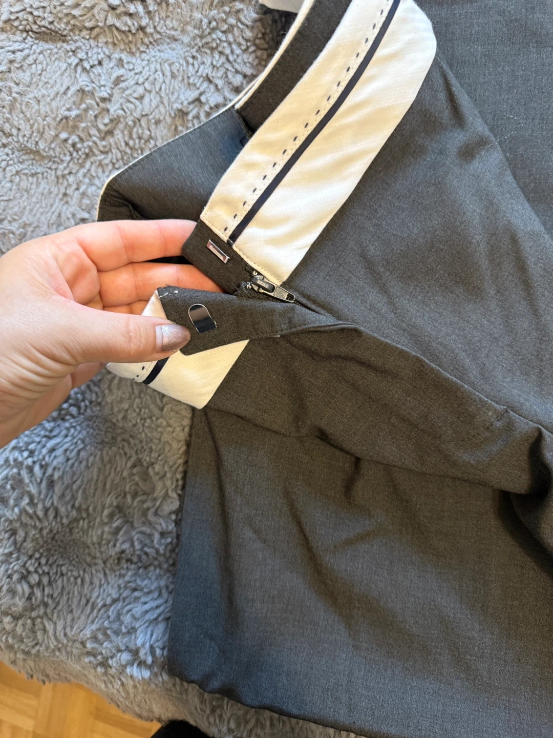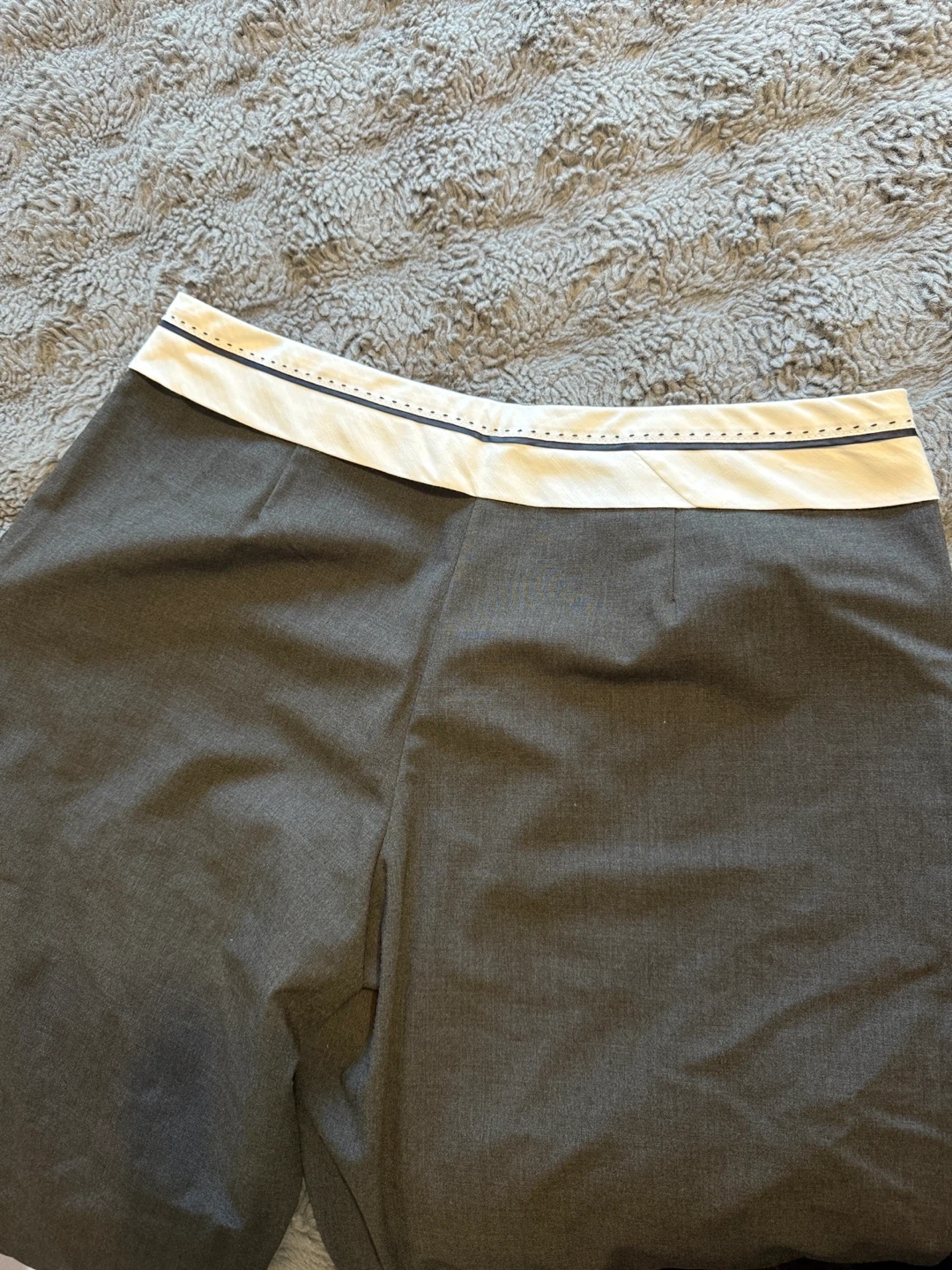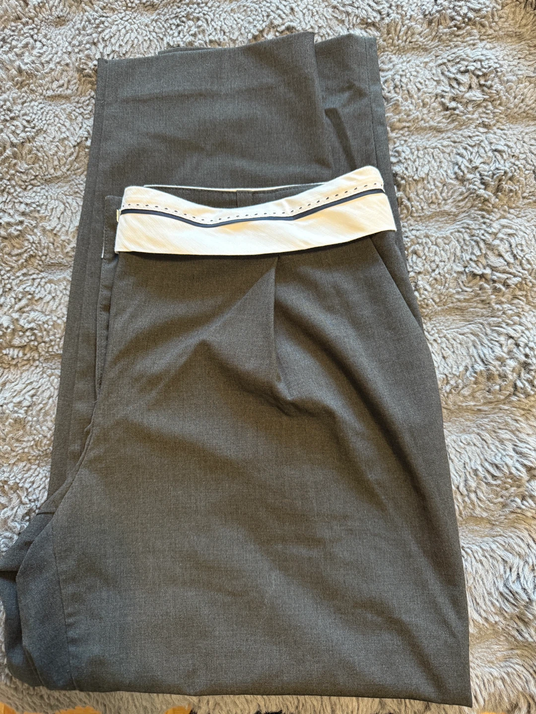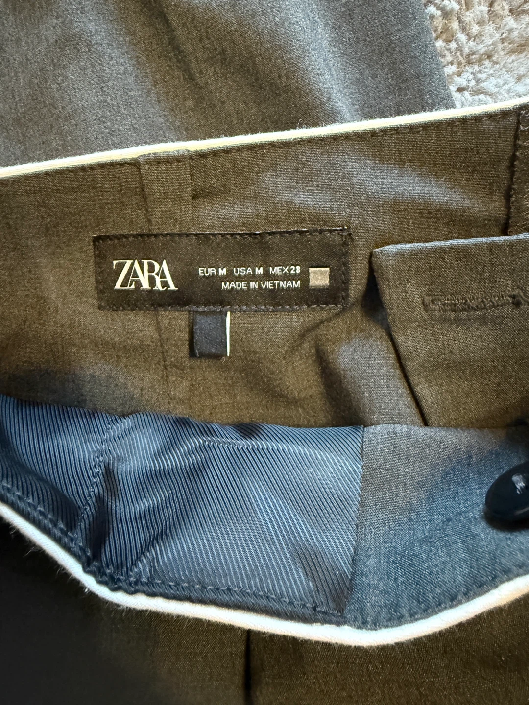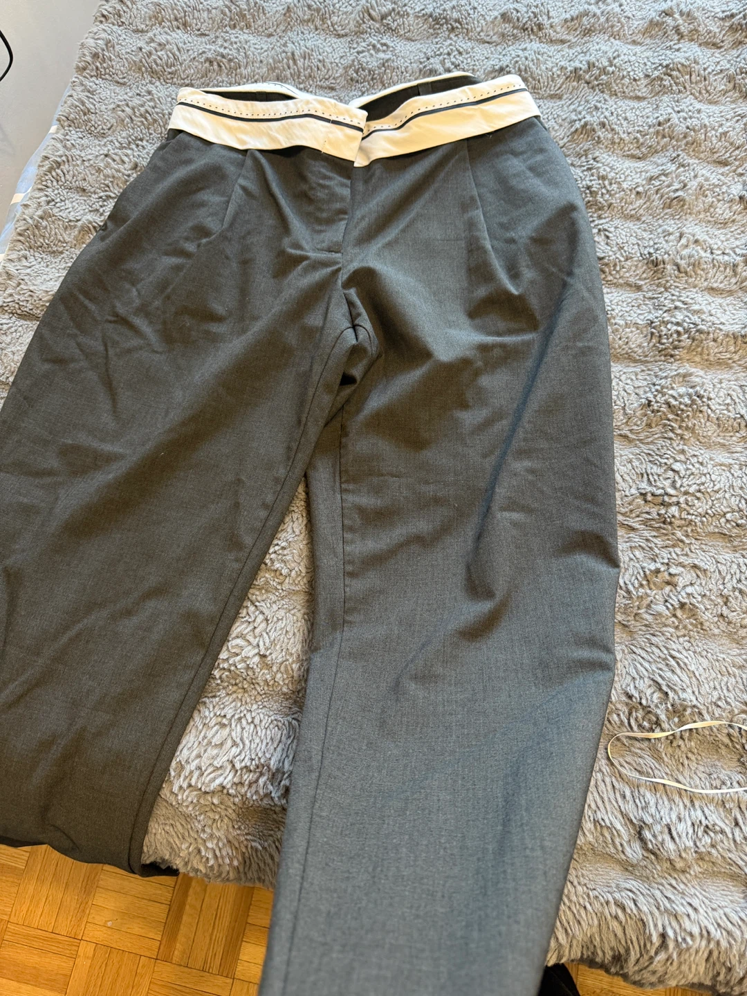 Selling a pair of Zara trousers in a stylish grey colour. They are a size medium (M) and in great condition. The trousers feature a unique white waistband detail that adds a touch of sophistication. Perfect for any occasion!
