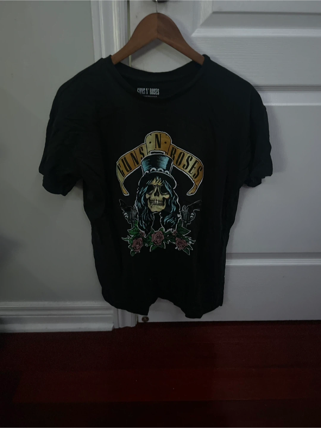 Selling a Guns N' Roses black t-shirt! It features the classic band logo with the skull and roses design. Great for any fan!