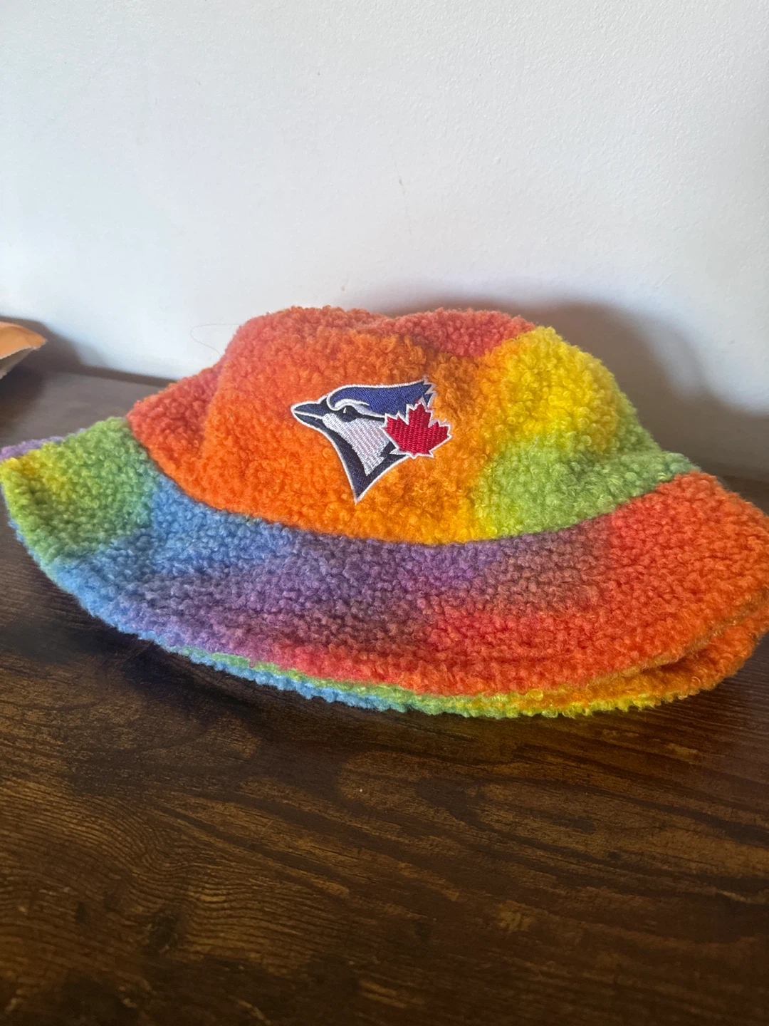 Check out this super fun Toronto Blue Jays bucket hat! It features a vibrant rainbow sherpa-like material and the classic Blue Jays logo. Perfect for showing your team spirit in a unique way Worn only a few times, machine washable!
