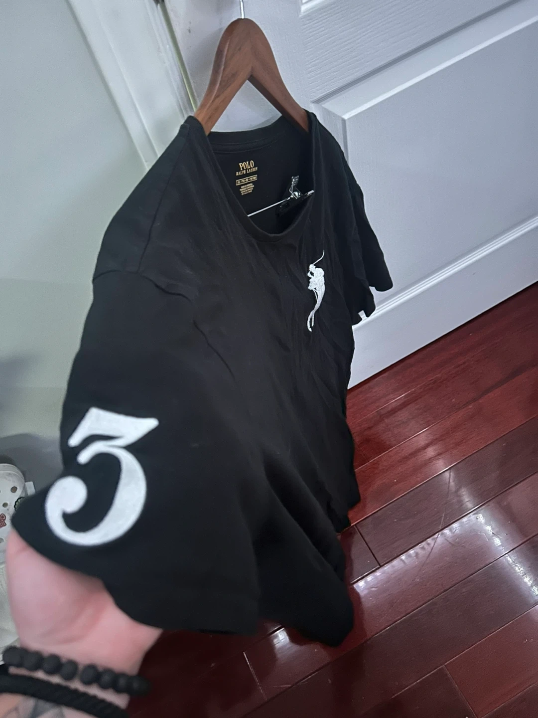 Selling a Polo Ralph Lauren black t-shirt. It has a white logo on the front and a number 3 on the sleeve. It's in great condition and ready for a new home!