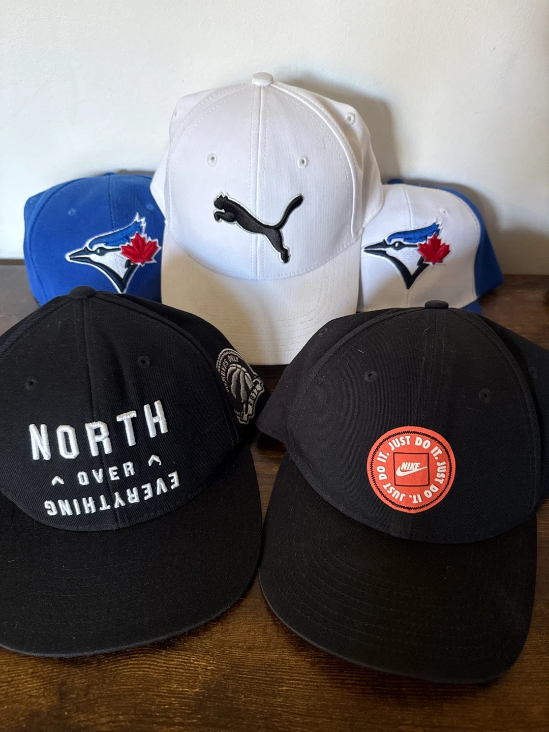 Selling a collection of baseball caps! There's a Nike cap with the 'Just Do It' logo, a white Puma cap, two Toronto Blue Jays caps, and a Toronto Raptors hat.