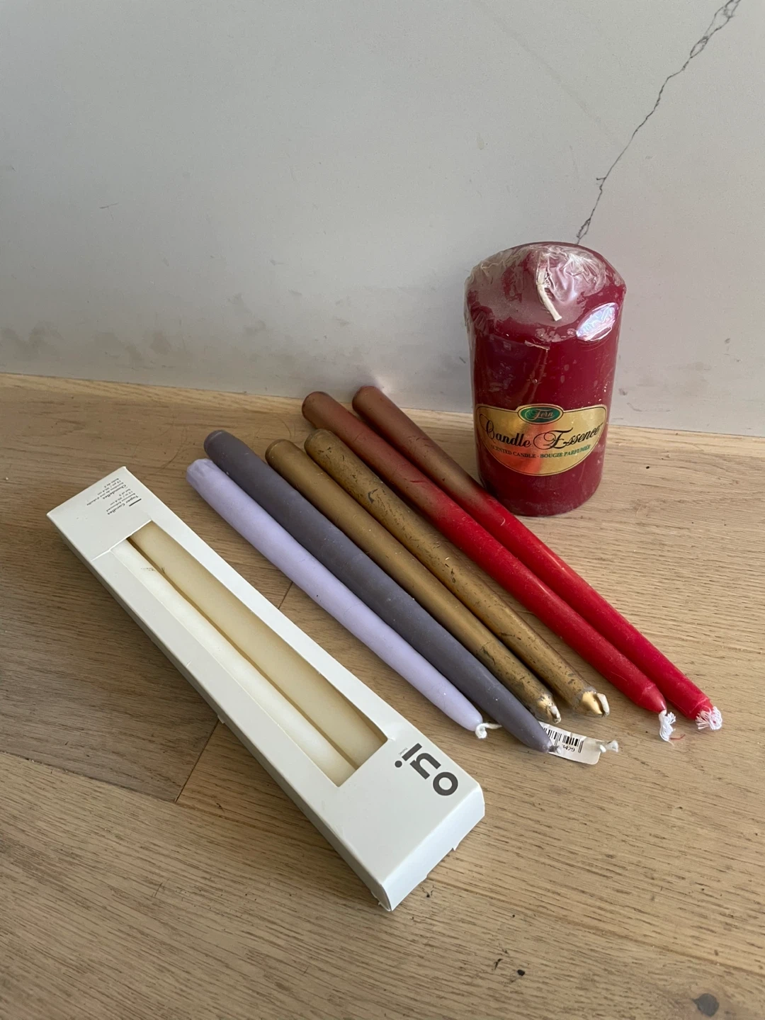 Selling a variety of candles including tapered candles in red, gold, and grey, a red pillar candle, and a boxed set of white candles. Perfect for adding some ambiance to your space! All for 10$ Ash only