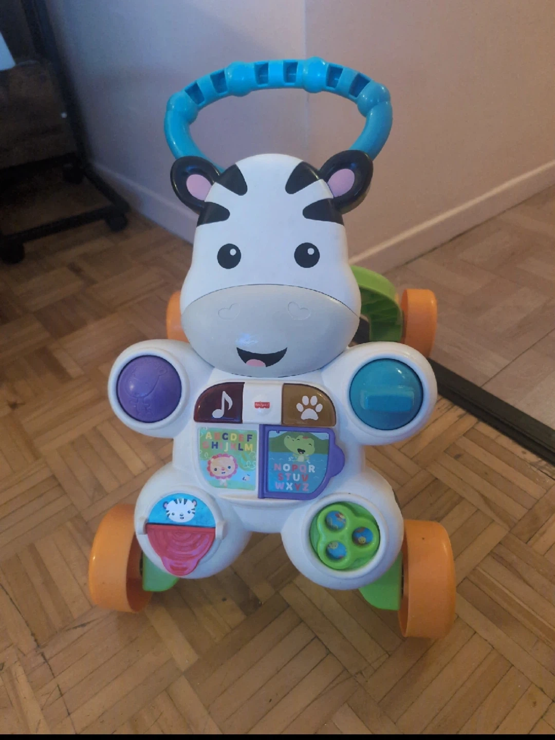 The Fisher-Price Learn with Me Zebra Walker is perfect for little ones learning to walk! It's got lots of fun activities to keep them entertained, including buttons, flip pages, and spinning rollers. It's in great condition and ready for a new home