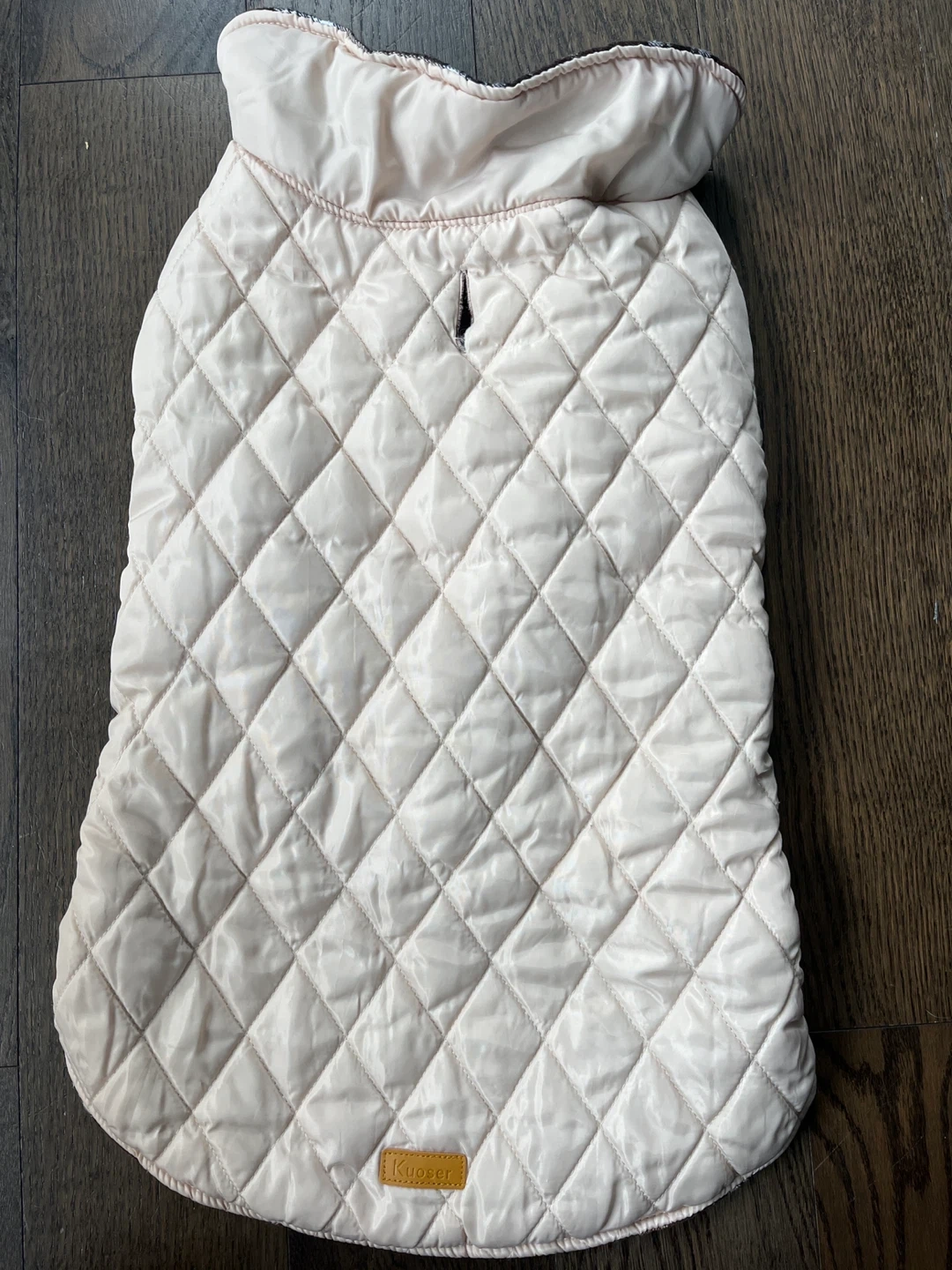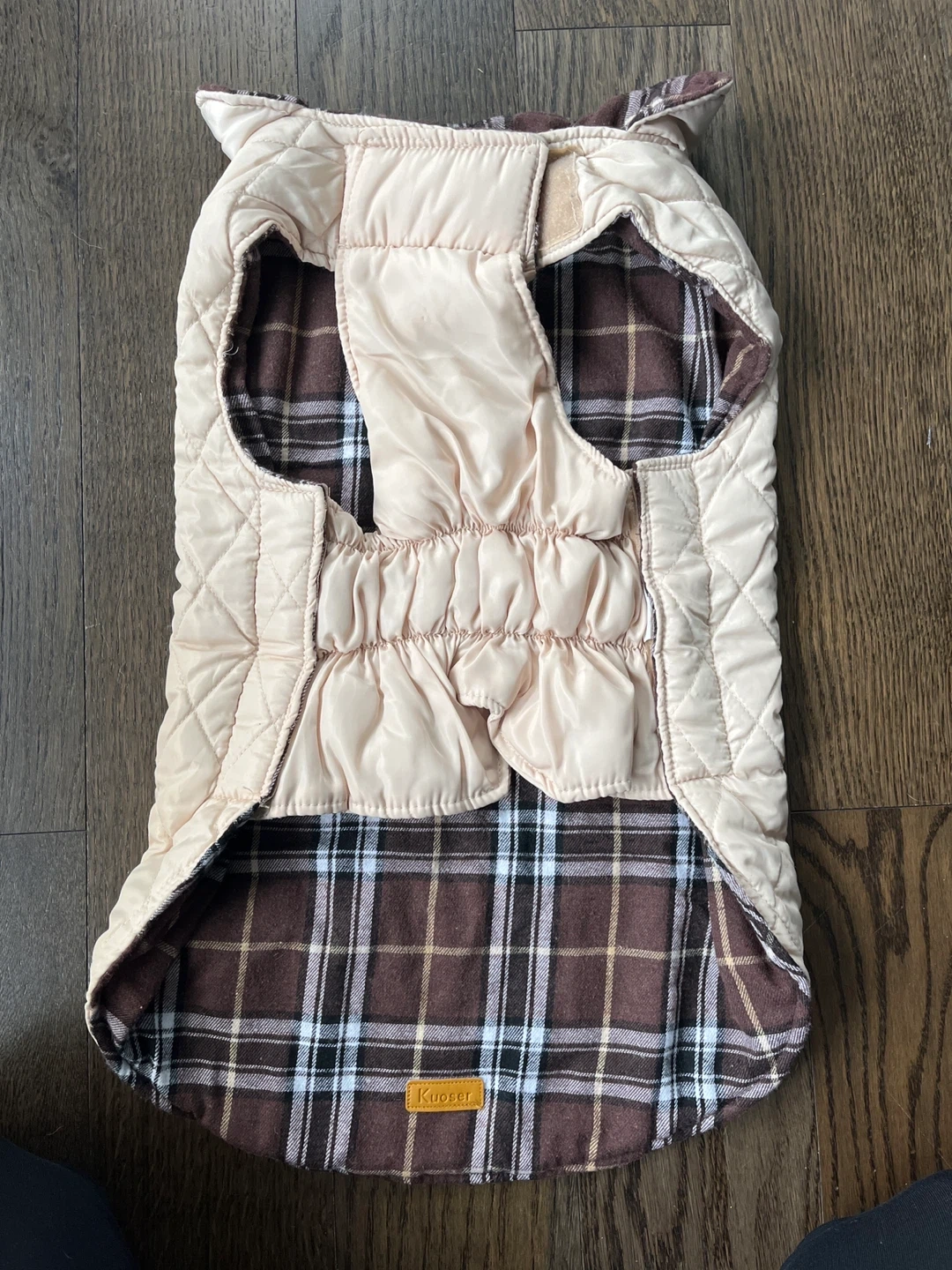 Keep your furry friend warm and stylish with this Kuoser dog winter coat! It features a beige quilted exterior and a cozy plaid lining. The coat is designed for comfort and easy wear during those chilly Canadian walks. Perfect for medium-sized dogs! Length: 23 inches Circumference: 25 inches