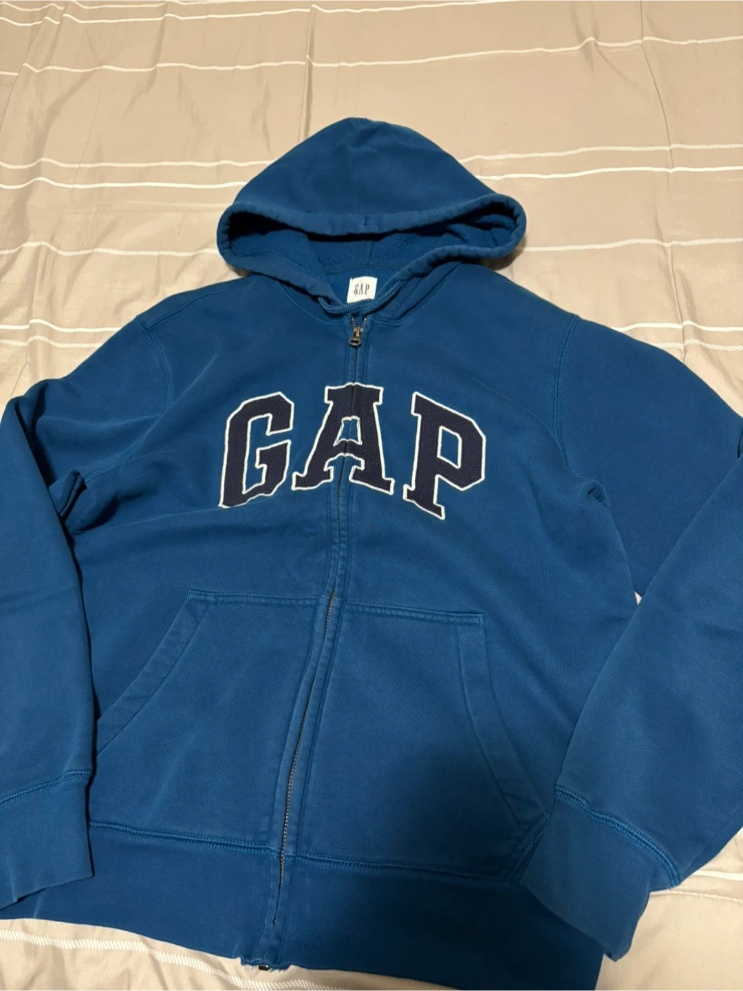 Selling a comfy GAP full-zip hoodie in a nice blue colour! It's a men’s size small / women’s medium, and perfect for layering. The hoodie has the classic GAP logo across the chest and is in good condition. Selling for $15 or your best offer!