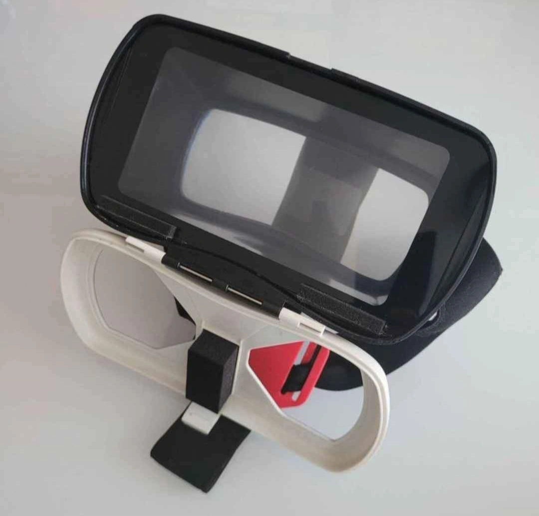 Virtual reality headset that magnifies your phone. Includes a strap and adjustable lens. Put your phone inside and watch movies up close with no distractions. Fits comfortably.