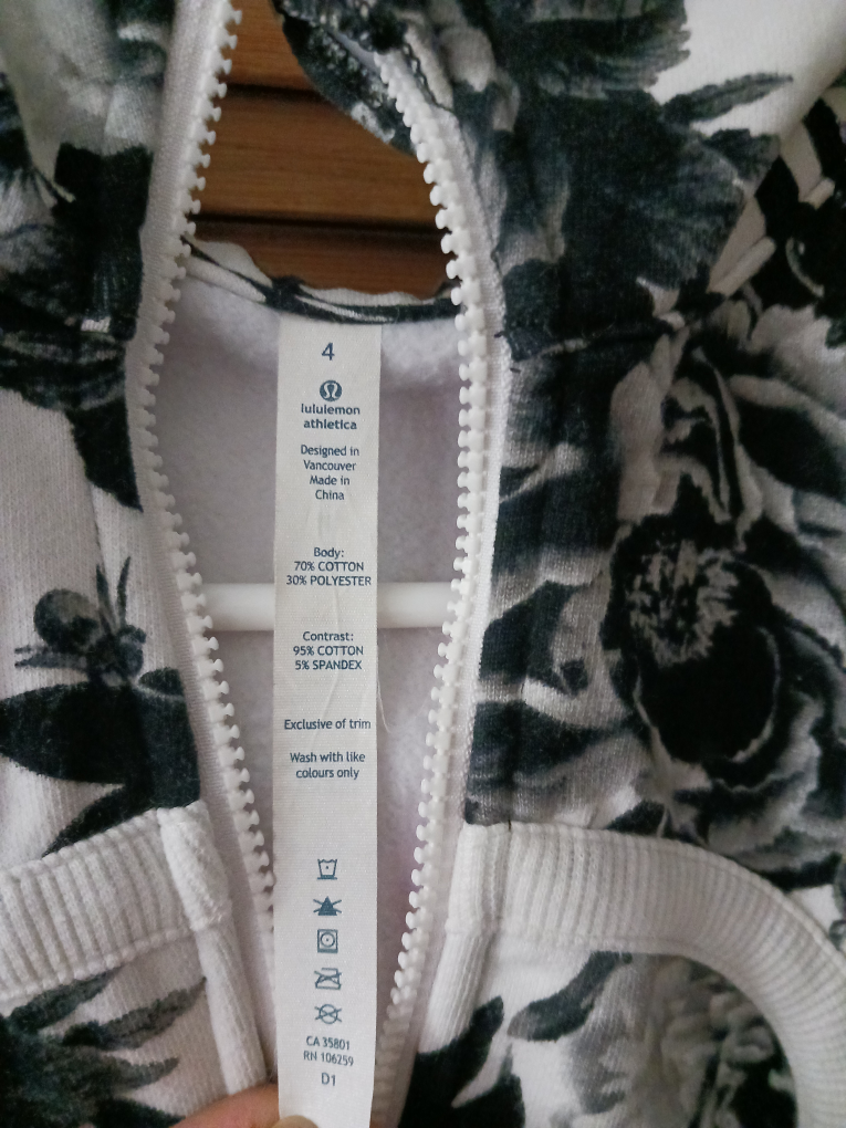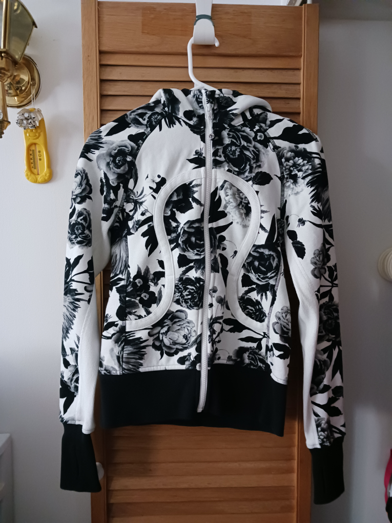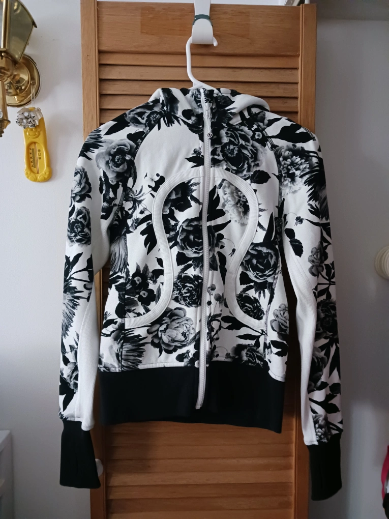 Selling a Lululemon Athletica hoodie in size 4! It features a beautiful floral pattern in black and white.