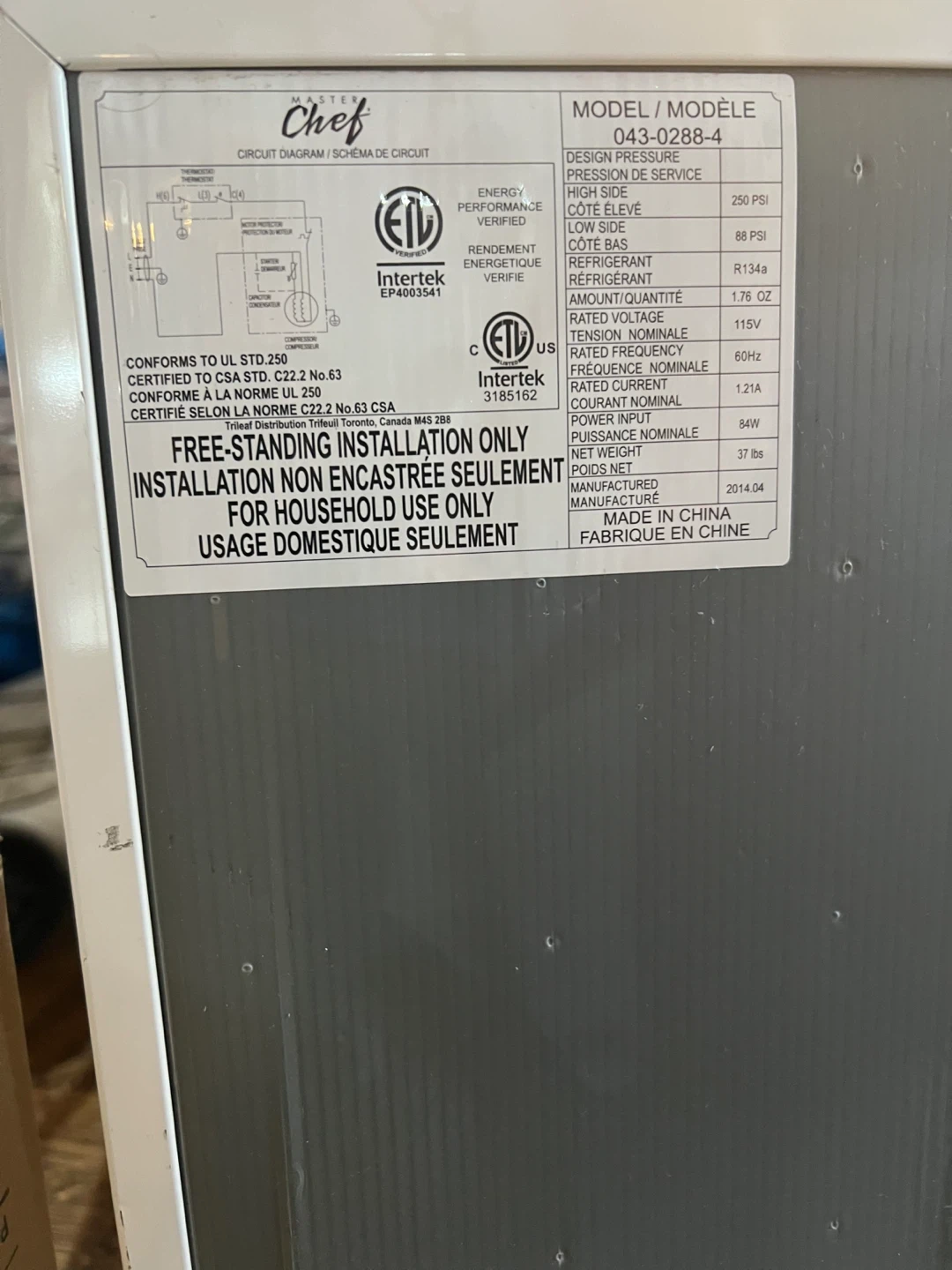 Selling a Master Chef mini fridge. It's white and in used condition. The model number is 043-0288-4. It was manufactured in 2014 April 04. Great for a dorm room or small space!