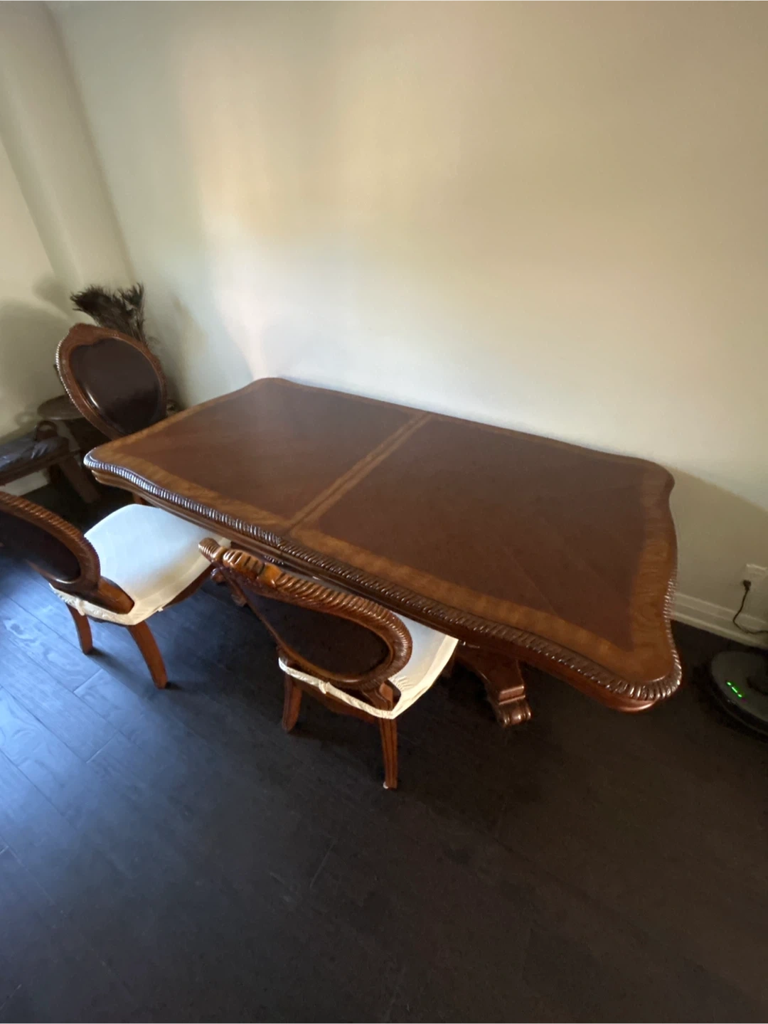 Selling a wooden dining table that comes with eight matching chairs! The table has a beautiful wood grain pattern and a decorative edge. The chairs have upholstered seats and ornate wooden frames to match the table. It's a great set for family dinners or gatherings