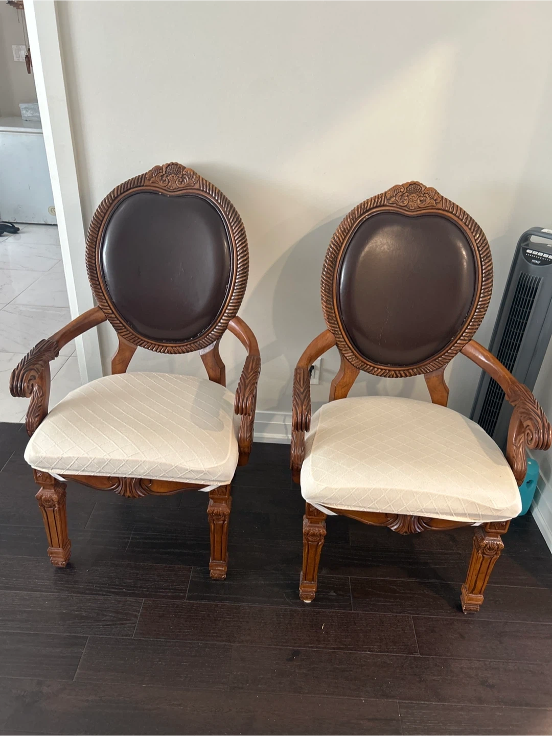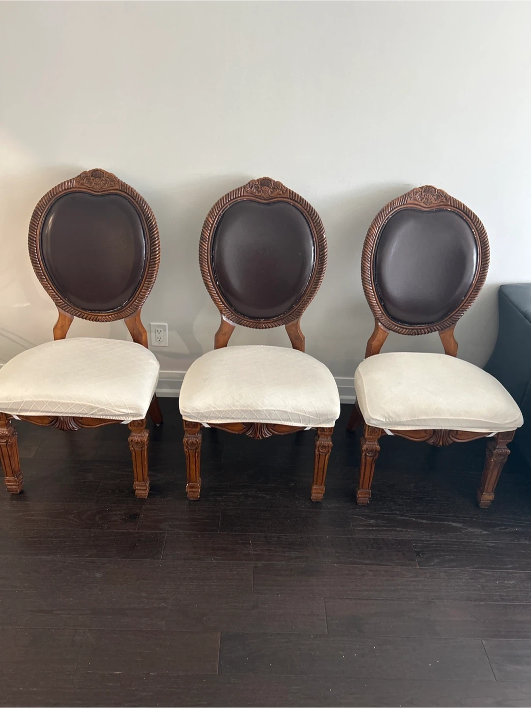 Table has two expandable leafs to convert to 6 or 8 seating arrangement. Chairs seats may need upholstery.