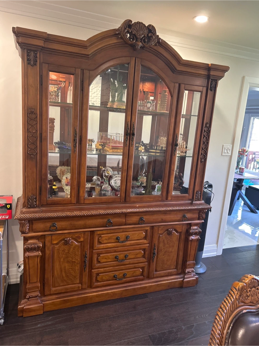 This is accompanied by a matching chest. Top of the chest has glass on 3 sides and drawers at the bottom for storage.