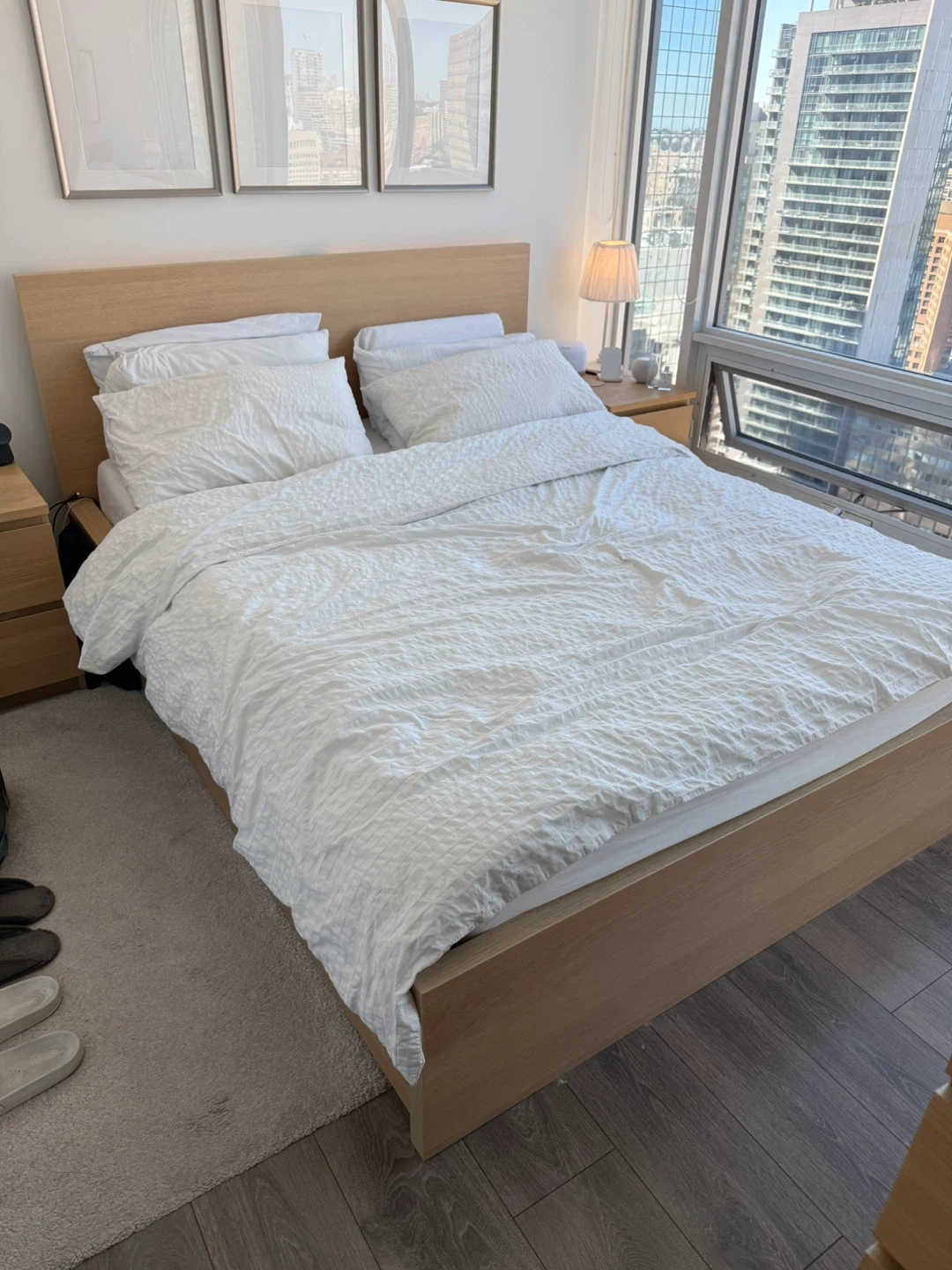 Selling an IKEA Malm bed frame in oak veneer, queen size! It's in great shape and ready for a new home. The dimensions are 211 cm (83 1/8") in length and 168 cm (66 1/8") in width. The headboard height is 100 cm (39 3/8"). Pick up from condo apartment.