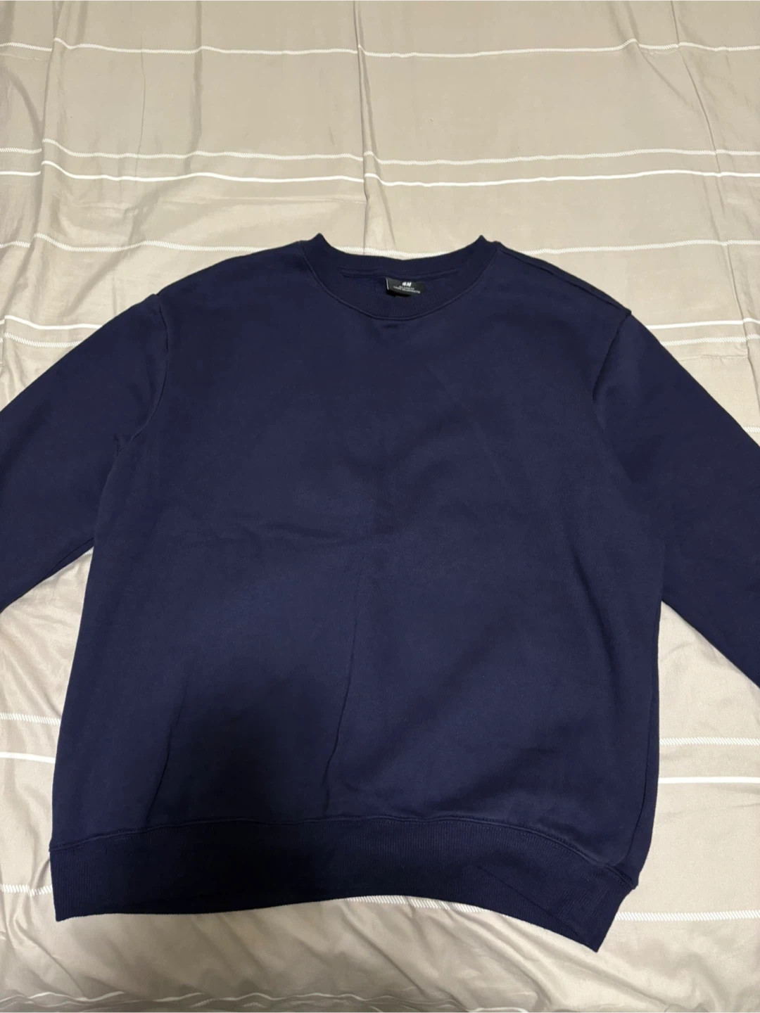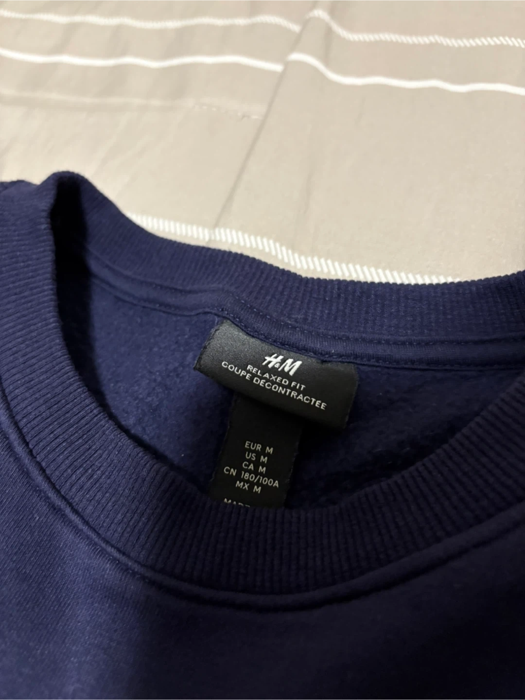 Selling a comfy H&M relaxed fit sweatshirt in navy blue. It's a size medium and in great condition. Perfect for layering or just lounging around the house!