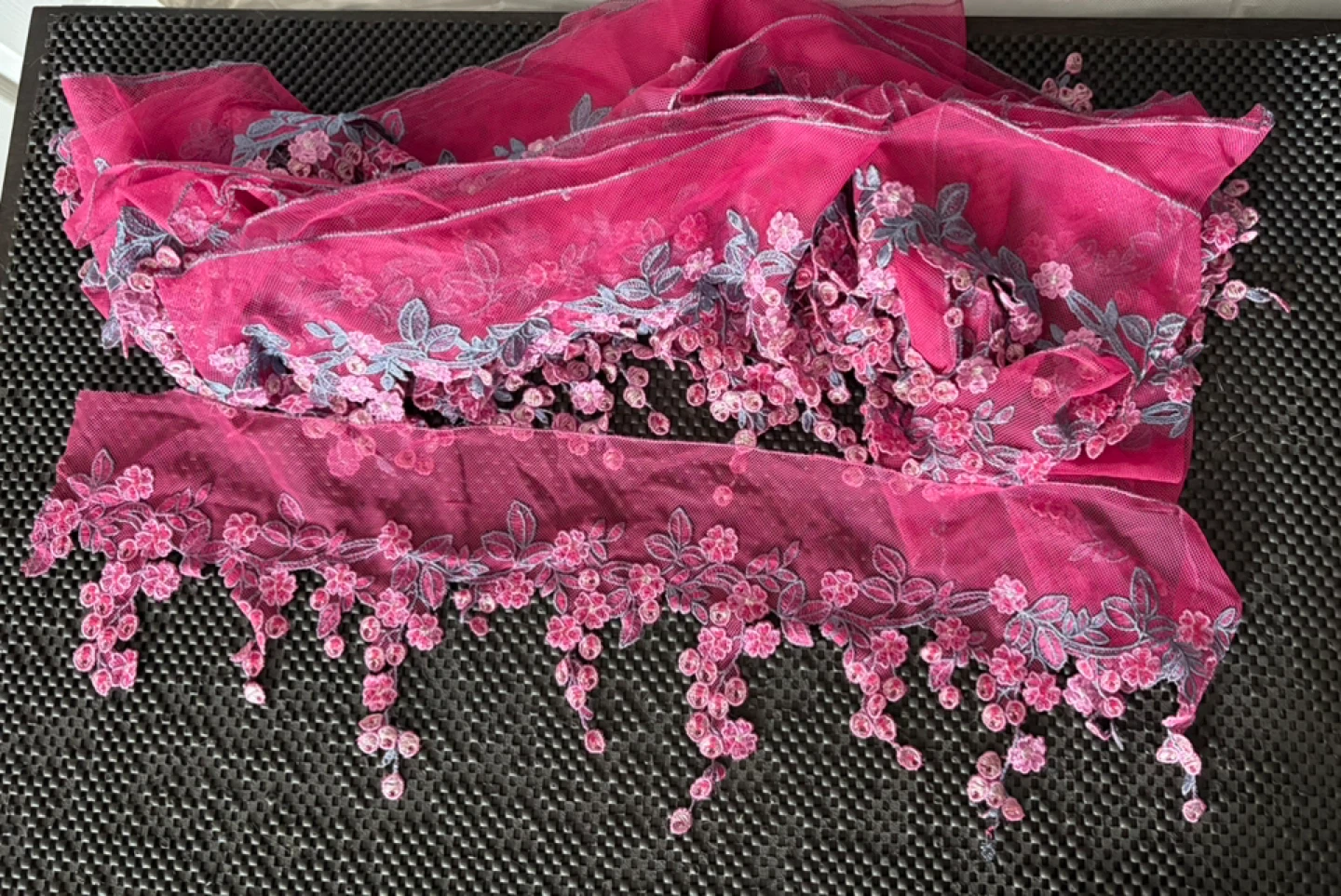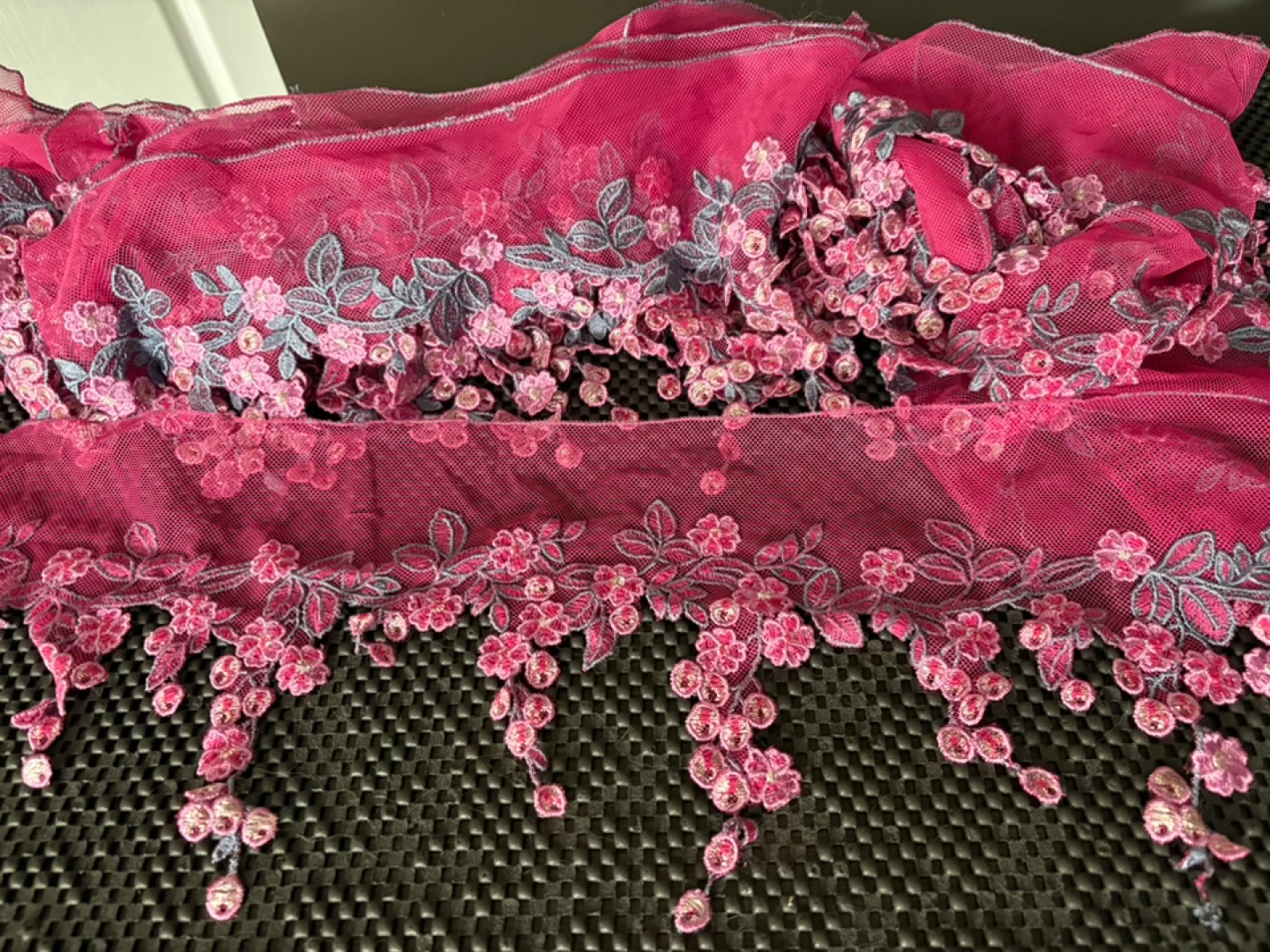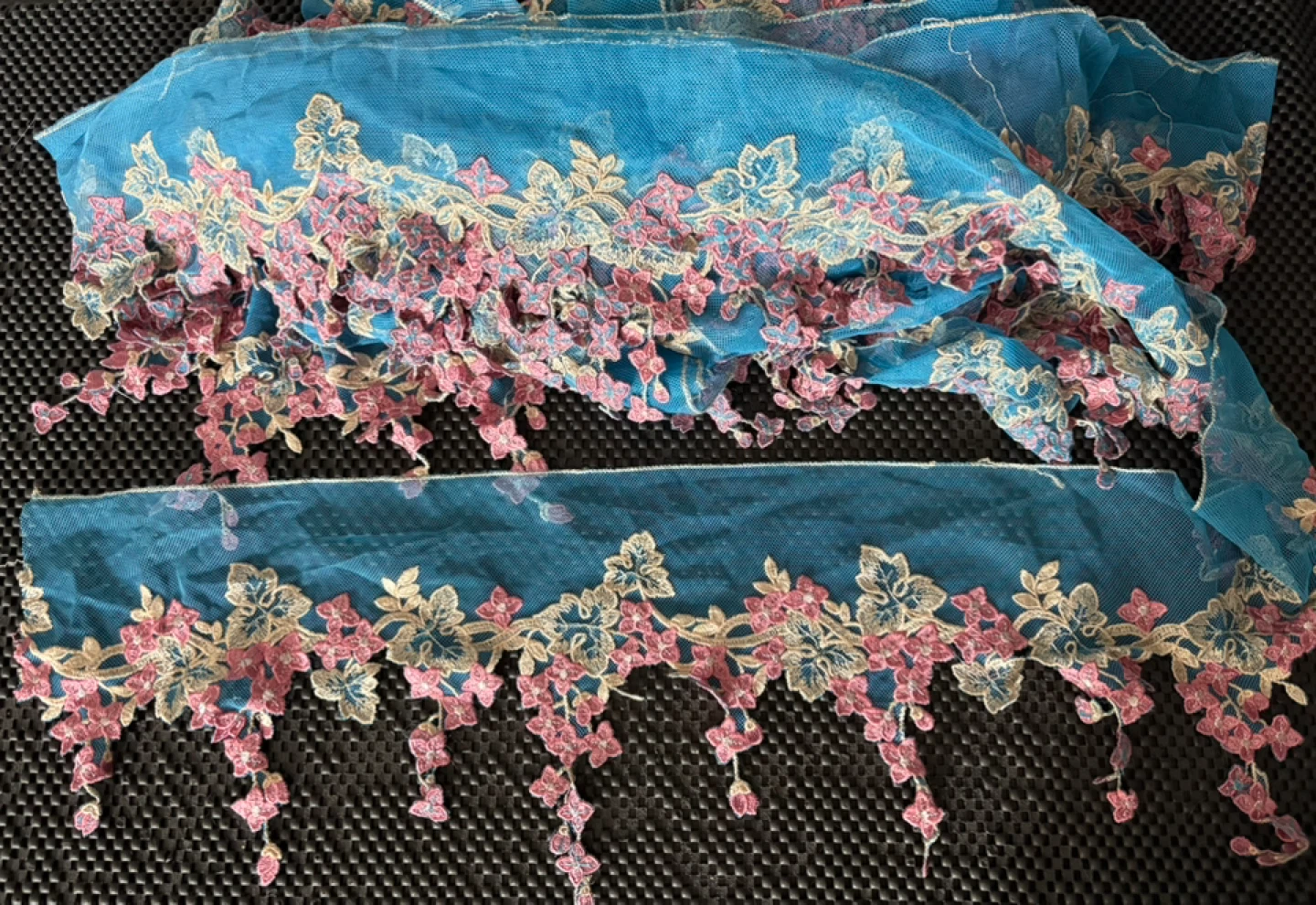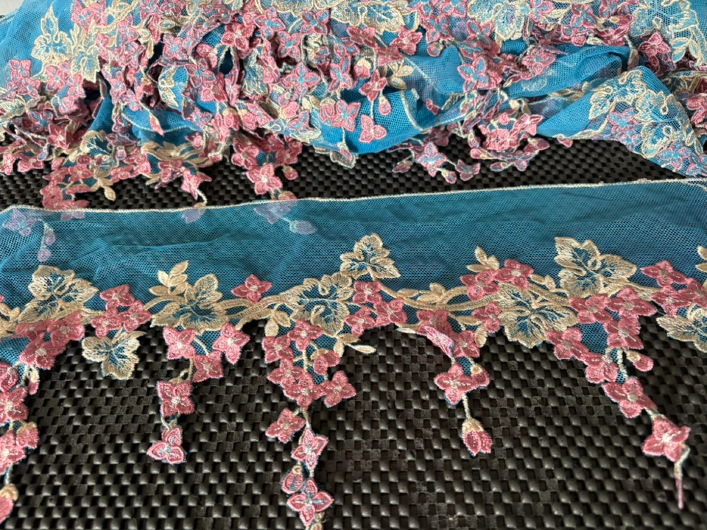 Colourful Netted/ Embroidered Trimmings All new Floral embroidered lace trim with a scalloped, dangling design Colour Pink 14 Yards $80 per bundle Selling as is 4 Bundles Colour Blue 22 Yards 15” $120 Please see pics for measurement Can be used for Dresses & Gowns Lingerie & Nightwear Sarees & Dupattas Skirts & Blouses Veils: Creates an elegant border for bridal veils Headbands or Hair Accessories: Can be sewn onto fabric headbands or clips Home Decor Curtains: As a decorative edge Table Runners & Linens: Adds a sophisticated finish Pillows: Decorative edging Crafts Costume Design: Great for theatrical or dance costumes DIY Projects: Scrapbooking, gift wrapping, or handmade cards Pickup near wonderland or shipping is available
