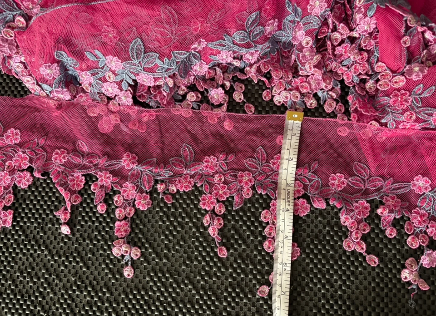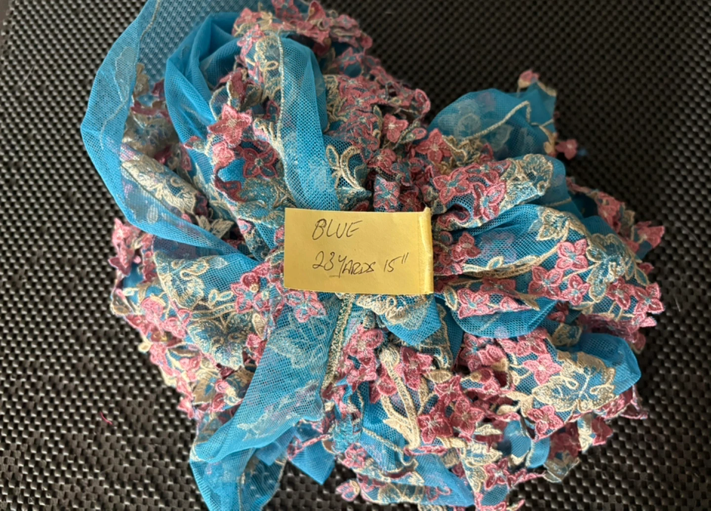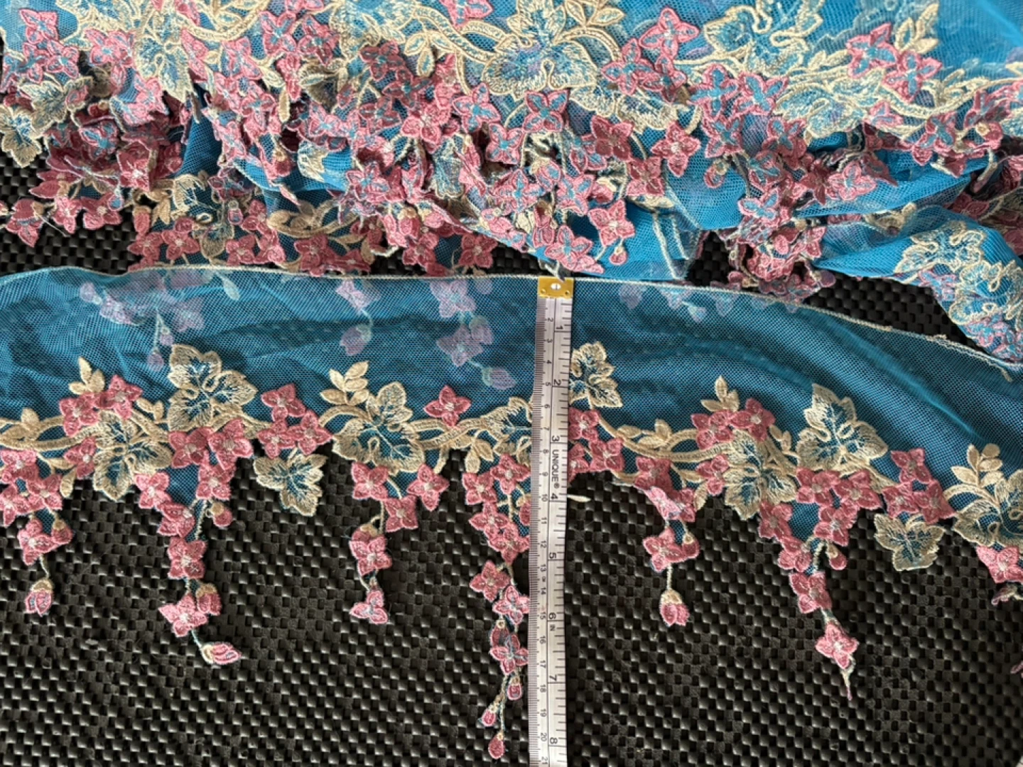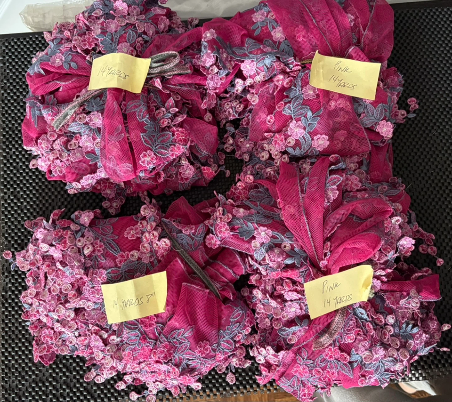 Colourful Netted/ Embroidered Trimmings All new Floral embroidered lace trim with a scalloped, dangling design Colour Pink 14 Yards $80 per bundle Selling as is 4 Bundles Colour Blue 22 Yards 15” $120 Please see pics for measurement Can be used for Dresses & Gowns Lingerie & Nightwear Sarees & Dupattas Skirts & Blouses Veils: Creates an elegant border for bridal veils Headbands or Hair Accessories: Can be sewn onto fabric headbands or clips Home Decor Curtains: As a decorative edge Table Runners & Linens: Adds a sophisticated finish Pillows: Decorative edging Crafts Costume Design: Great for theatrical or dance costumes DIY Projects: Scrapbooking, gift wrapping, or handmade cards Pickup near wonderland or shipping is available