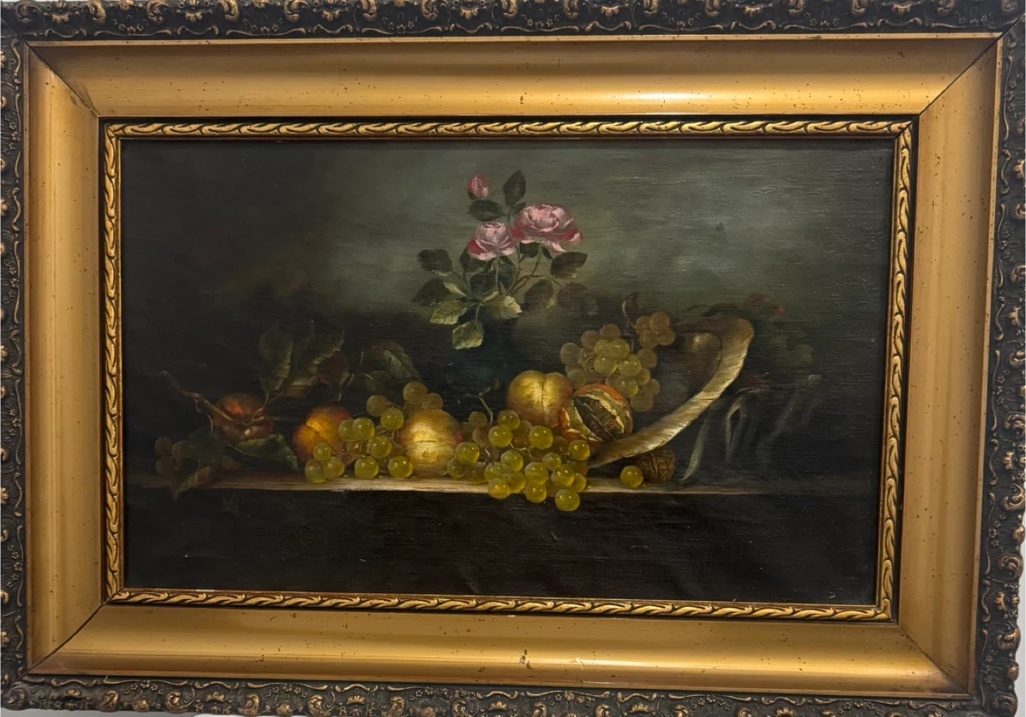 Beautiful vintage still life painting featuring fruit and flowers, framed in an ornate gold-tone frame. A lovely piece to add a touch of classic elegance to your home decor!